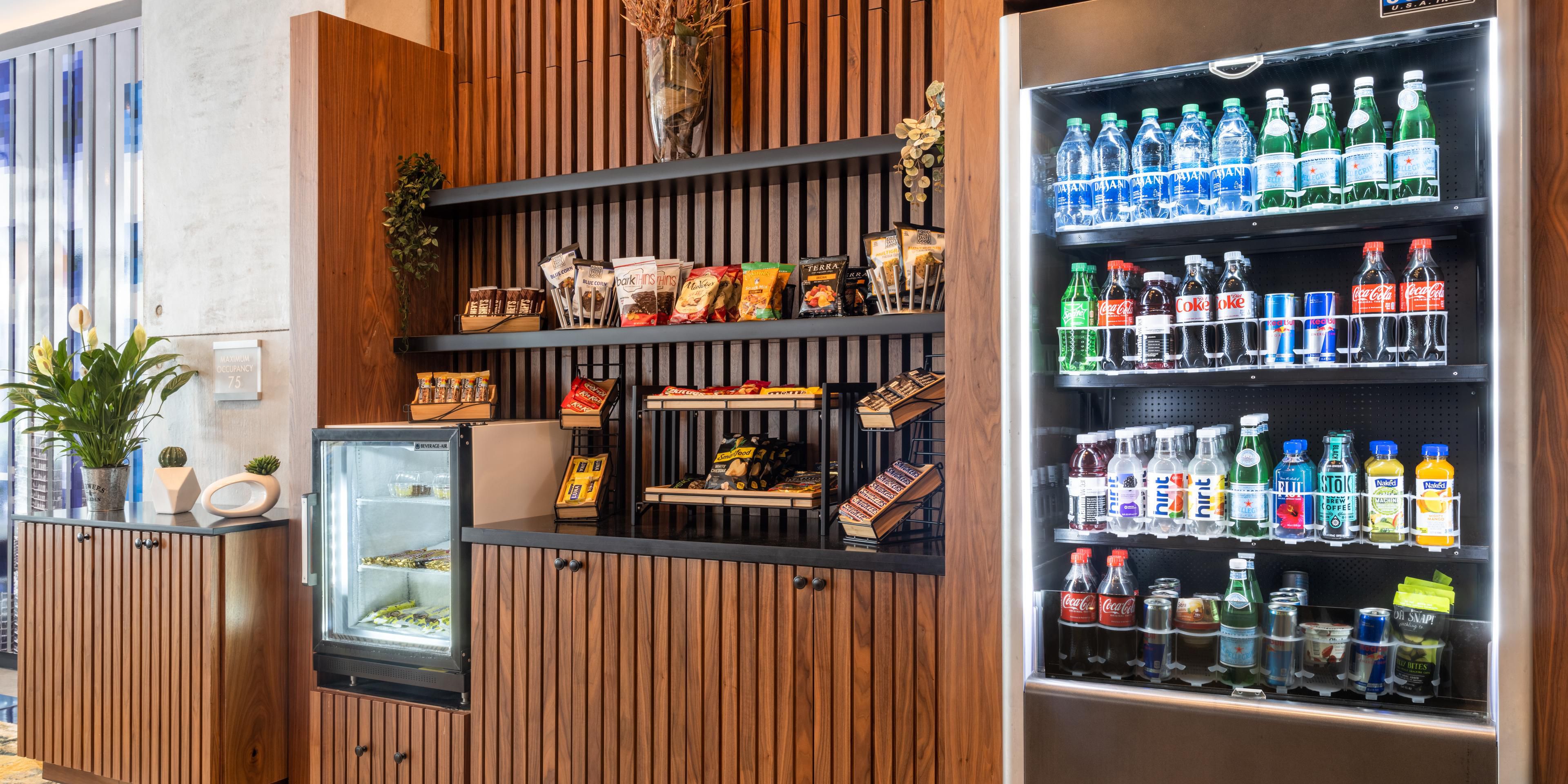 The Market is open 24/7 and offers refreshing cold drinks, a wide selection of snacks, and any necessities you may need i.e. toiletries, medicine etc. It's located on the 1st floor in the Hotel Indigo lobby.