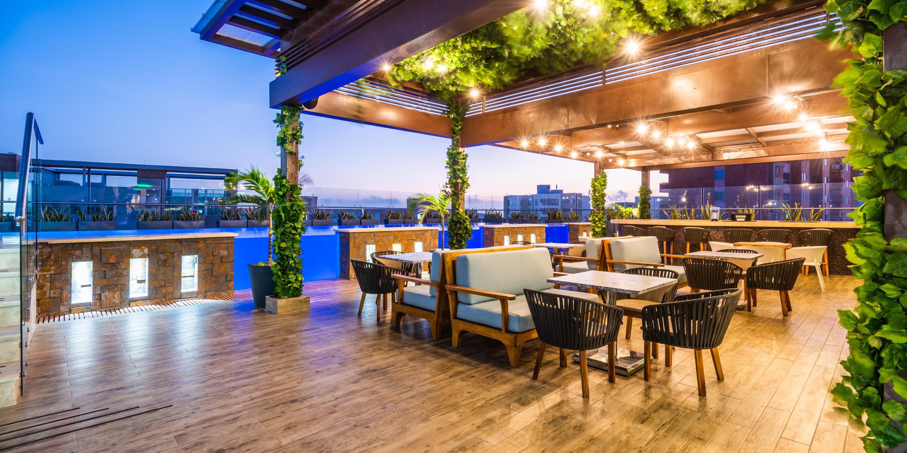 Drinks and cocktails bar located in the Rooftop, next to the pool. Delight yourself with national and international liquors and the best cocktails for a very special moment, enjoying the wonderful view of the city from the hotel´s 13th floor.