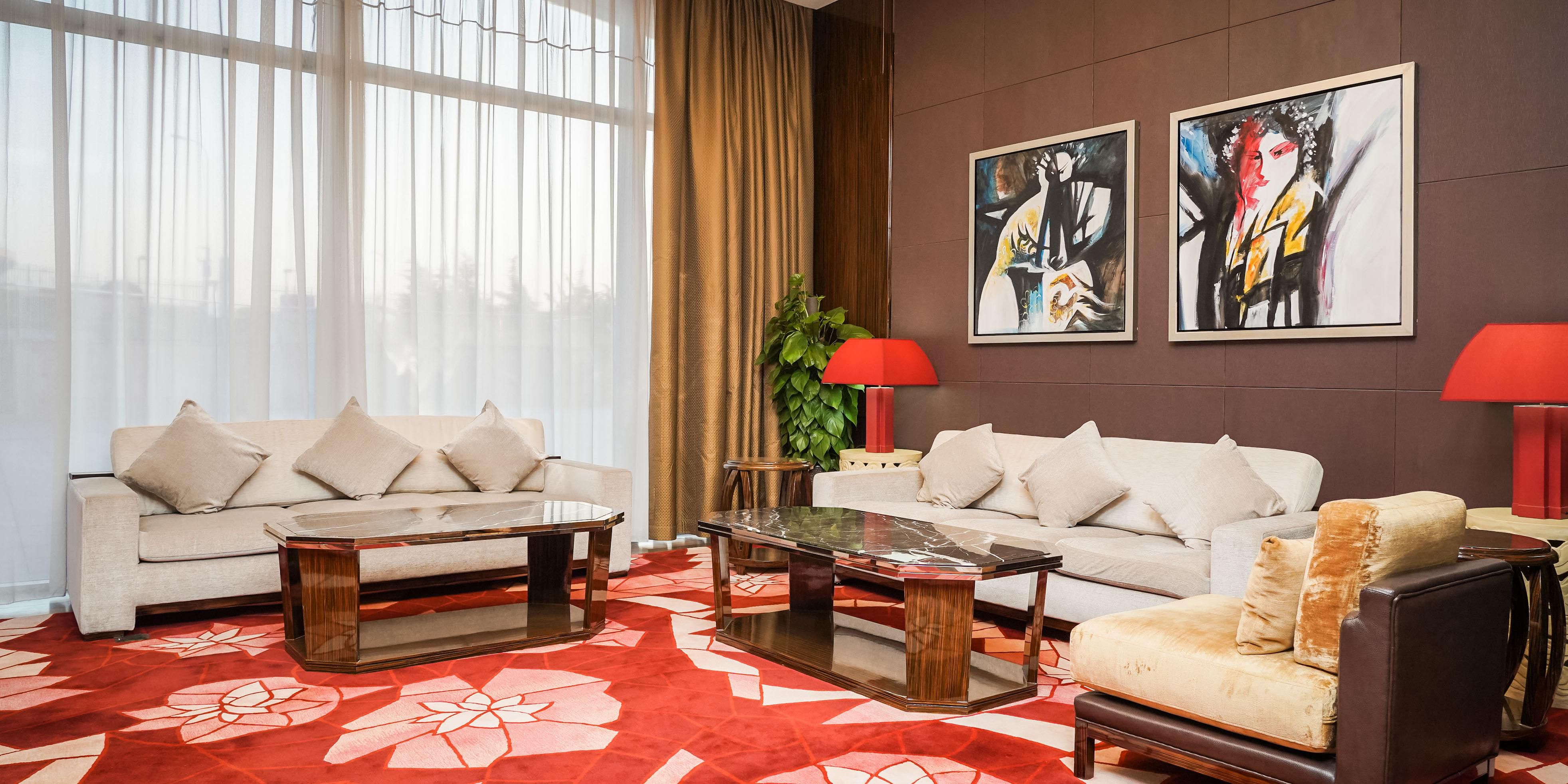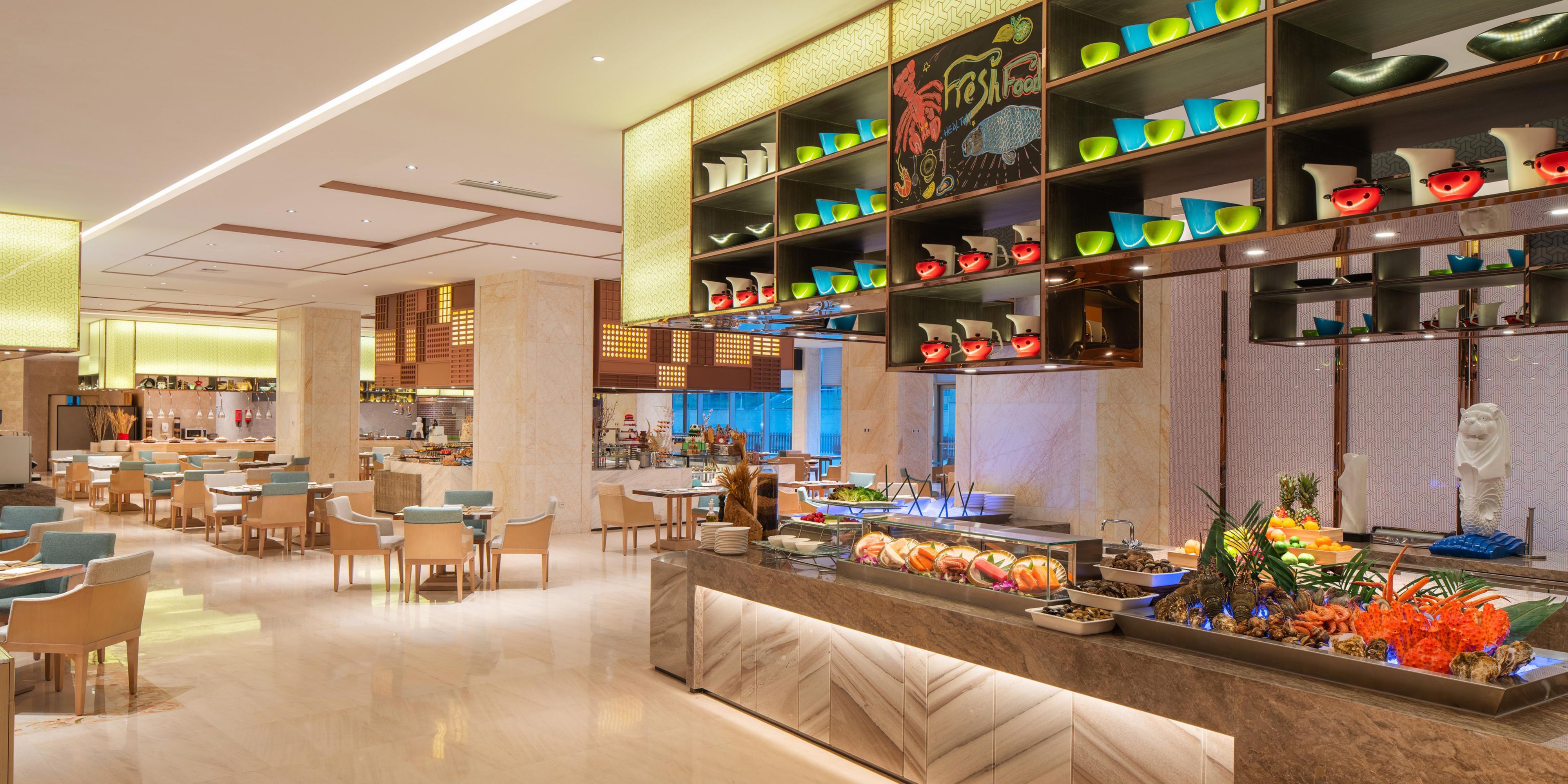 冠军咖啡厅提供国际自助及西餐零点菜单。餐厅使用新鲜的时令食材,细腻的口感搭配极具现代艺术的简洁摆盘,利用视觉及味觉的冲击为您打造立体盛宴。 融合东方情怀和现代韵味的彩丰楼中餐厅主要是为了满足宾客对于高水准商务宴请和家庭聚餐的需求。彩丰楼的灵感来源于中国千年之久的爱鸟情怀,色彩丰富,设计风格低调、内敛,彩丰楼以“彩丰十味”菜单,纳中国天南海北菜系之长,融酸甜苦辣咸,鲜香麻酥脆十种不同风味。 在精致典雅的大堂酒廊,您可休憩片刻,放松身心;也可以在这里会客,伴着音乐小酌。