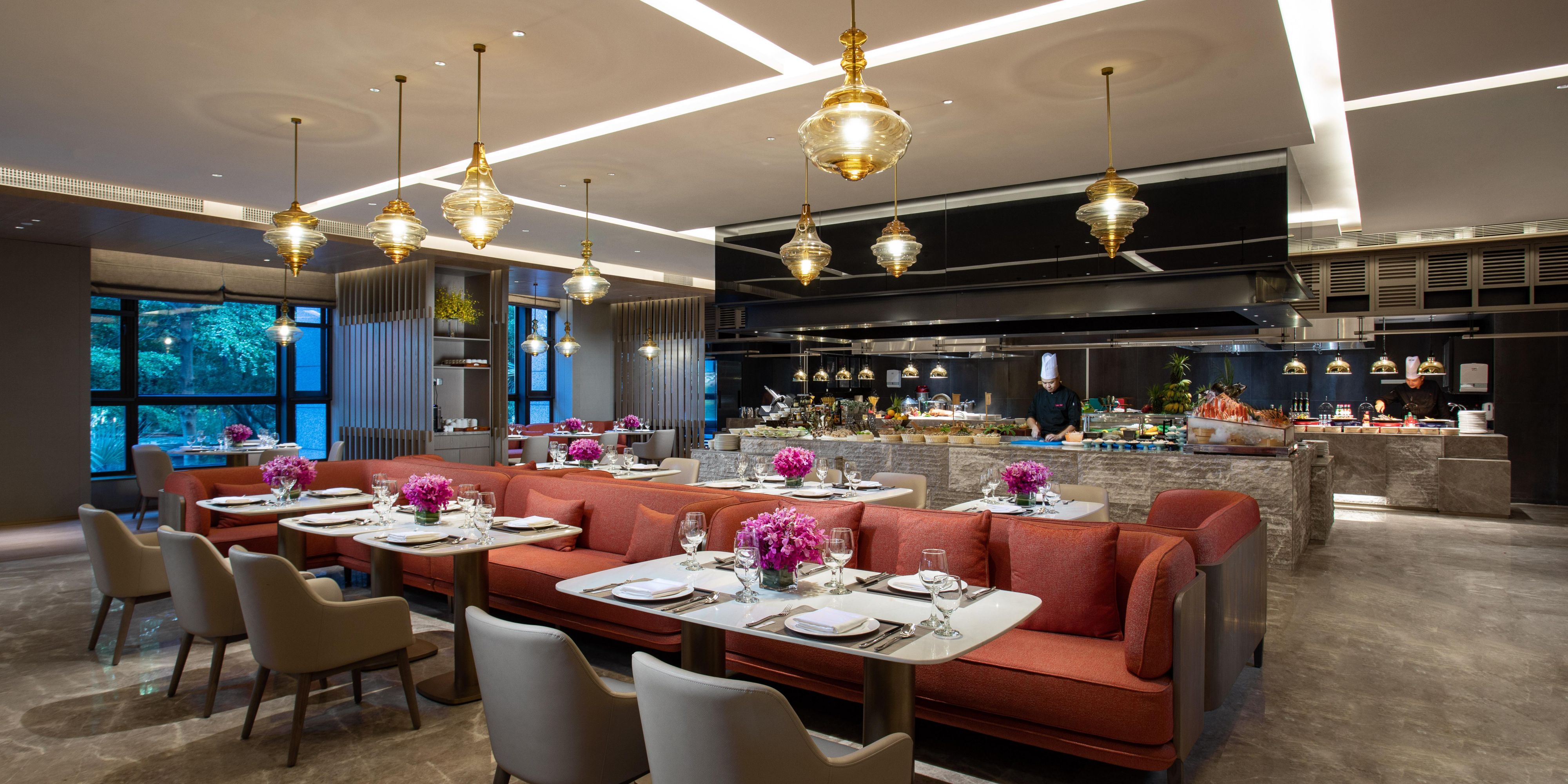 名厨汇全日餐厅提供品种繁多、新鲜且富有营养的全球经典菜系,更有动作娴熟的大厨现场演绎美食缔造过程,将安全无污染的食材以创新的方式呈现于您面前,让您尽情品享蕴含国际美食文化的饕餮盛宴。