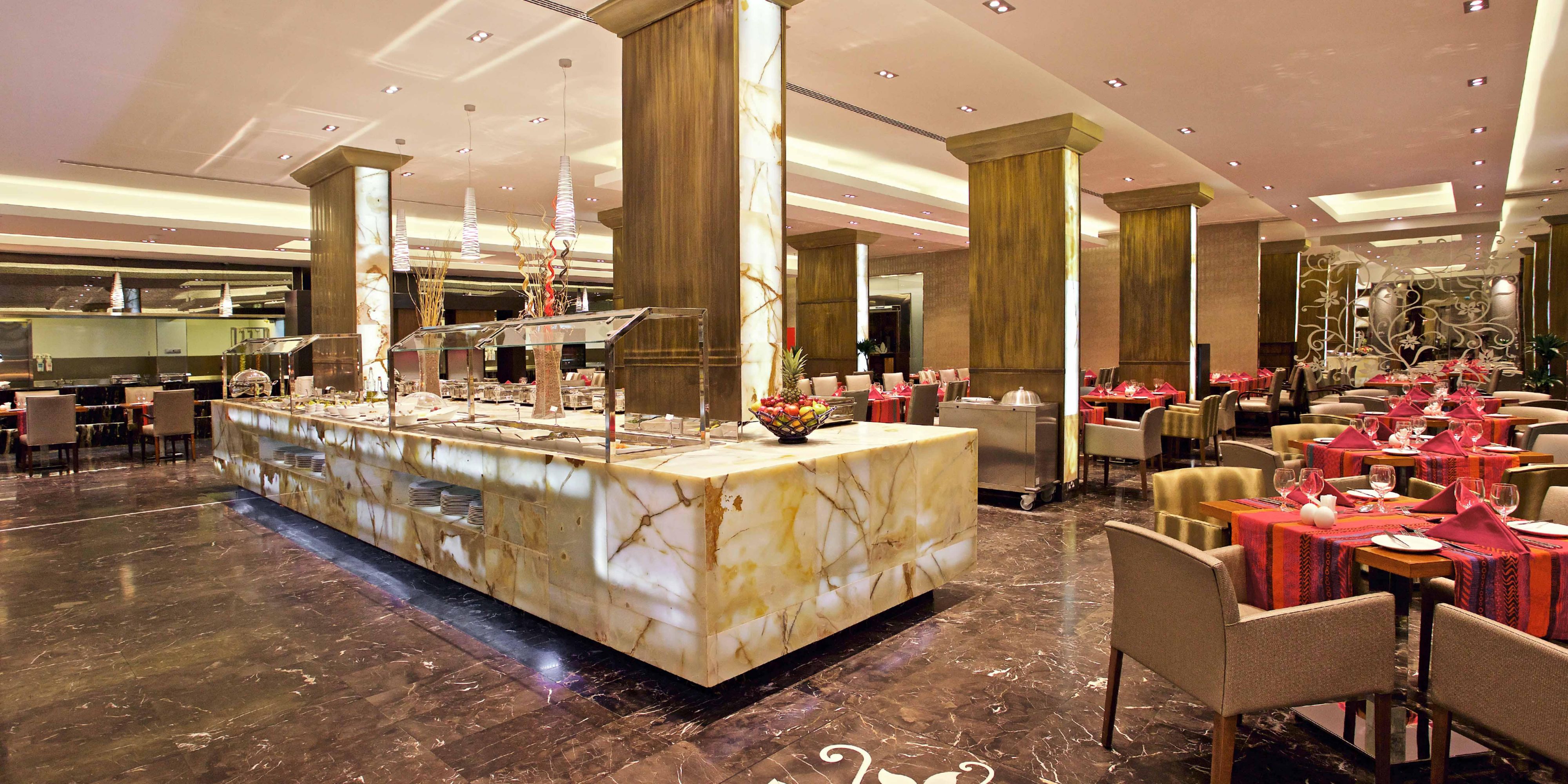 Step into a beautifully designed space with refined décor, interactive live cooking stations, and a private entrance that sets the tone for an elevated all day dining experience, complemented by an a la carte menu. Recognised as one of the best restaurants in Jeddah, you can enjoy a globally inspired culinary journey. Savour an international spread in the afternoon, then indulge in themed dinner buffets featuring Mediterranean favourites, fresh seafood, and flavourful Italian classics.