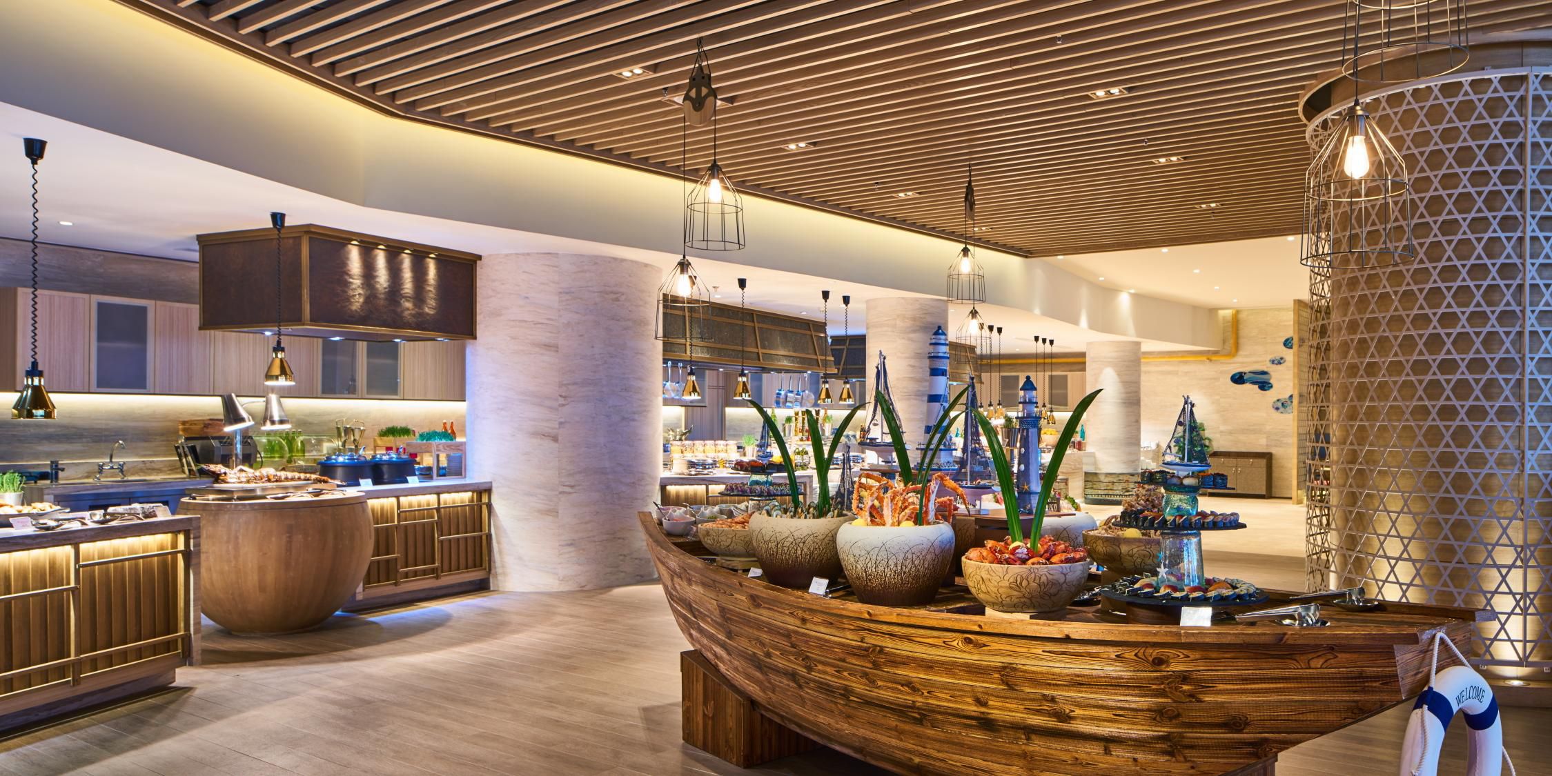 拥有室外海景平台的海逸全日餐厅,供应石浦鲜活海产自助餐、西式和亚洲特色零点菜单,以及口味纯正香浓的美国冰淇淋。在阵阵海风中,感受美味在唇齿间流转,自有一番美妙体验。餐厅还贴心设有儿童就餐及游戏区,为家庭用餐营造更加轻松温馨的氛围。