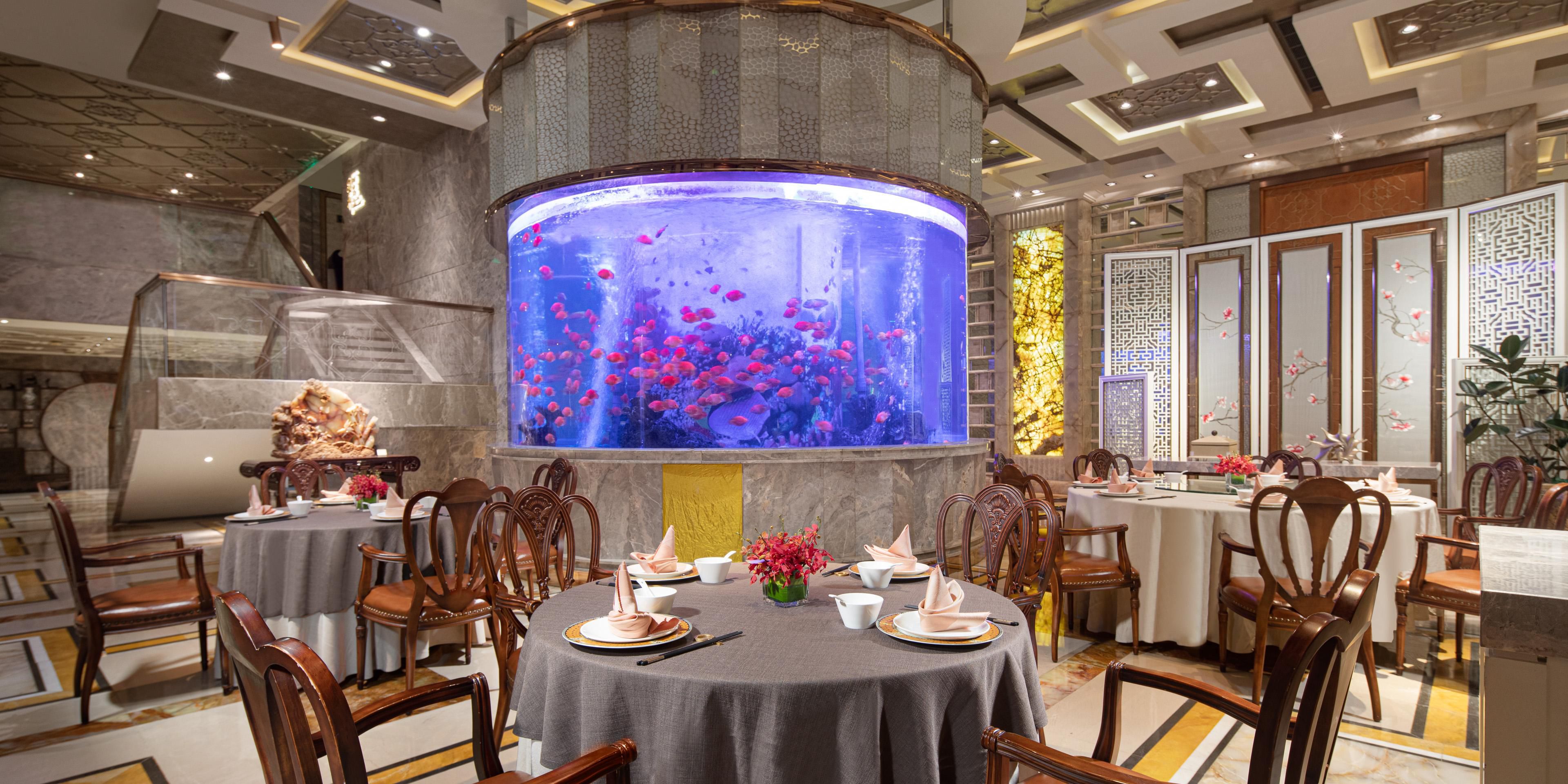 以晶莹华丽的玉石装饰的丽晶轩中餐厅,不仅尽显玉石文化的精髓和中西室内装饰的合璧,雍容华贵,而且,由厨师精英团队巧手制作的精美粤菜、川菜、淮扬菜和本帮菜,堪称沪上海派佳肴的典范。另设有可容纳4-16位用餐的大小包房共10间,供商务宴请、亲朋聚会随意选择。