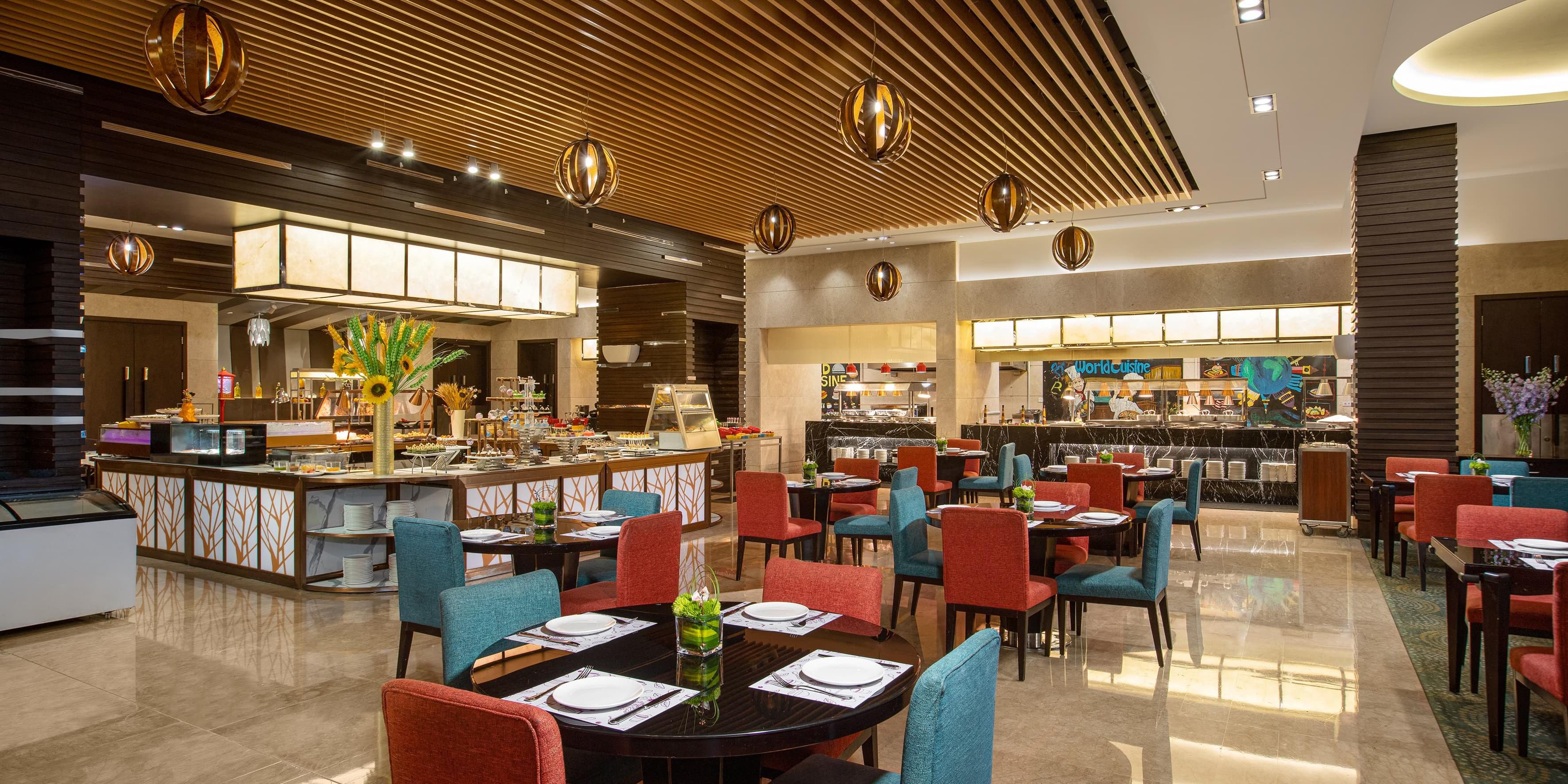 皇冠咖啡厅全新打造的全天候餐饮空间开启别样的环球美食体验。活力十足的厨师们现场烹饪荟萃中外的国际美食,让各路食客尽情享受美食的乐趣。