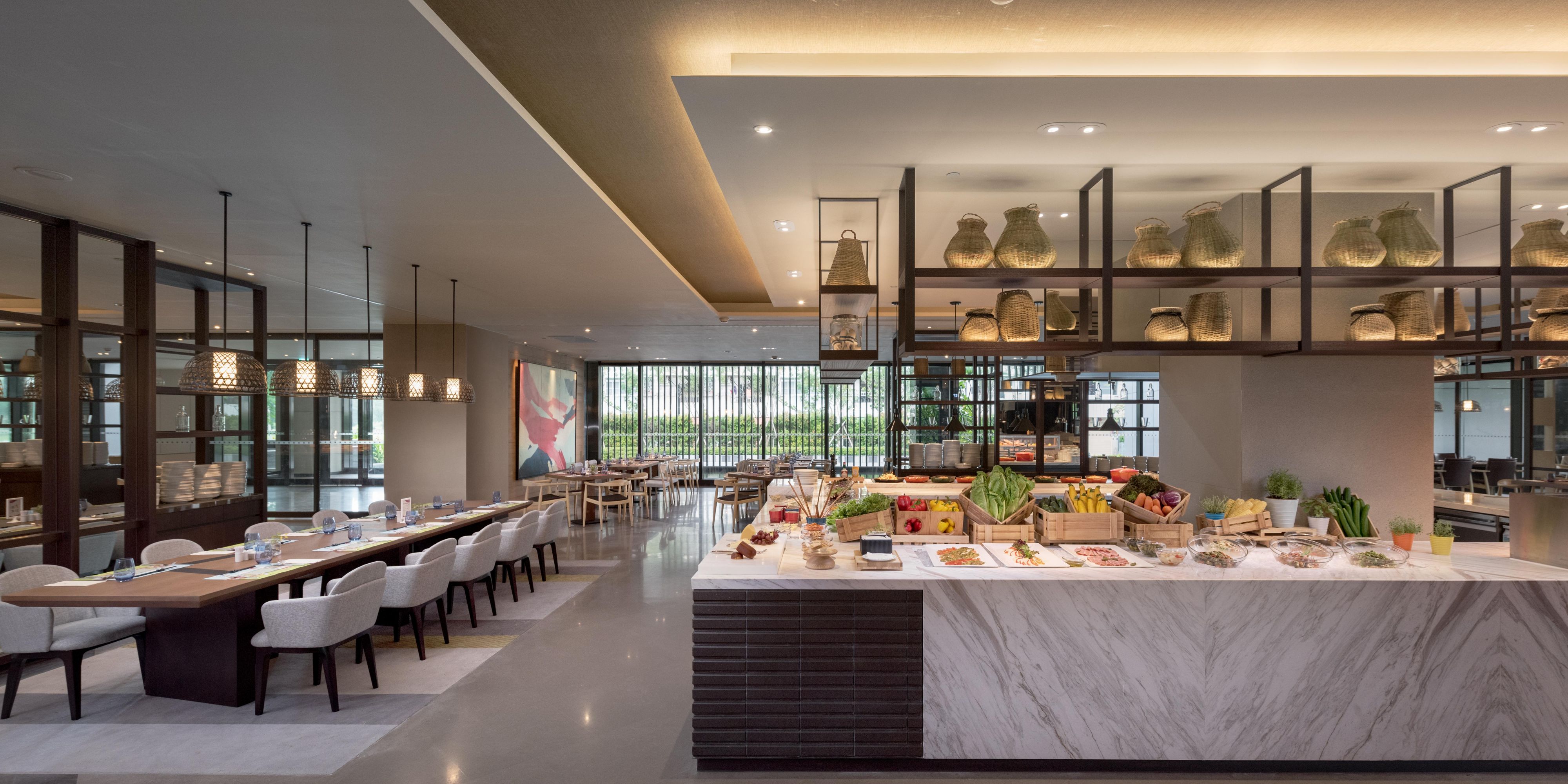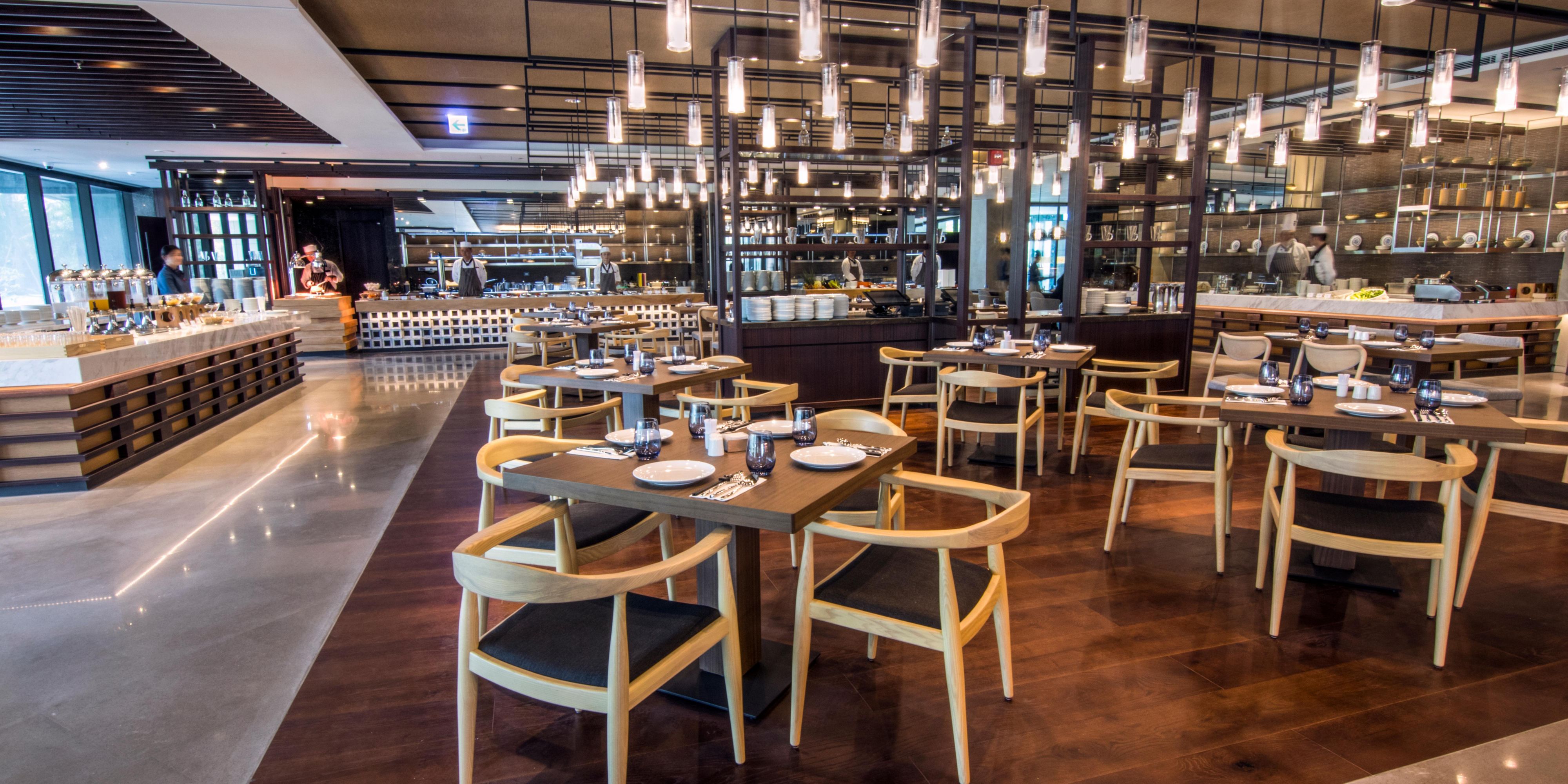 全日餐厅位于酒店1楼,211座位数,开放式厨房、现做菜品菜色精致多样,上百道中西式佳肴自助餐点,任您尝味。结合时尚与摩登的用餐空间,让人一进来就徜徉在轻松舒适的氛围当中。