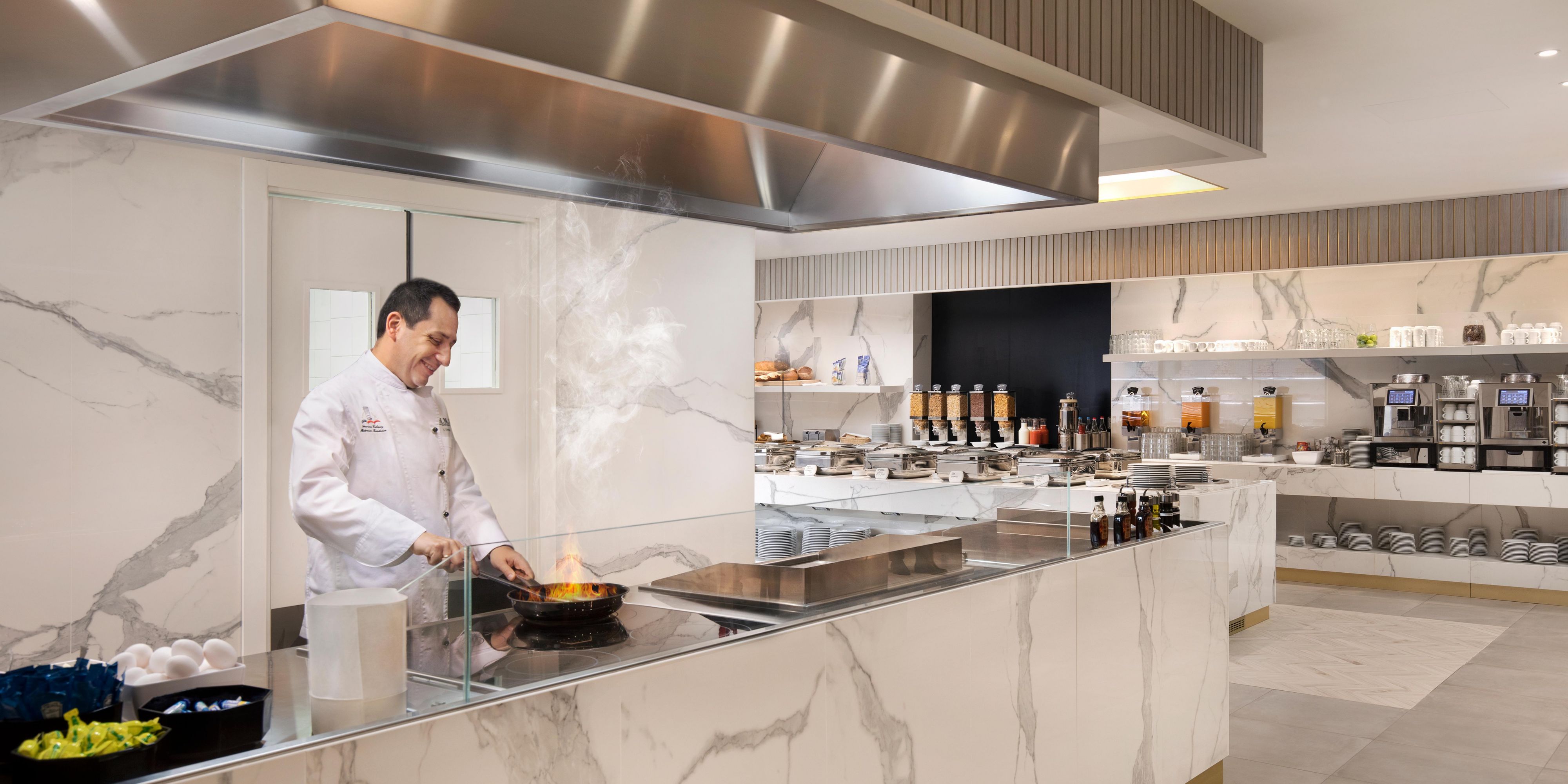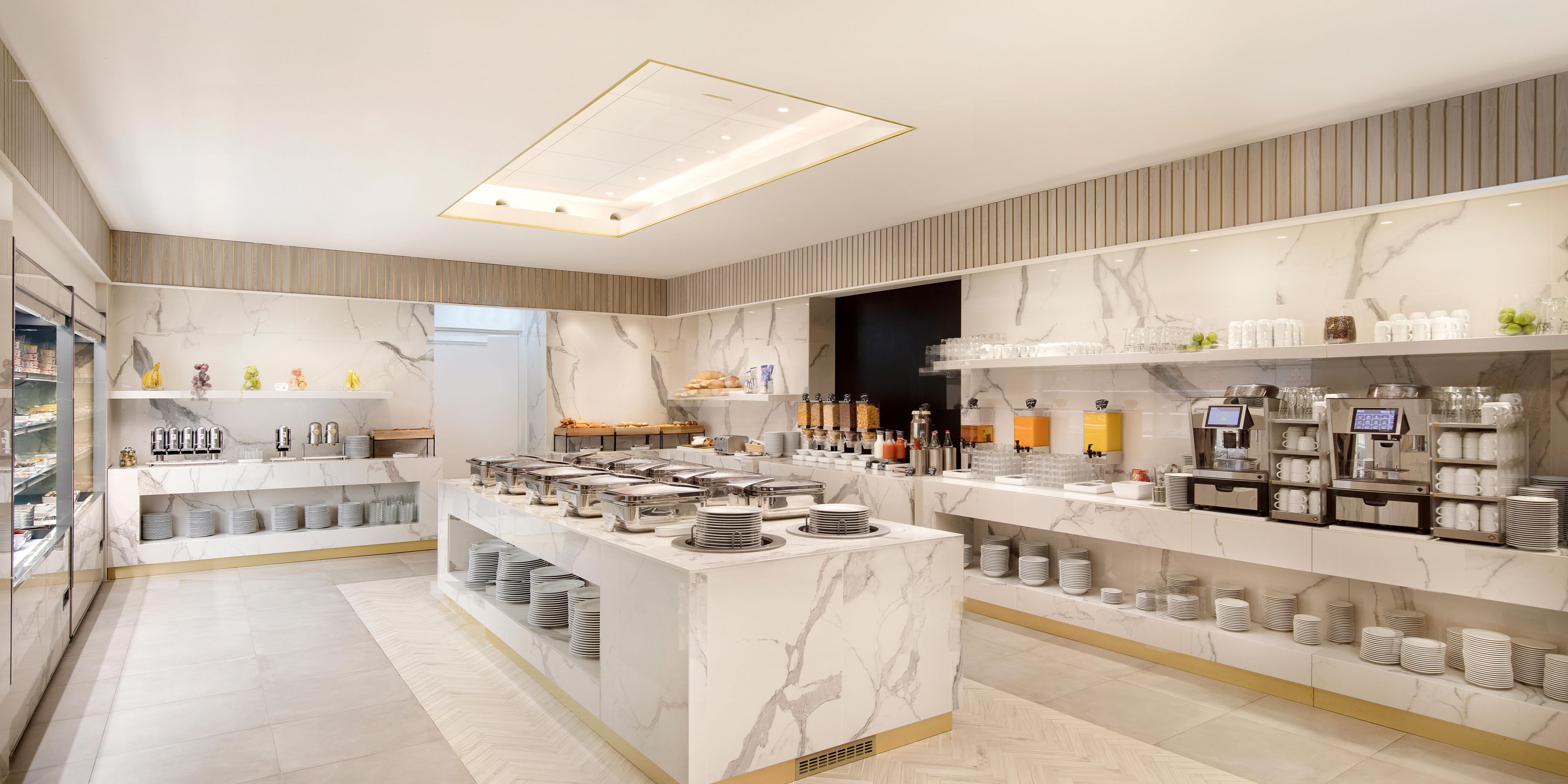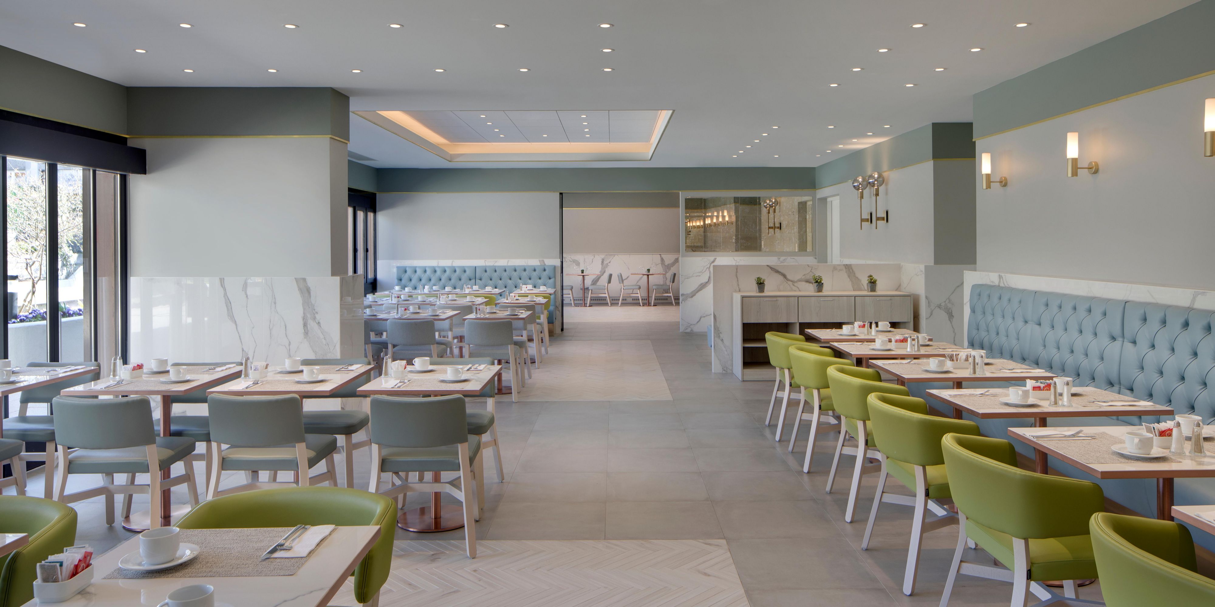 Restaurant West and Garden Terrace offer a delectable breakfast buffet featuring hot and cold options, a live omelette station, juices, aromatic coffee, a tempting selection of pastries, fresh fruit, and savoury meats.