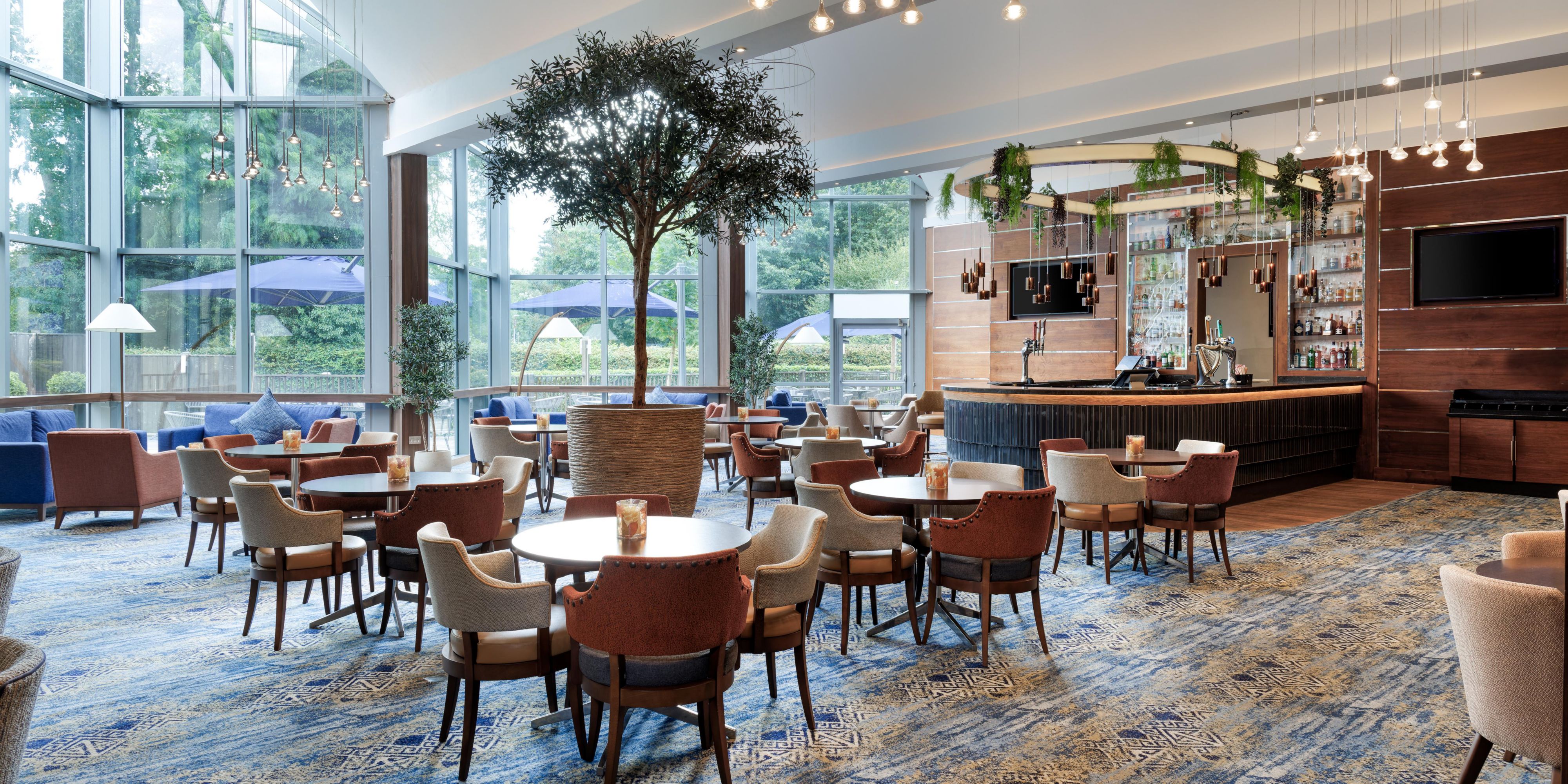 The Olive Grove offers a relaxing space to unwind, stay updated with the latest news, enjoy Sky Sports on large flat-screen TVs, or host casual meetings. Our outdoor heated terrace is ideal for socialising. We serve a variety of wines, international beers, spirits, and tempting cocktails. The extensive menu includes a range of informal dishes, including traditional favourites, available all day. Plus, you can enjoy a Starbucks Coffee to complete your experience.