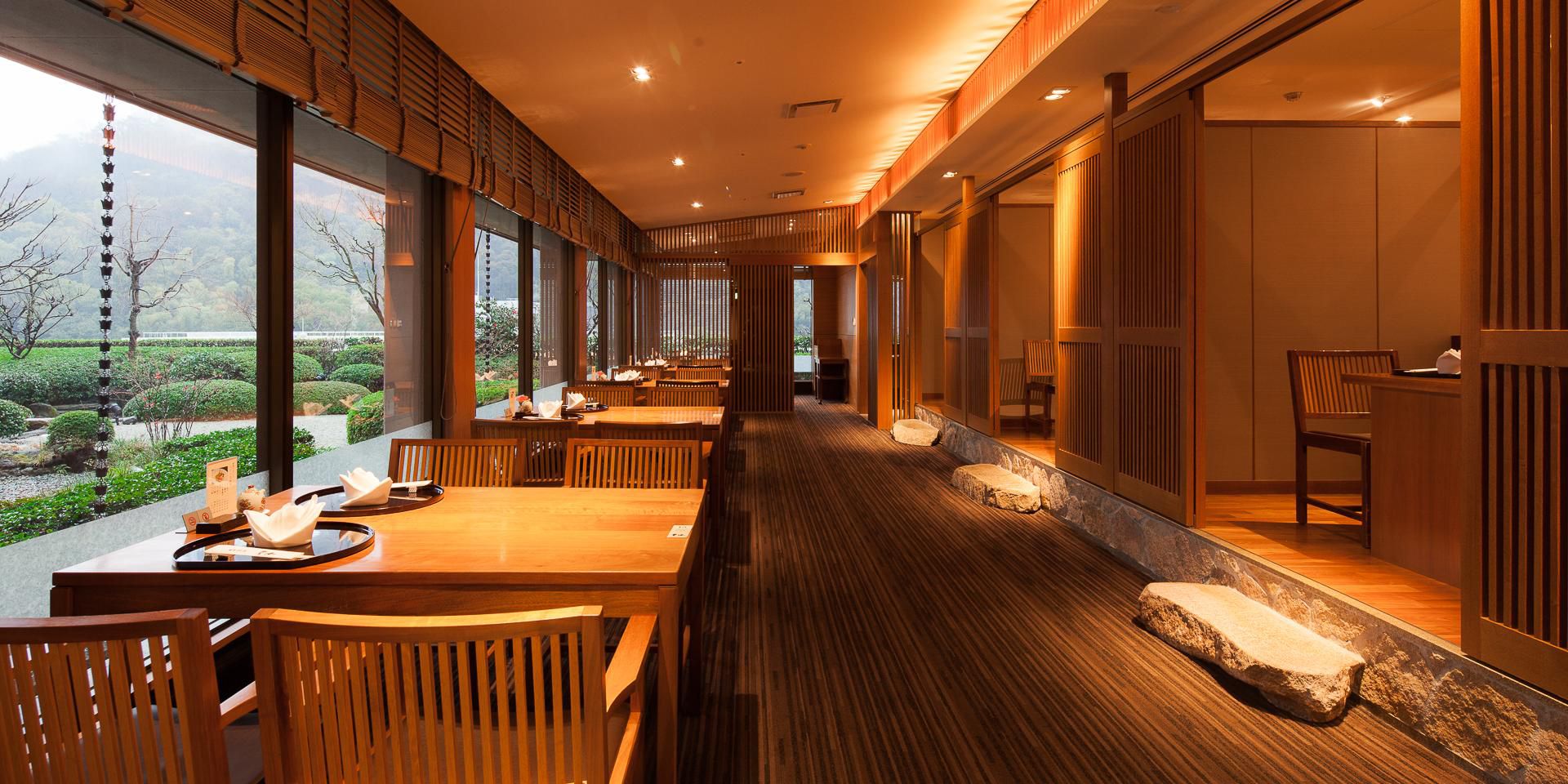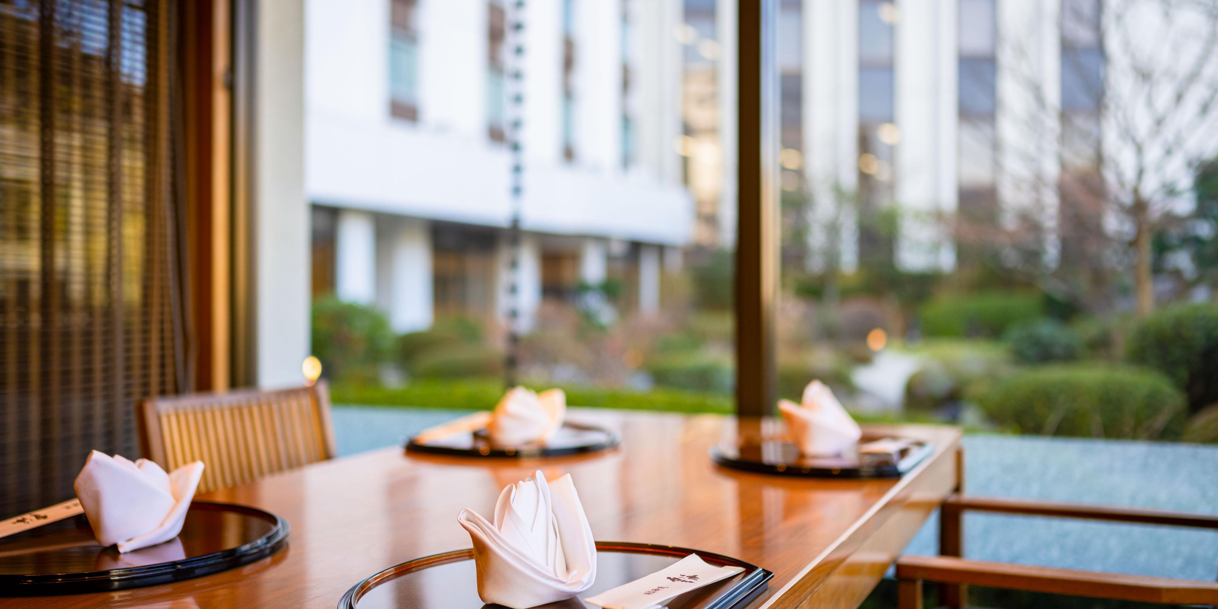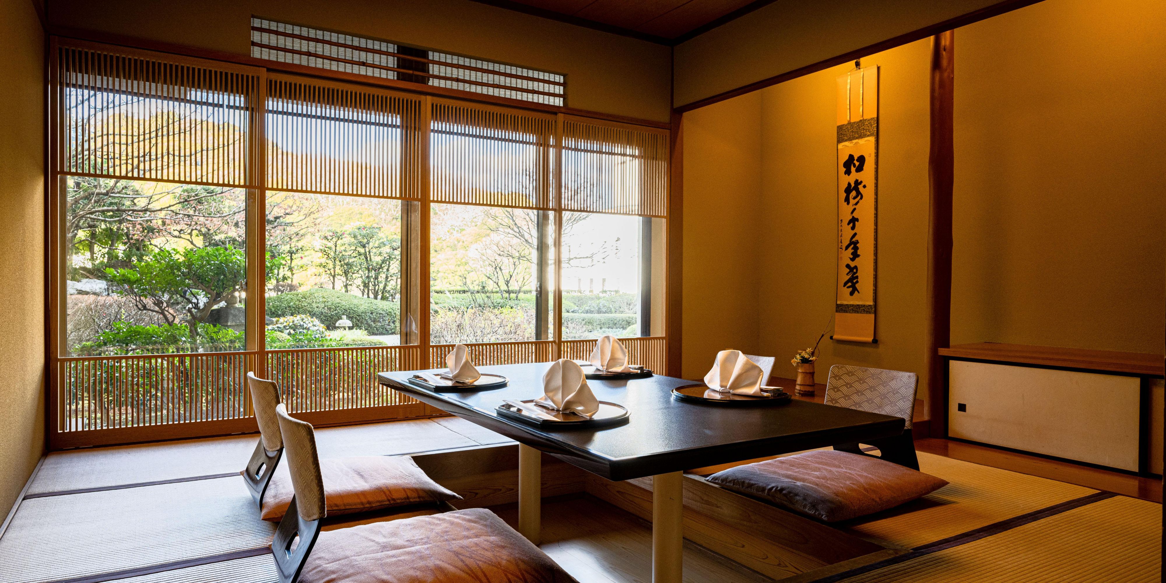 Enjoy Japanese cuisine prepared with fresh seafood from the Seto Inland Sea and seasonal ingredients, while viewing a beautiful Japanese garden.