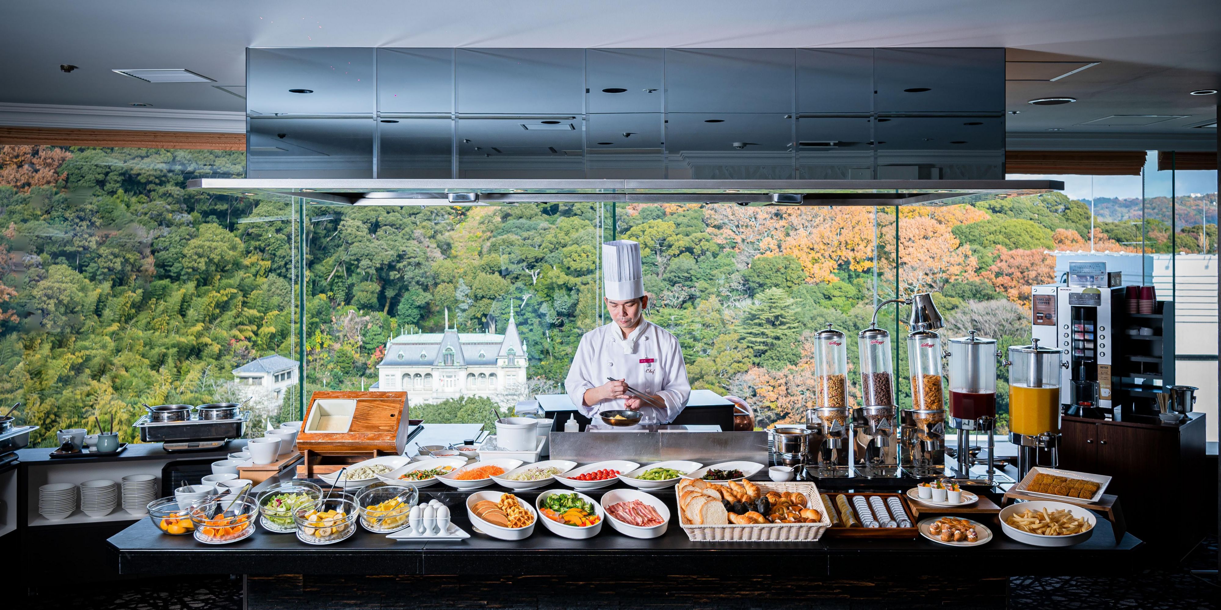 Savor food specially prepared by the chef for the buffet, while viewing the scenery from the top floor of our hotel. Enjoy an open atmosphere in a casual setting in this spacious restaurant.