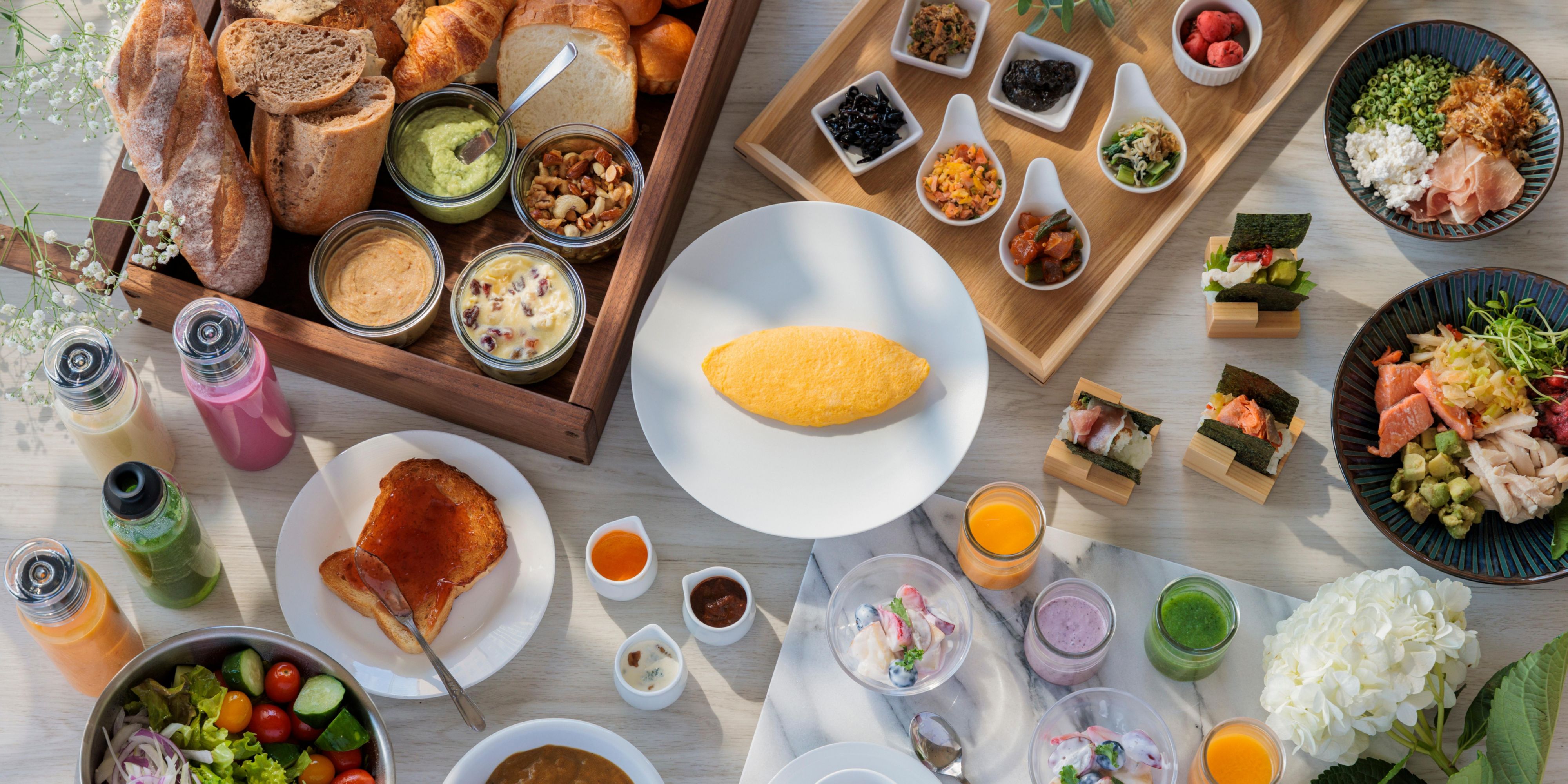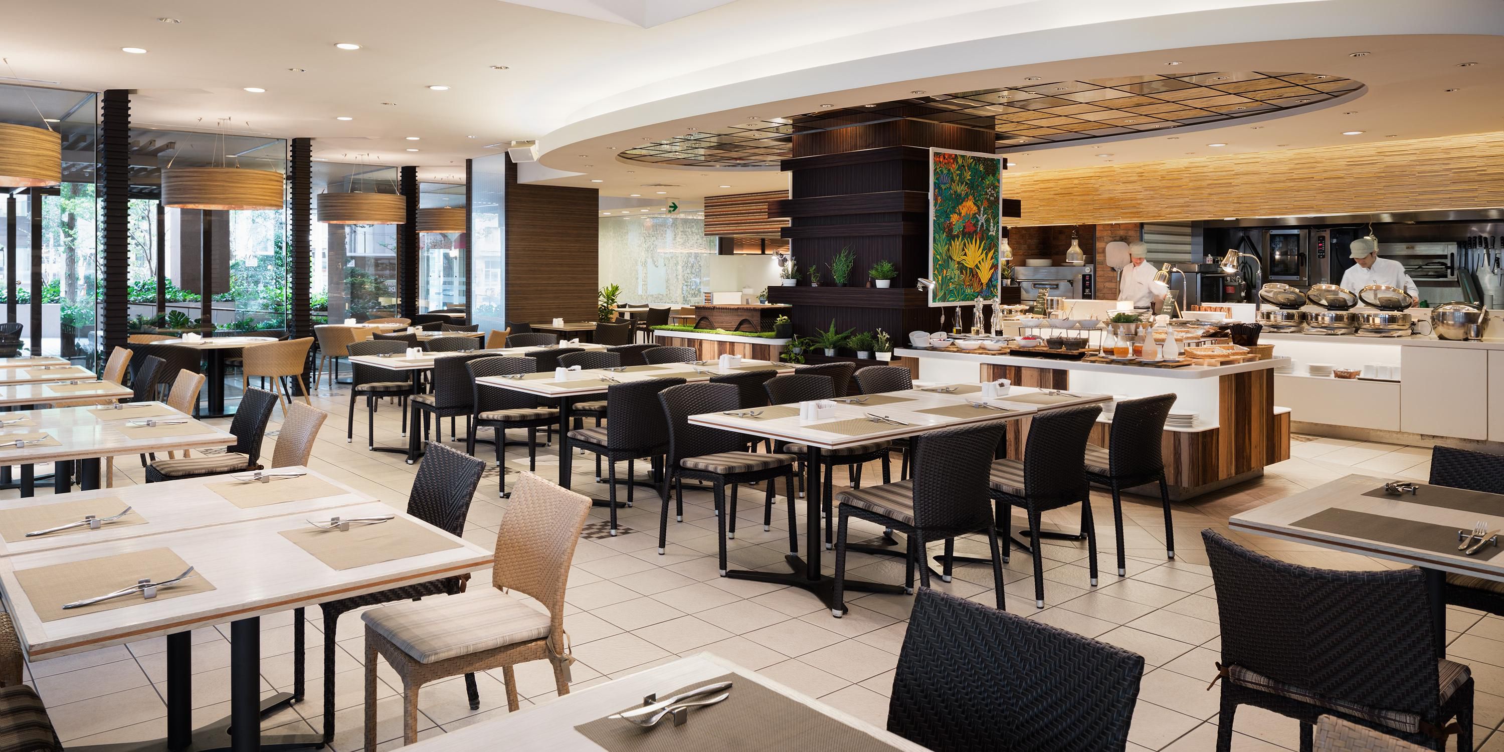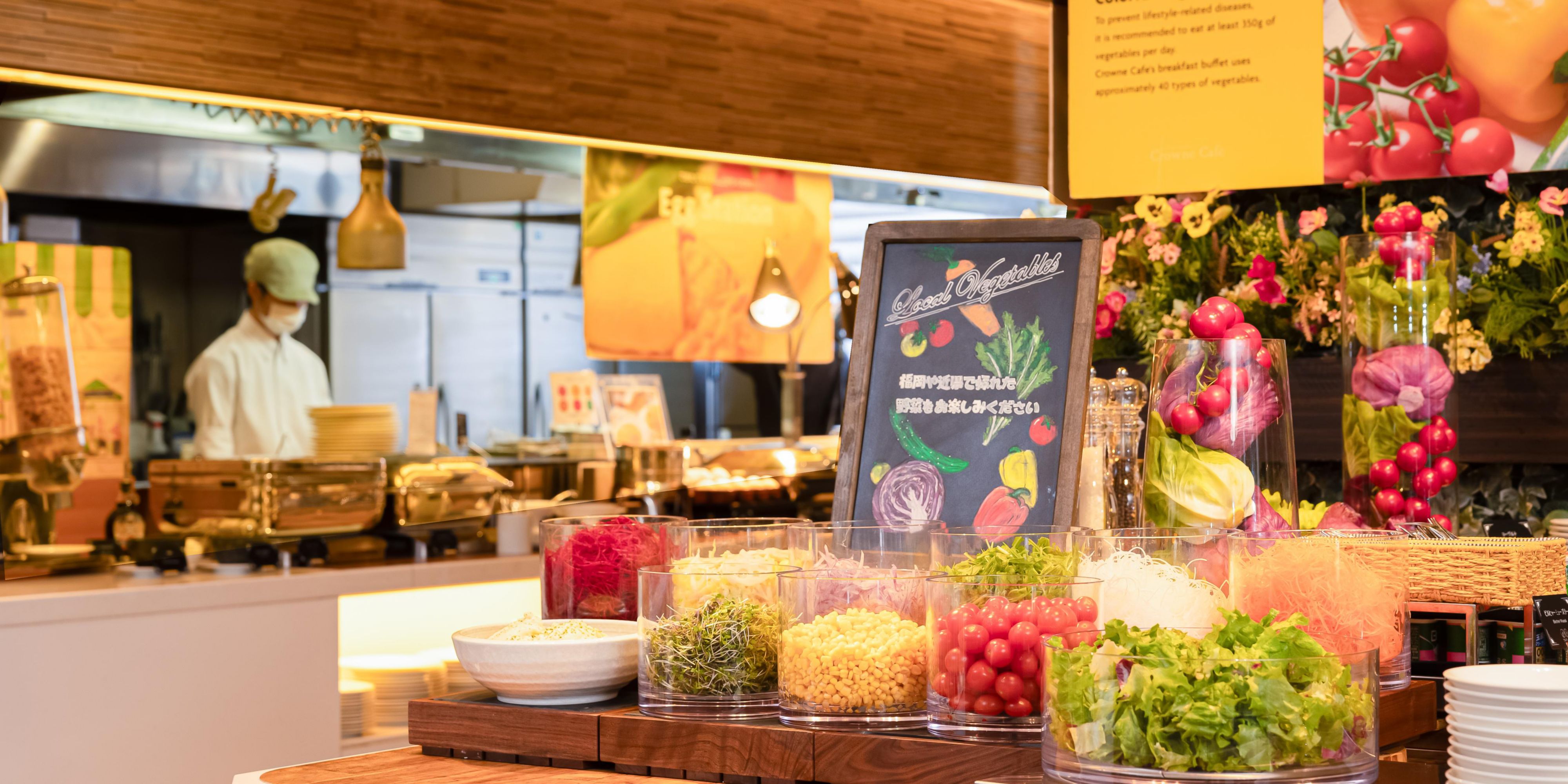 Crowne Café is popular with Fukuoka locals and visitors alike. Located on the 1st floor, it features a large buffet that transforms with the seasons and to reflect the time of day. Featuring a lively open kitchen and a spacious dining area, up to 30 dishes are always ready to be enjoyed for lunch or dinner. The menu is varied but always features a combination of local favorites as well as inspiration from further afield. On the weekends, the dessert buffet is always a crowd pleaser.