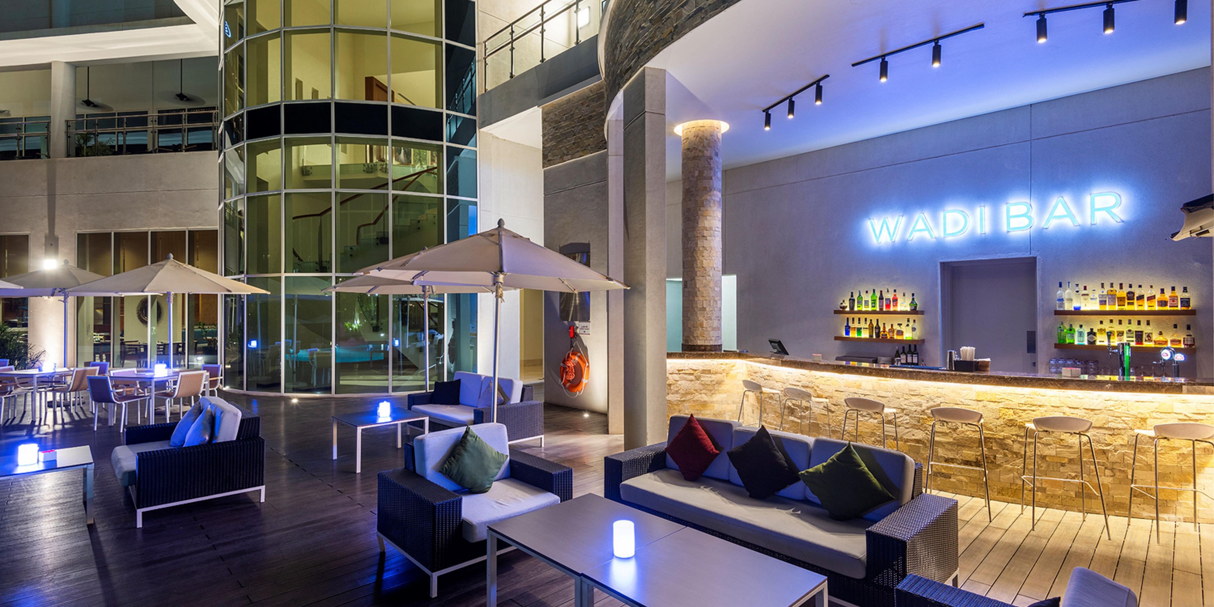 Renowned for its tranquil ambiance, our pool bar offers the perfect setting to add the finishing touches to your presentation while savoring a glass of wine and indulging in a puff of sheesha. Take a refreshing dip in the pool and bask in the sun on our comfortable sunbeds, making Wadi Bar the ultimate destination for relaxation and leisure.