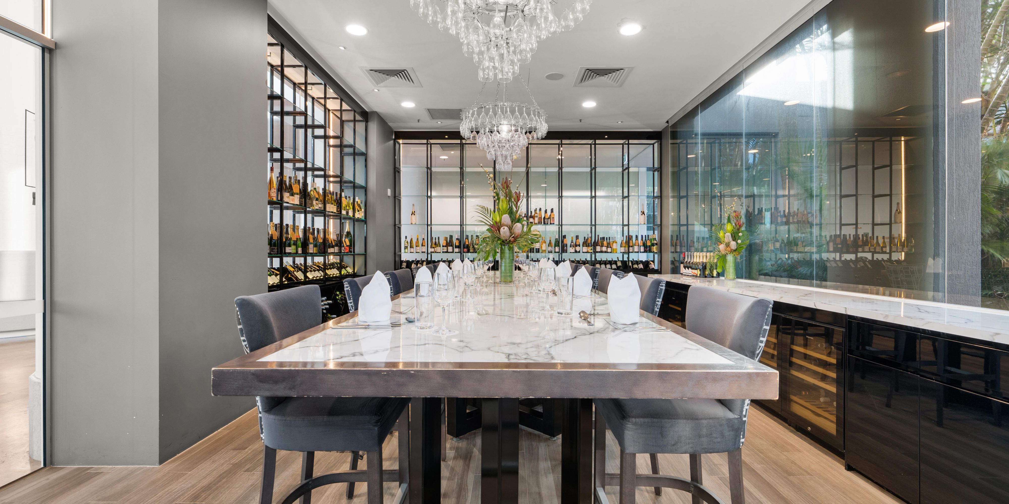 Balthazar an elegant private dining room can be reserved for special occasions and intimate dinner parties. Inspired by a cellar to table design, Indulge on a refined degustation menu savouring wine from the finest regions.