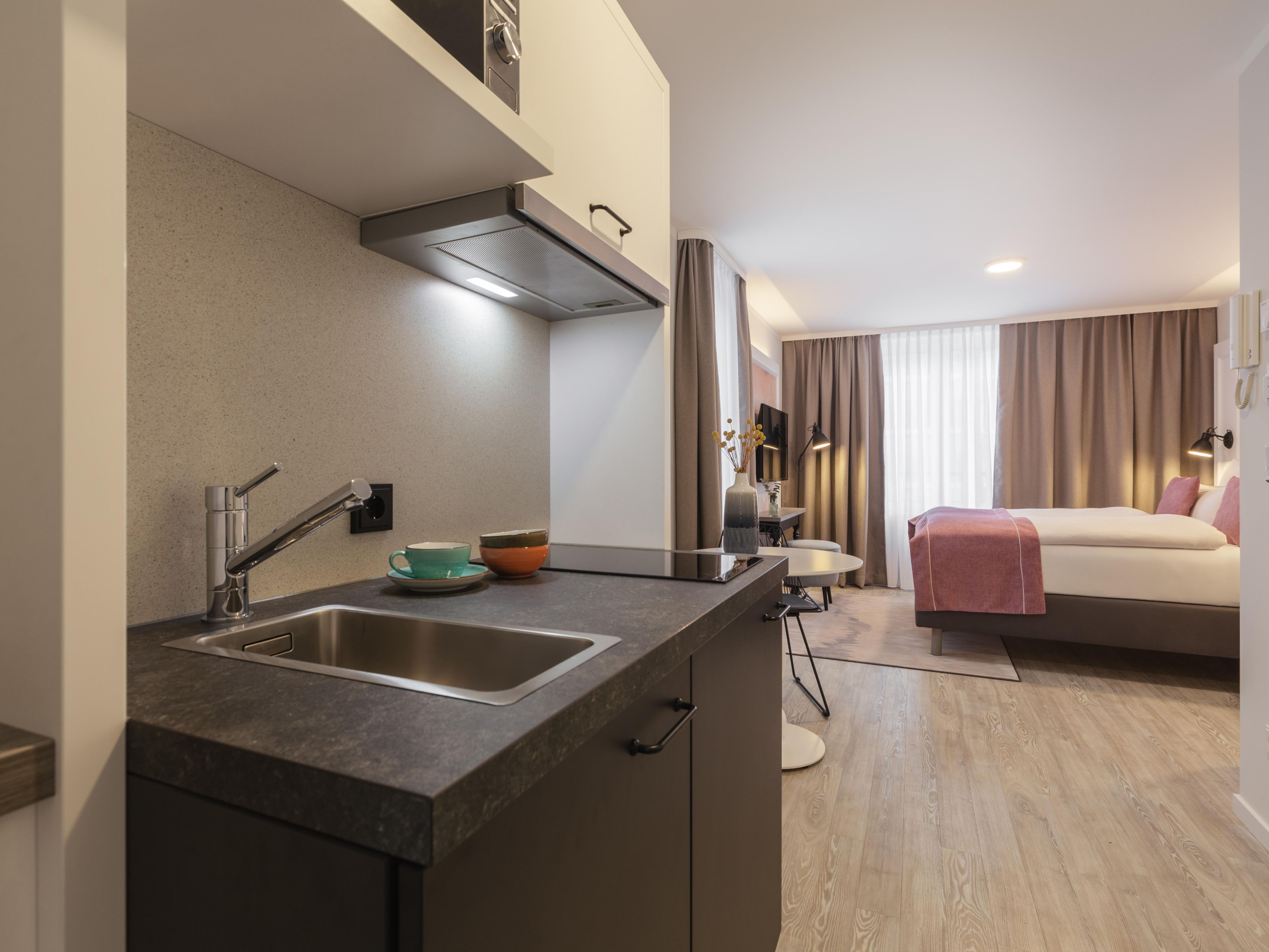 In our hotel, you can expect 100 cozy rooms, including 32 rooms with a kitchenette, and most of these with a balcony. All rooms have modern furnishings in a warm design with a relaxed feel-good atmosphere, where you can leave the hustle and bustle of the capital behind. Our hotel rooms offer amenities such as free high-speed WiFi, smart TV and a comfortable box-spring bed.