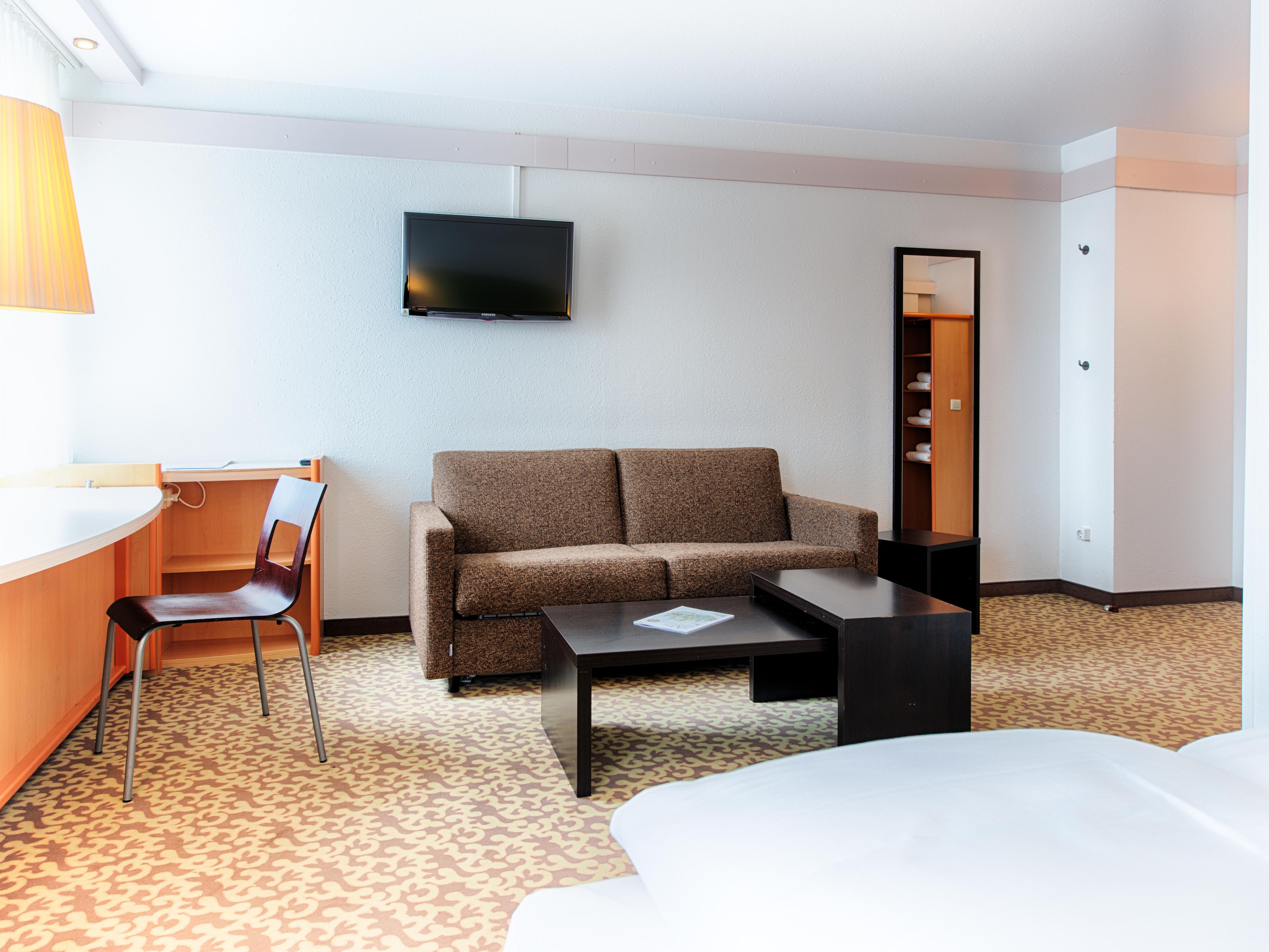 Our 96 bright and comfortable rooms are designed to make you feel at home, whether you're travelling solo or as a pair. Choose between single or double beds and enjoy modern amenities including a flat-screen TV, a dedicated workspace, and free high-speed WiFi, available throughout the hotel. Need a baby crib? Just let us know. Each morning, start your day with a varied and hearty breakfast buffet, and in the evening, wind down with a freshly poured beer or cocktail at the Sky Sportsbar. During summer, our spacious sun terrace with seating for up to 50 guests invites you to relax outdoors.