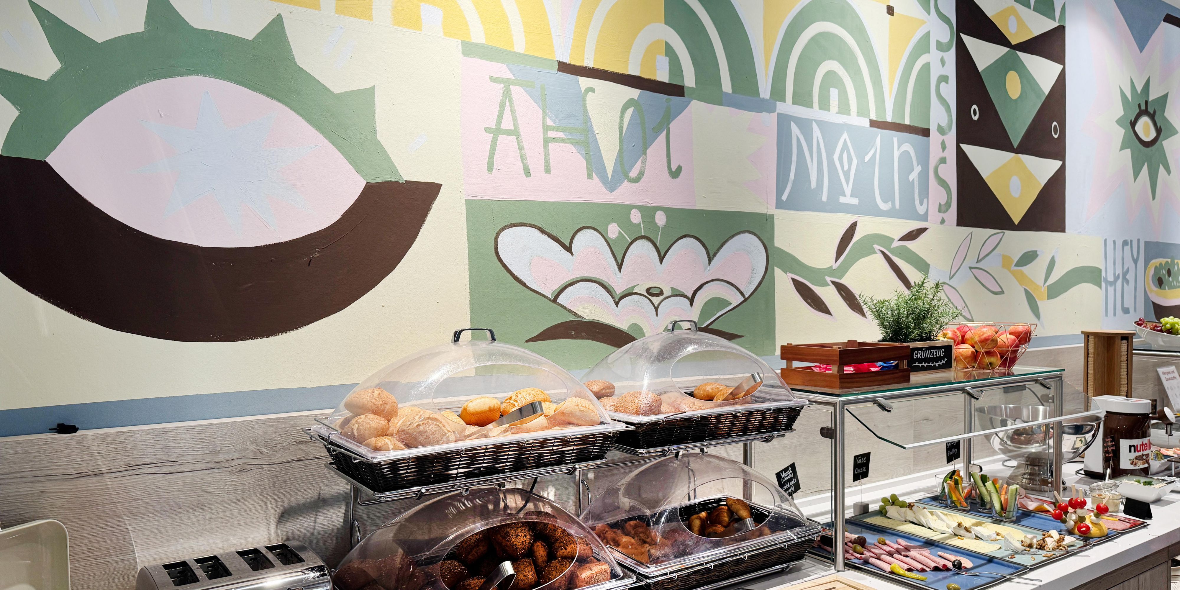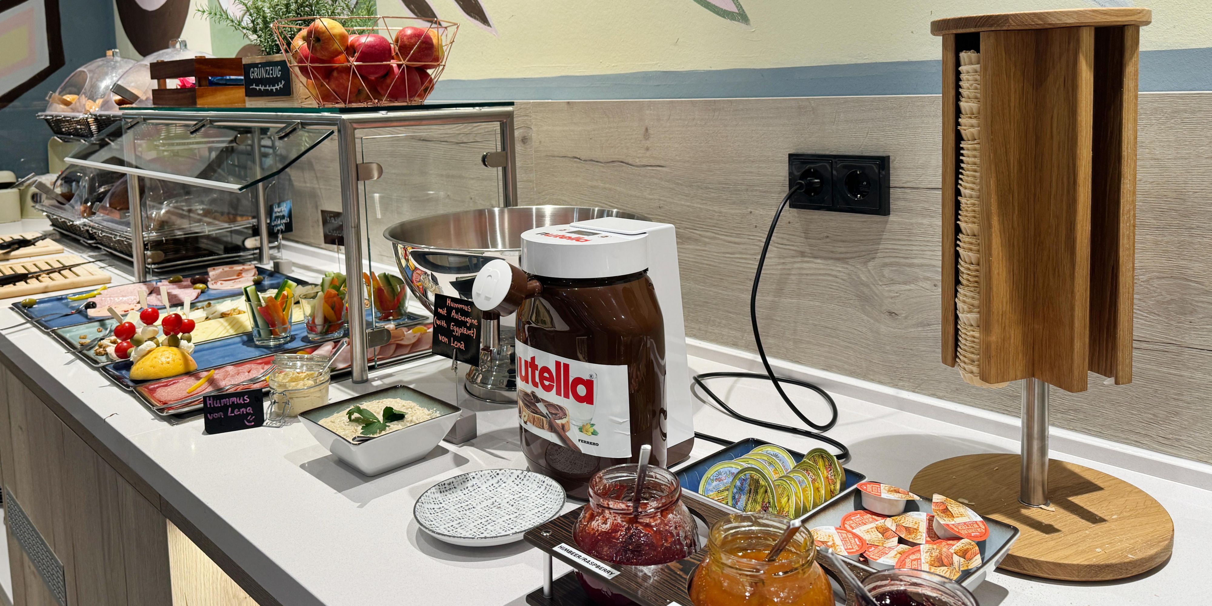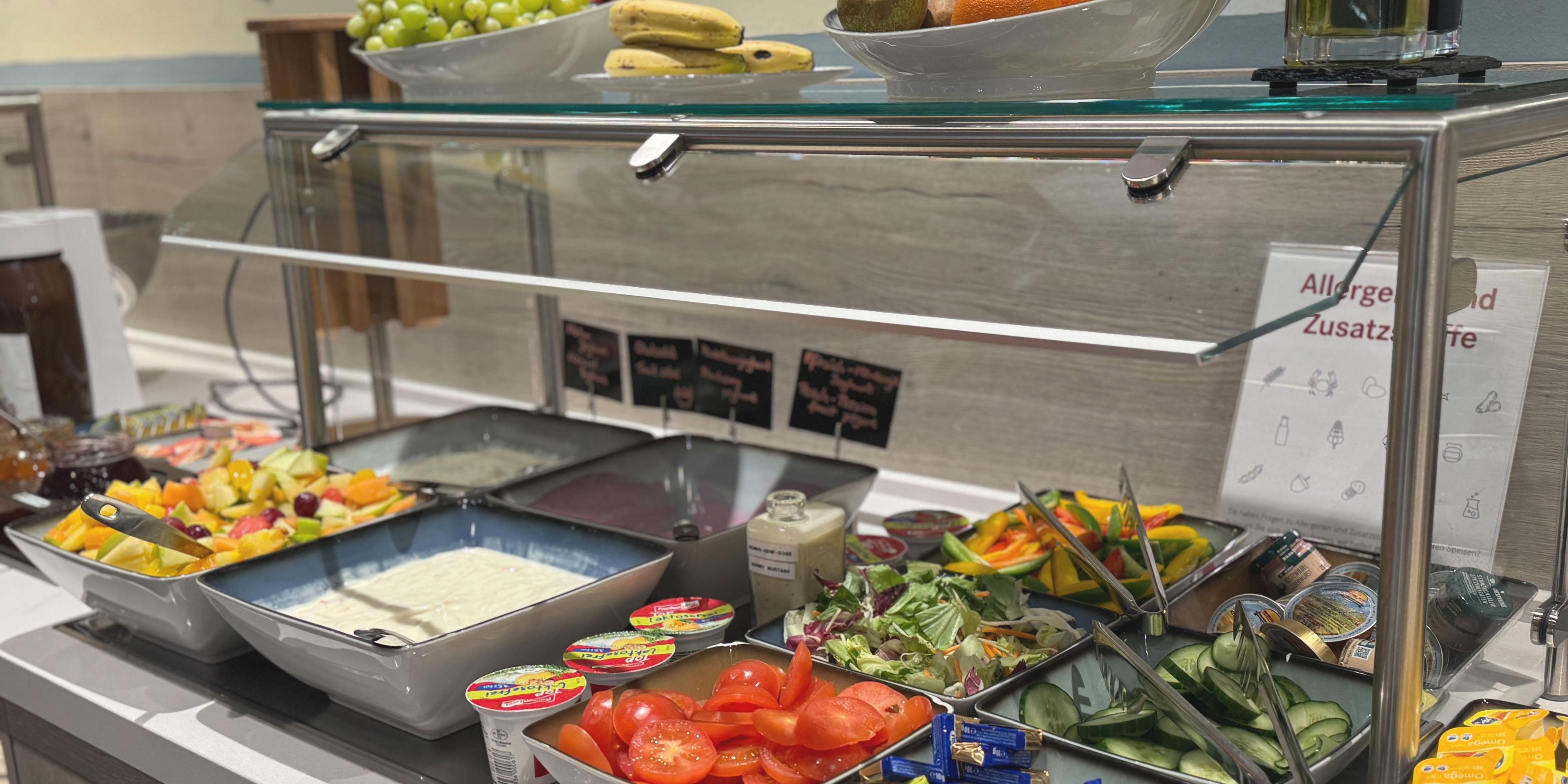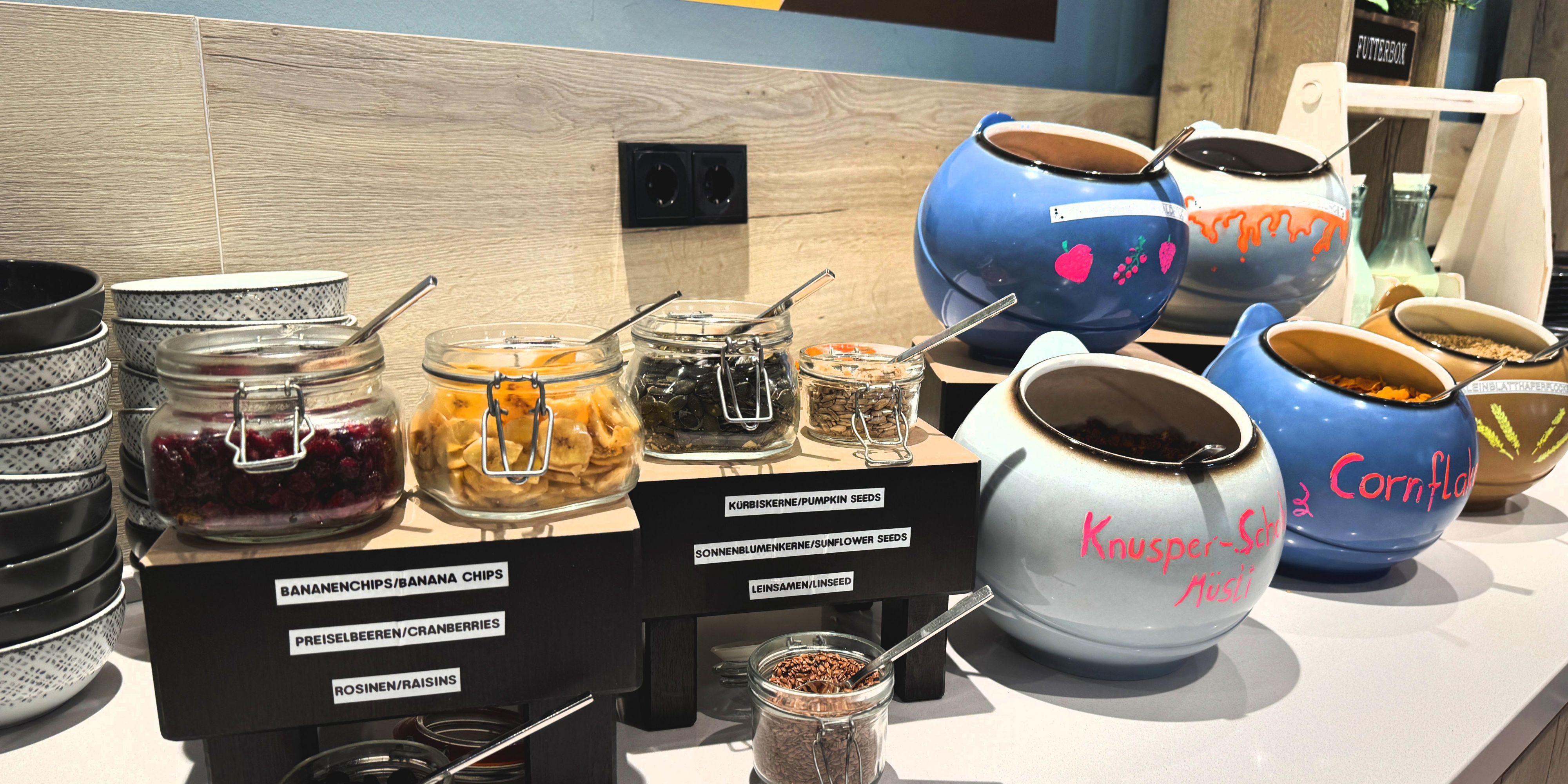 Start your day with our generous breakfast buffet, tailored to all preferences. Enjoy fresh fruit, vegan platters, crisp veggie sticks, hummus, and seasonal specials. We also offer gluten free bread and lactose free yogurts in exciting flavours like passion fruit and cherry. Treat yourself to salad bowls, mozzarella tomato skewers, or warm classics like baked beans and pancakes with sweet toppings. Pair it with your favourite coffee, including lactose free options, or a refreshing ginger shot.
