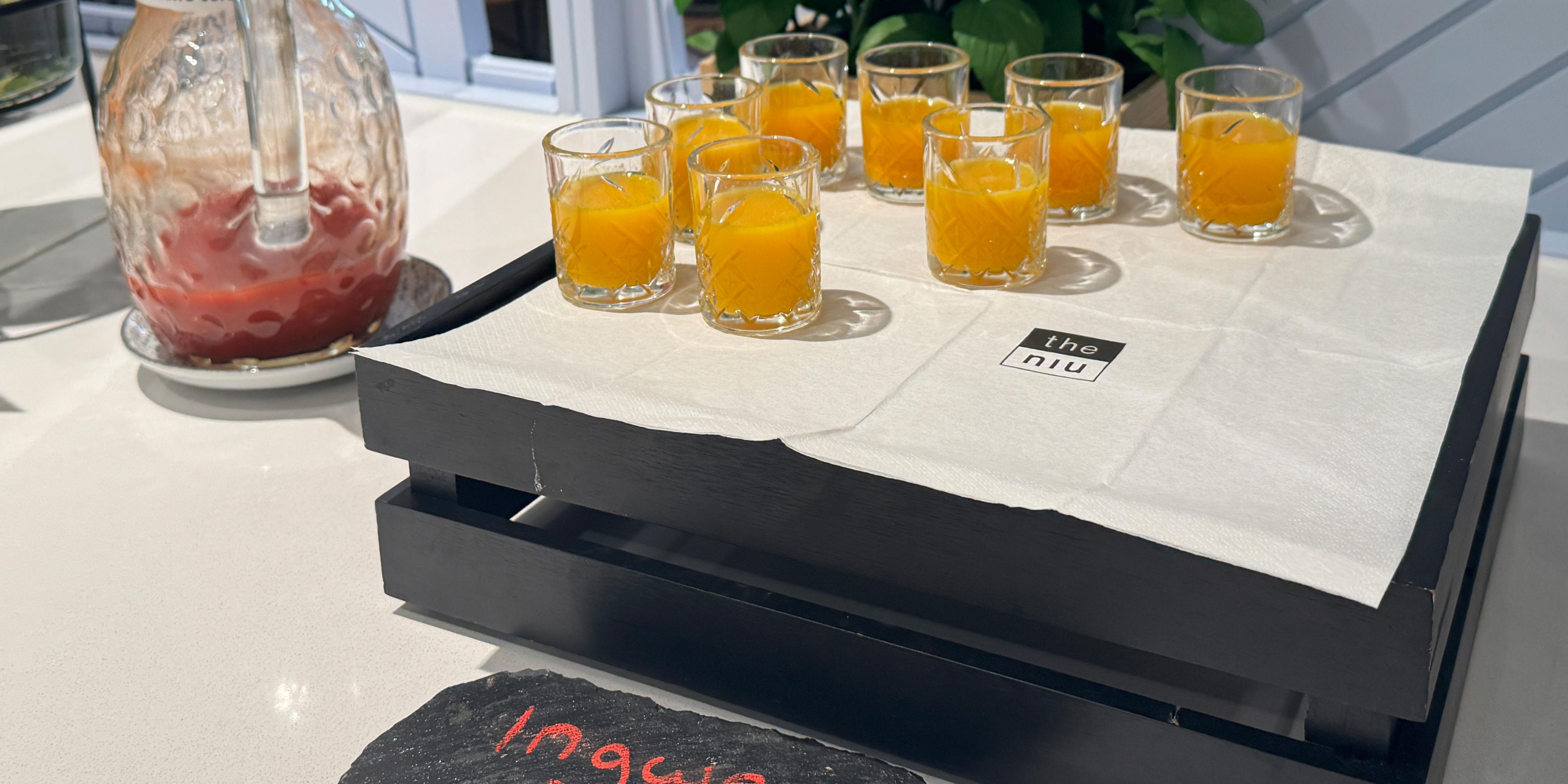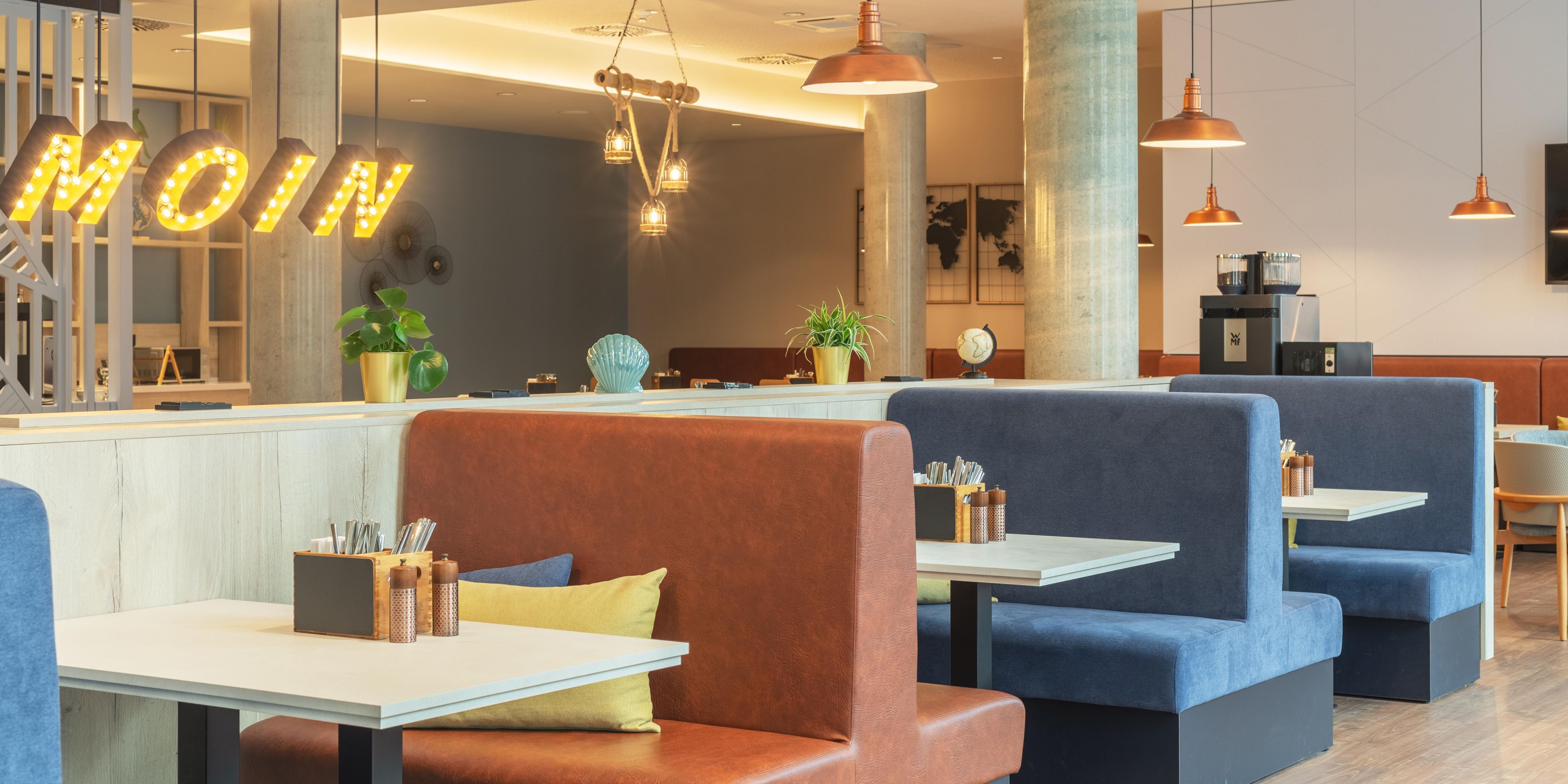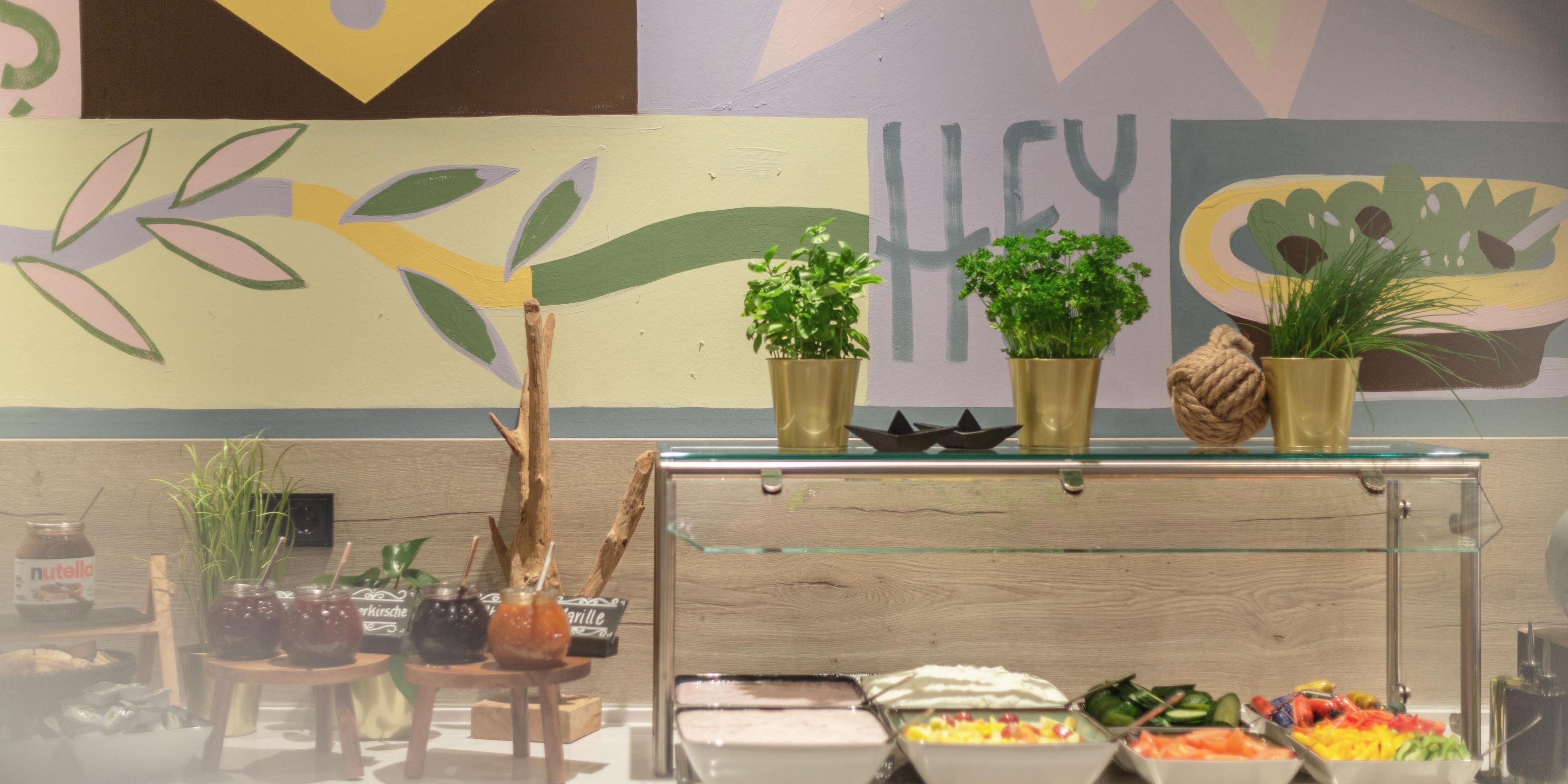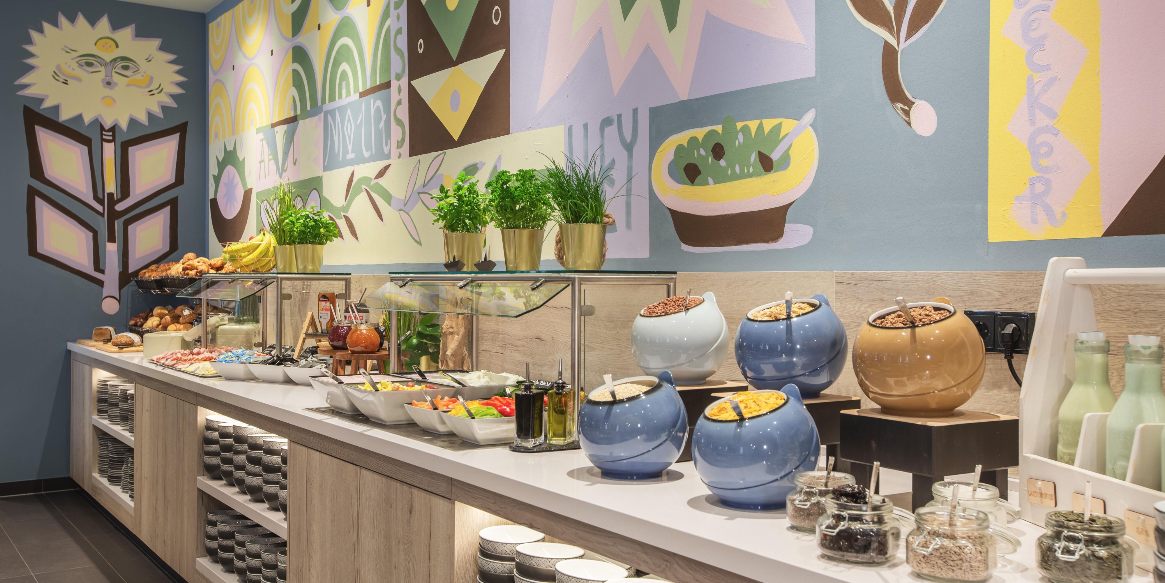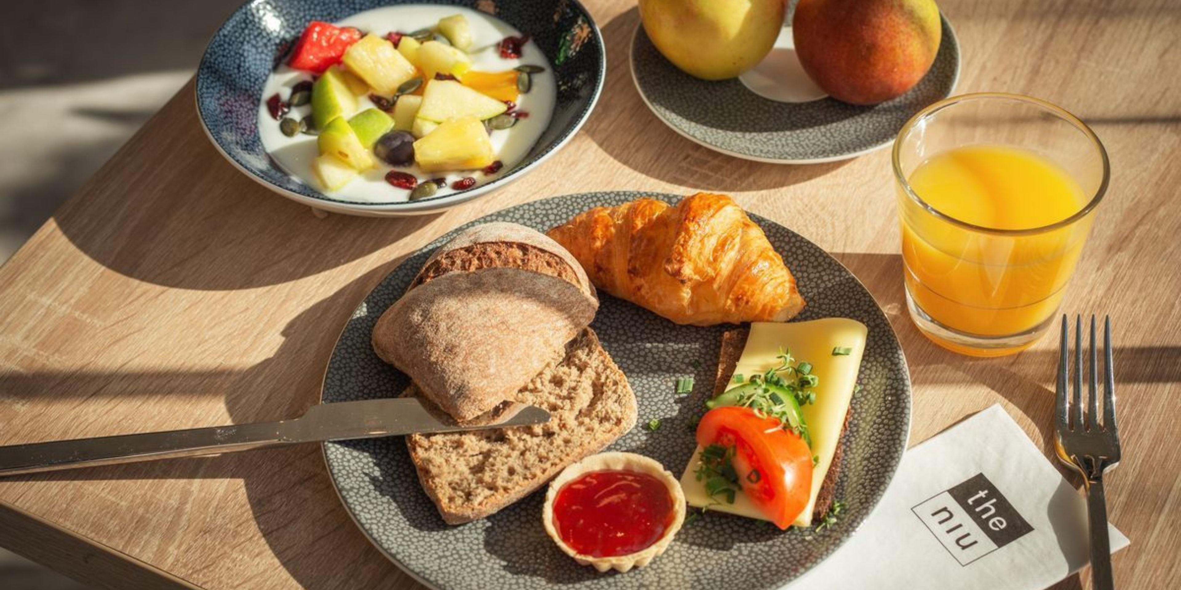 Start your day with our generous breakfast buffet, tailored to all preferences. Enjoy fresh fruit, vegan platters, crisp veggie sticks, hummus, and seasonal specials. We also offer gluten free bread and lactose free yogurts in exciting flavours like passion fruit and cherry. Treat yourself to salad bowls, mozzarella tomato skewers, or warm classics like baked beans and pancakes with sweet toppings. Pair it with your favourite coffee, including lactose free options, or a refreshing ginger shot.