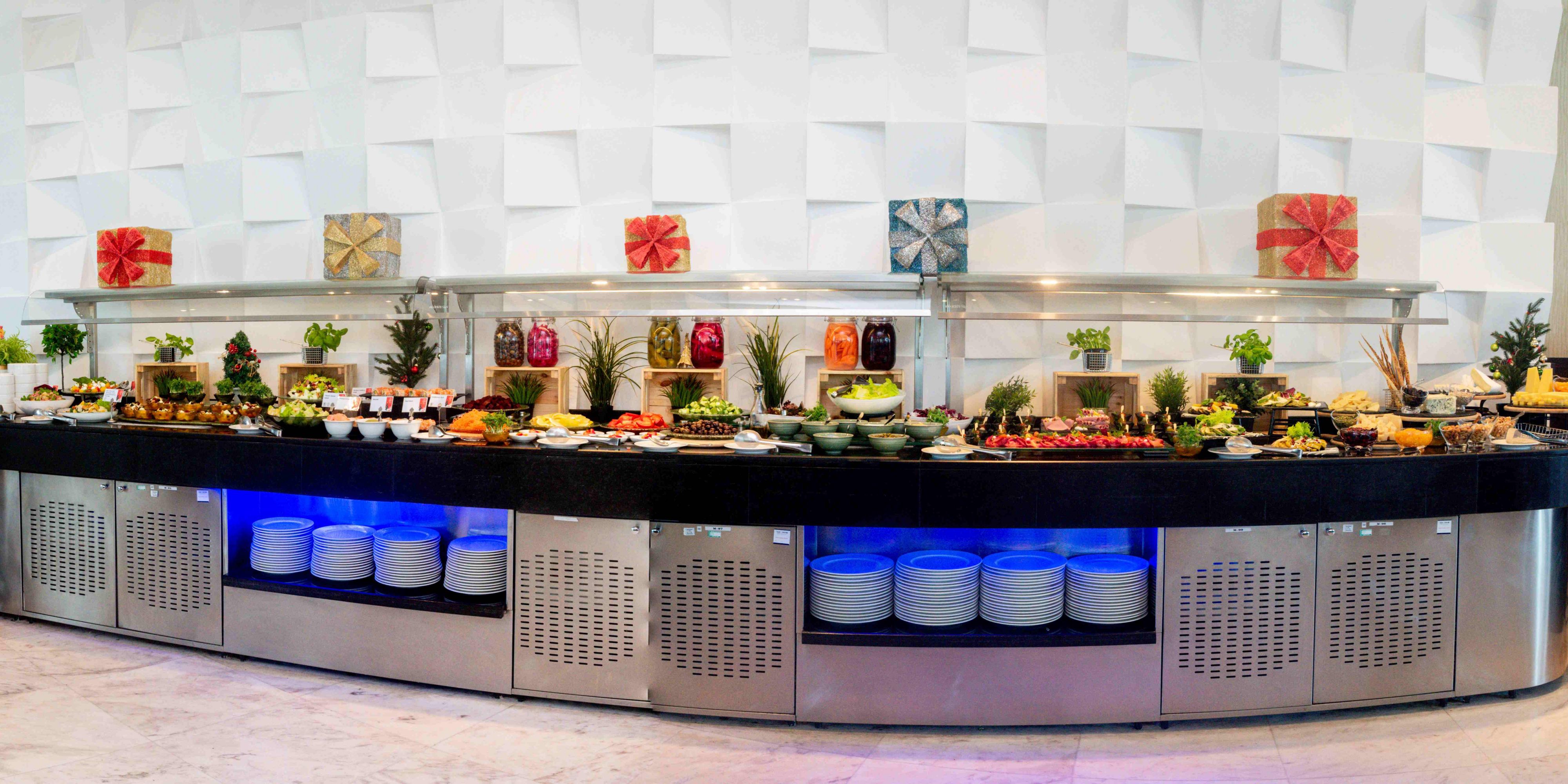 Holiday Inn Abu Dhabi offers various dining options with different cuisines: Stock Burger a sport bar offers American food, Silk Route restaurant with intercontinental dishes, Thirty 1st Bar with stunning views and signature cocktails.