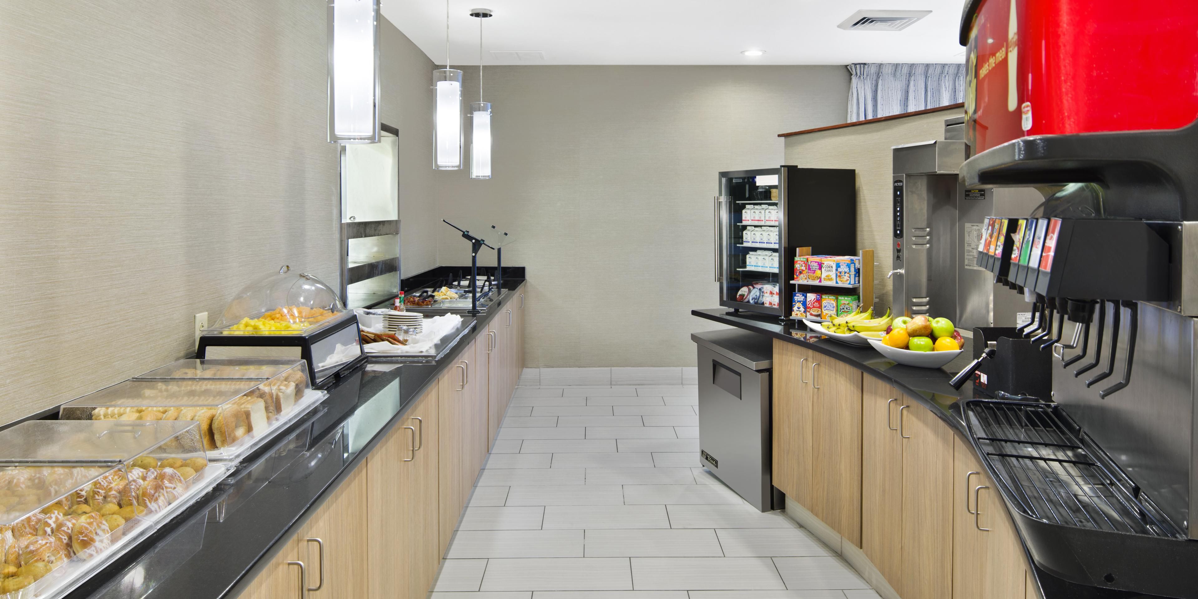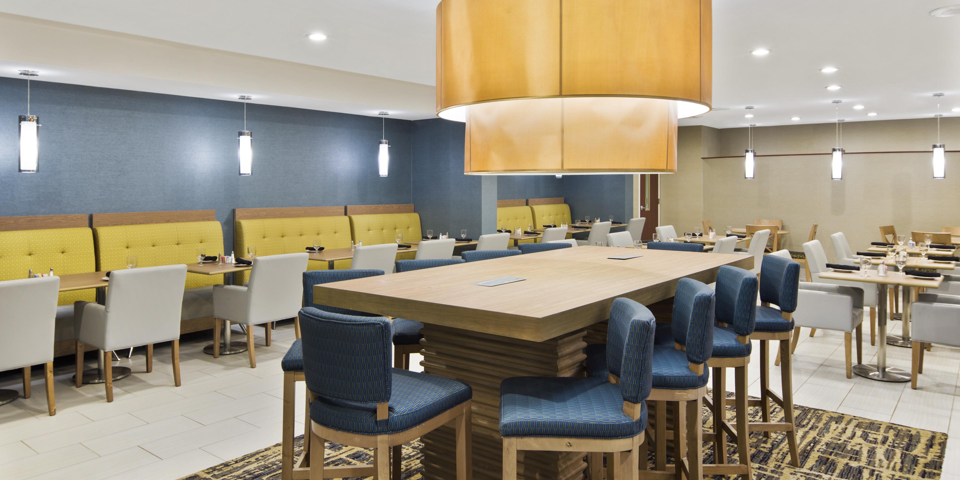 Here at the Holiday Inn we have a full service restaurant and bar that offers a full breakfast buffet or you can order from our menu as well as room service. The hotel restaurant is open for breakfast, lunch and dinner.