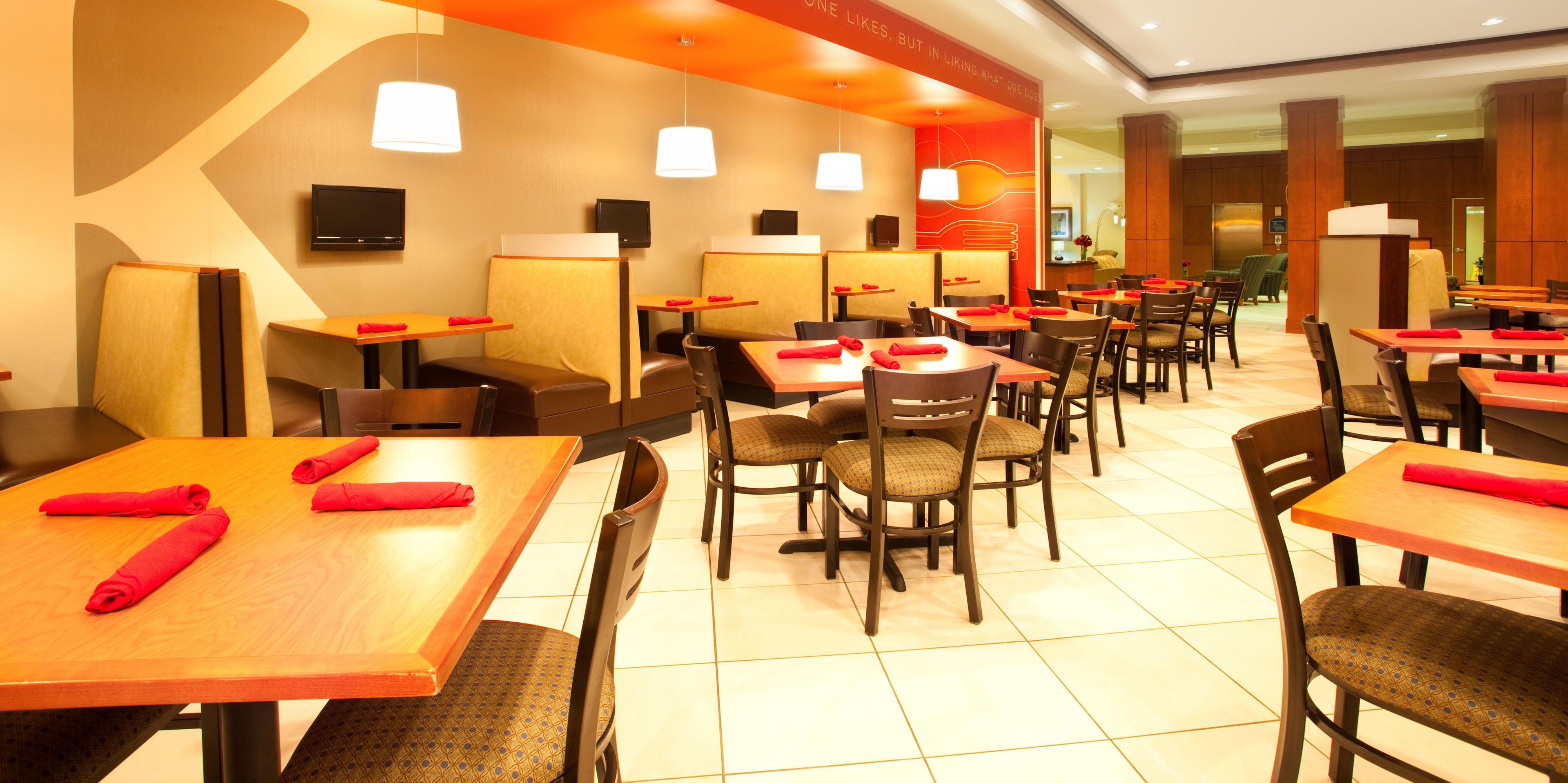 Open for breakfast only. Plenty of seating for our guests. Enjoy scrambled eggs, sausage, tater tots, yogurt, bagels, assorted cereals, fresh fruit and other items.