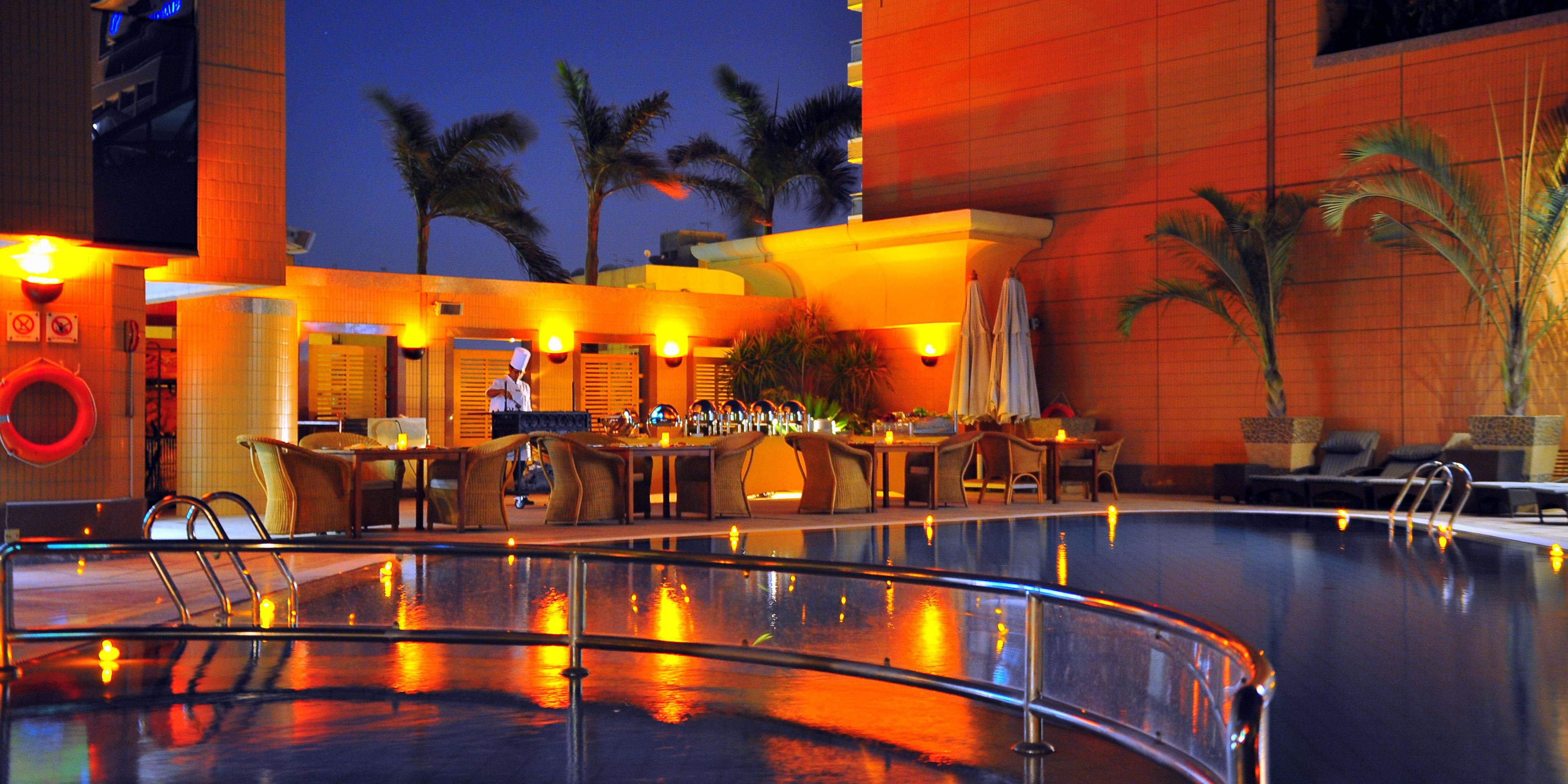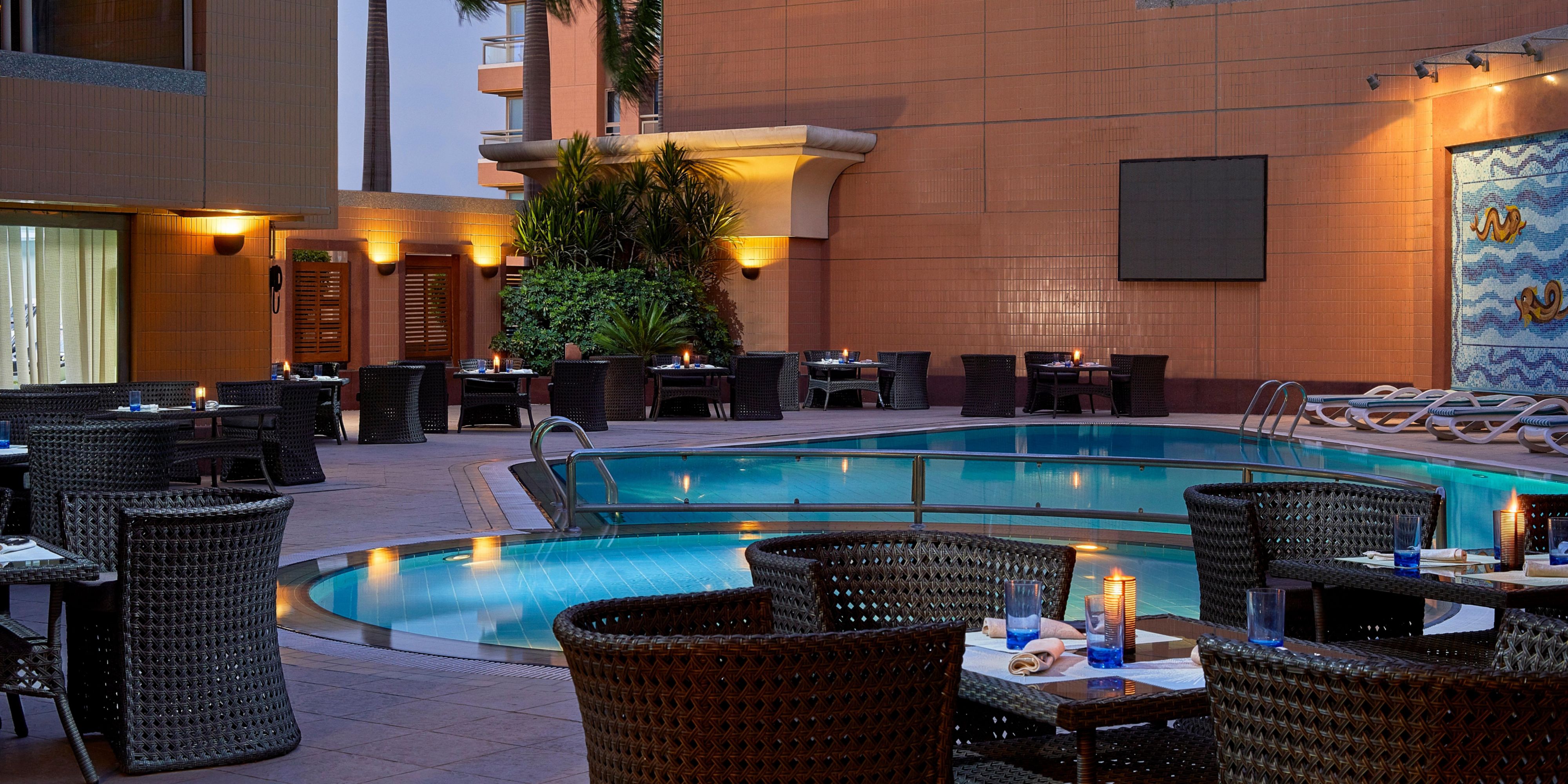 室外泳池花园提供令人垂涎的埃及和国际美食、小吃和清爽鸡尾酒。仅在夏季开放。