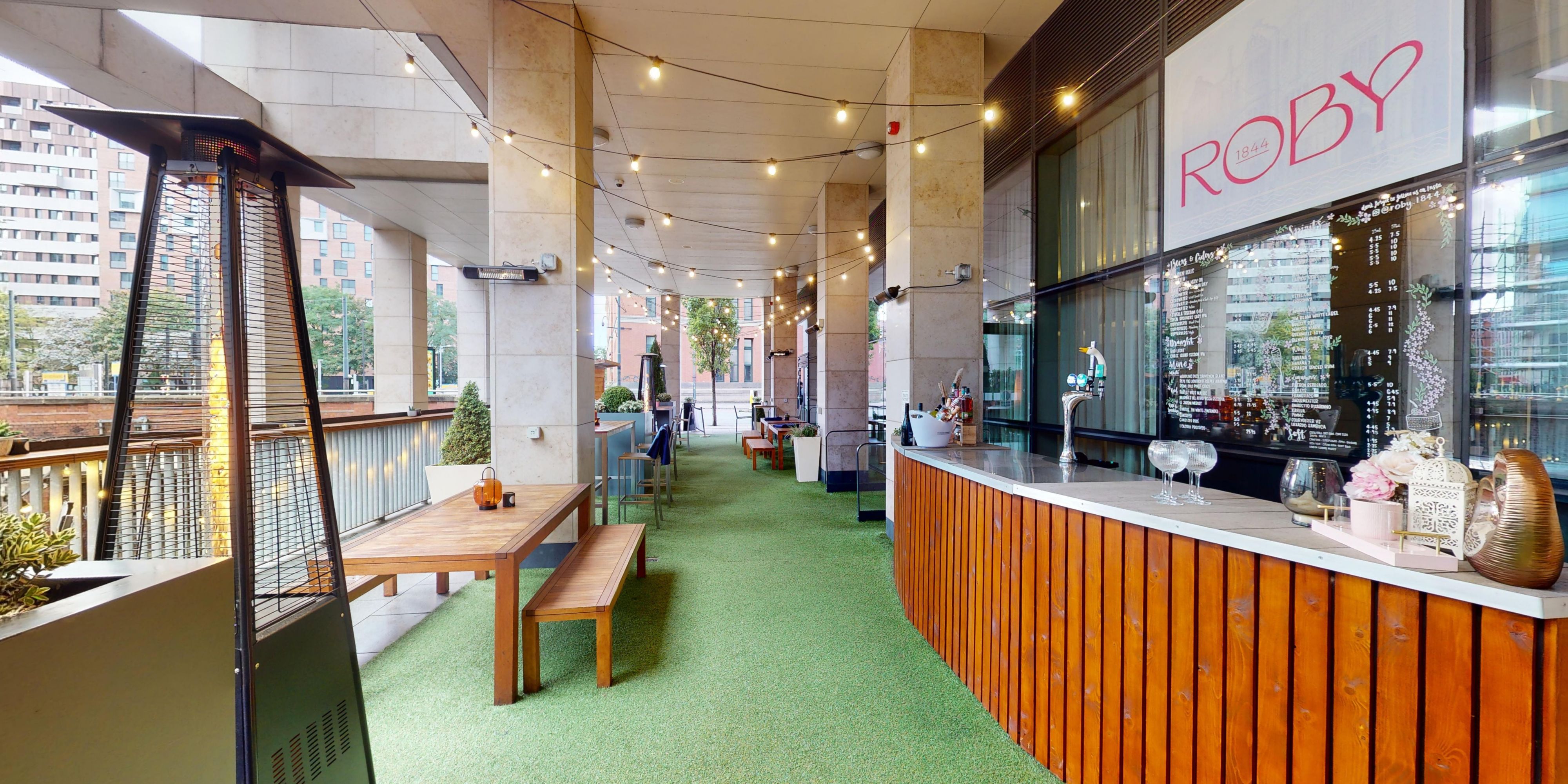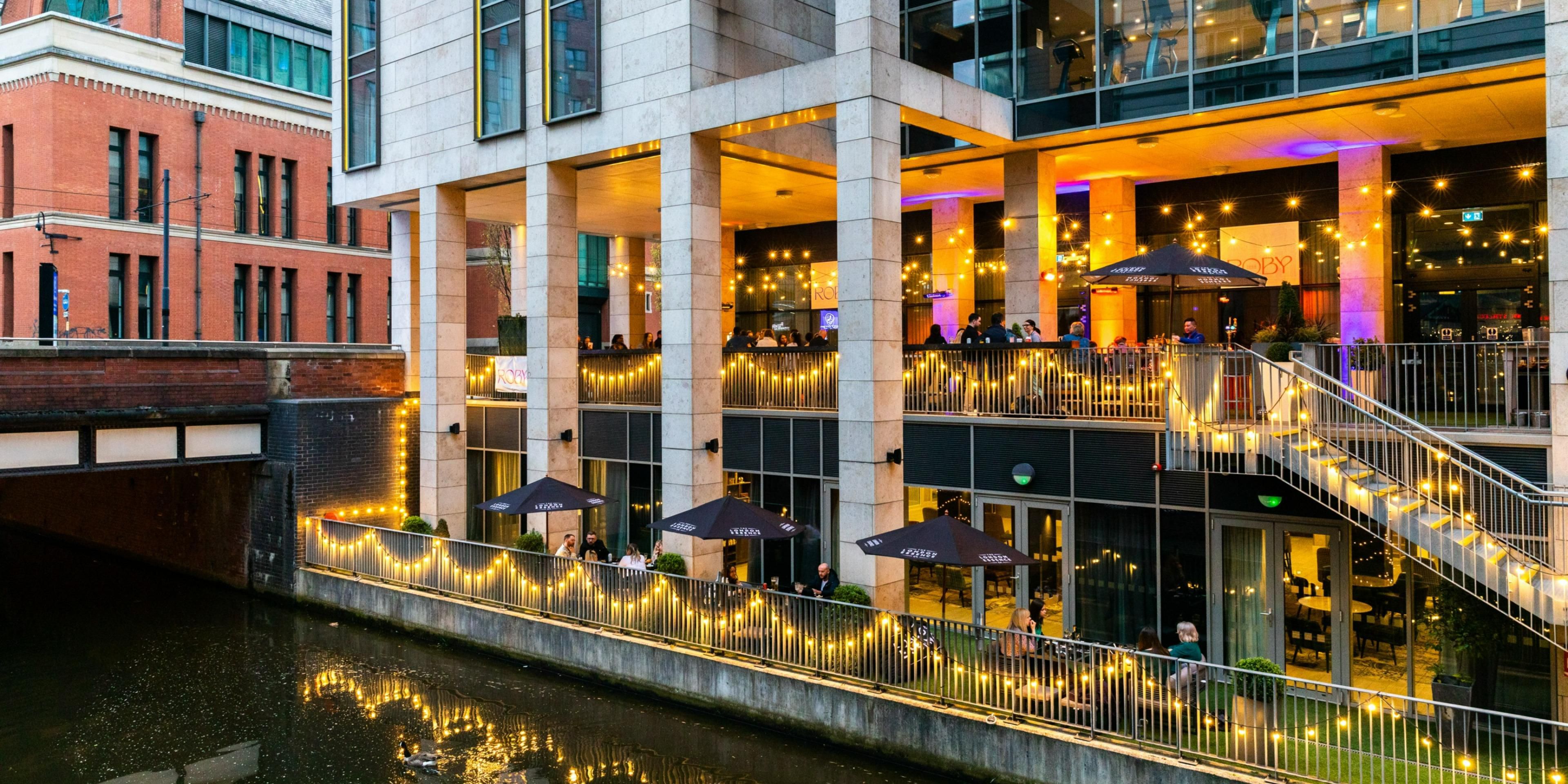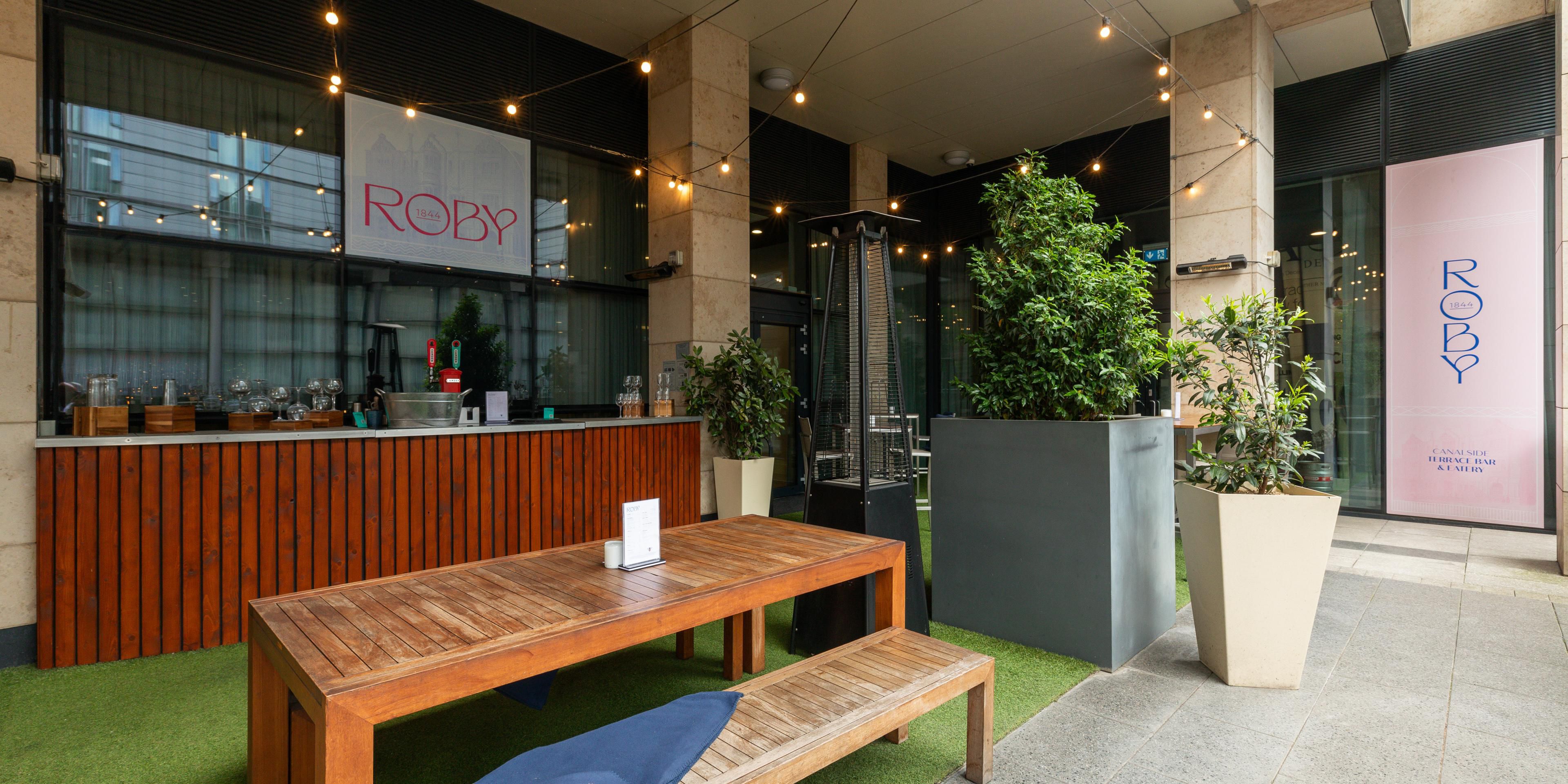 Named after the original Victorian Roby School building next door, Roby1844 Canalside Terrace Bar and Eatery is a vibrant spot offering a relaxed ambience with festoon lighting, waterside seating, music, and an outdoor bar.