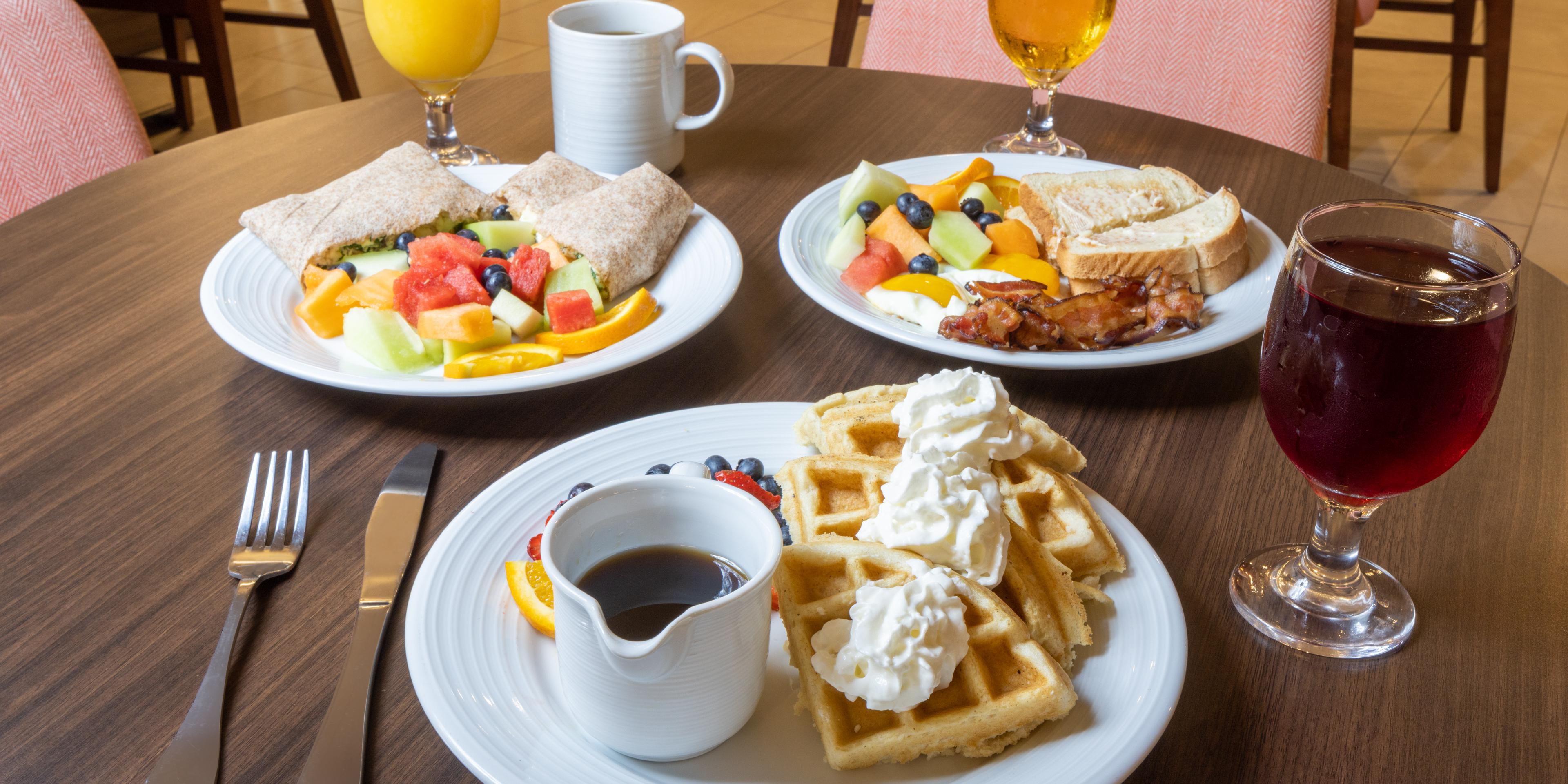 Savor delicious comfort food and pub fare at Hudson's Bar and Grill, our onsite restaurant serving breakfast menu and dinner during the week. From eggs and bacon, mouthwatering burgers, sandwiches, salads, and a dessert option, you'll enjoy tasty meals in a comfortable, friendly atmosphere where kids under 11 eat free with one paying adult. Come try our handcrafted cocktails, beer, wine at the bar. Breakfast daily buffet is not included with guest room stay.