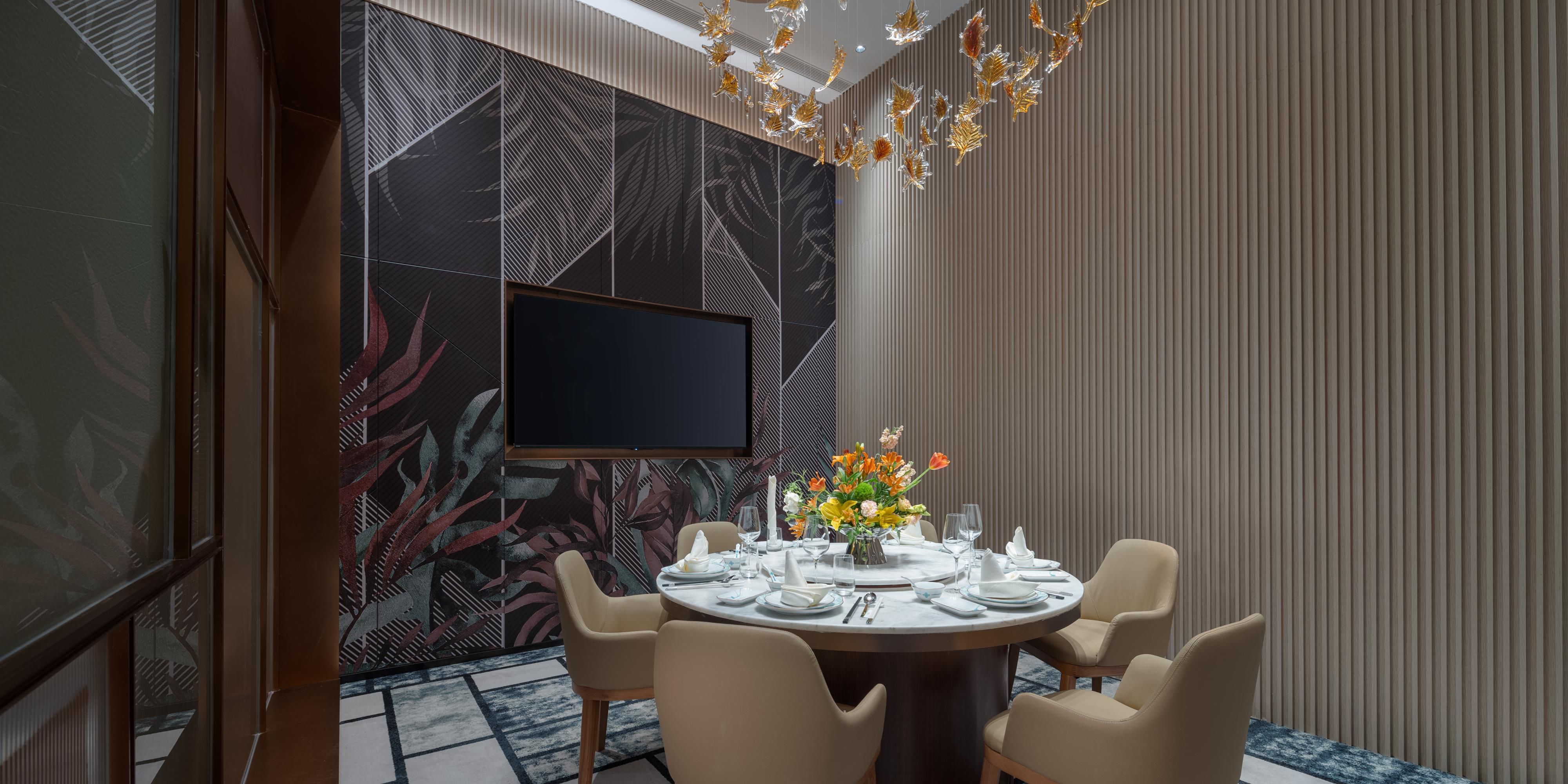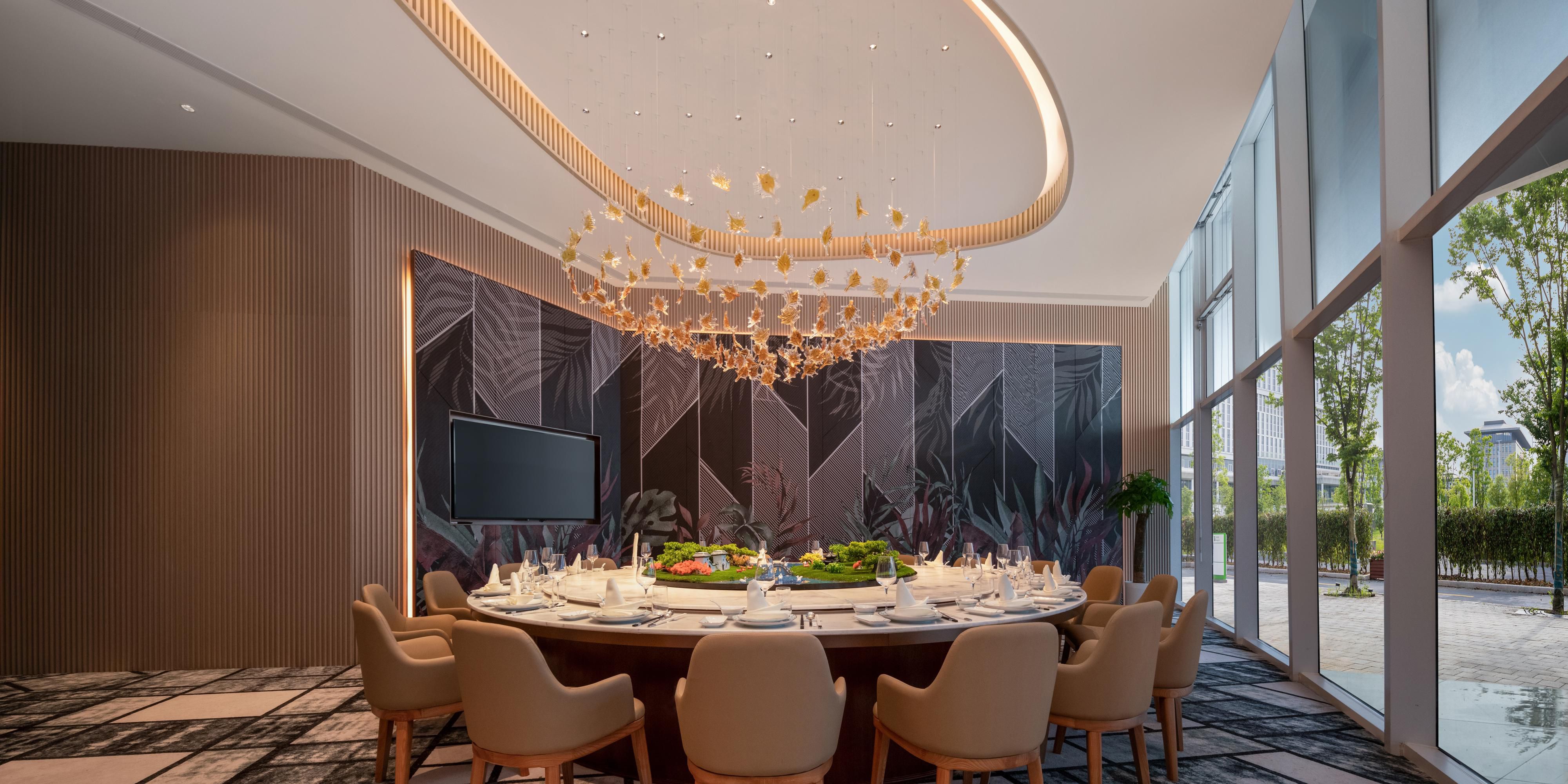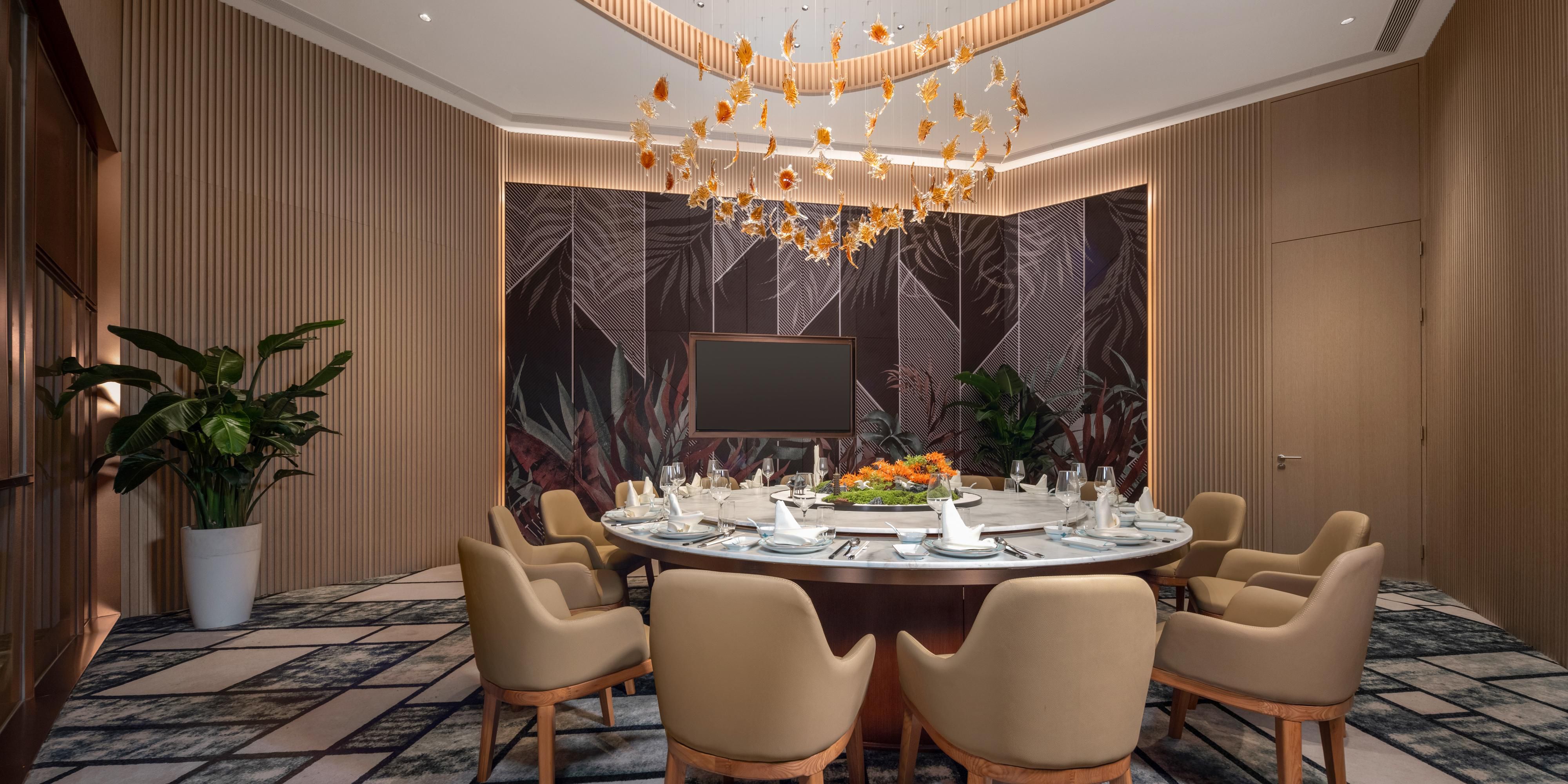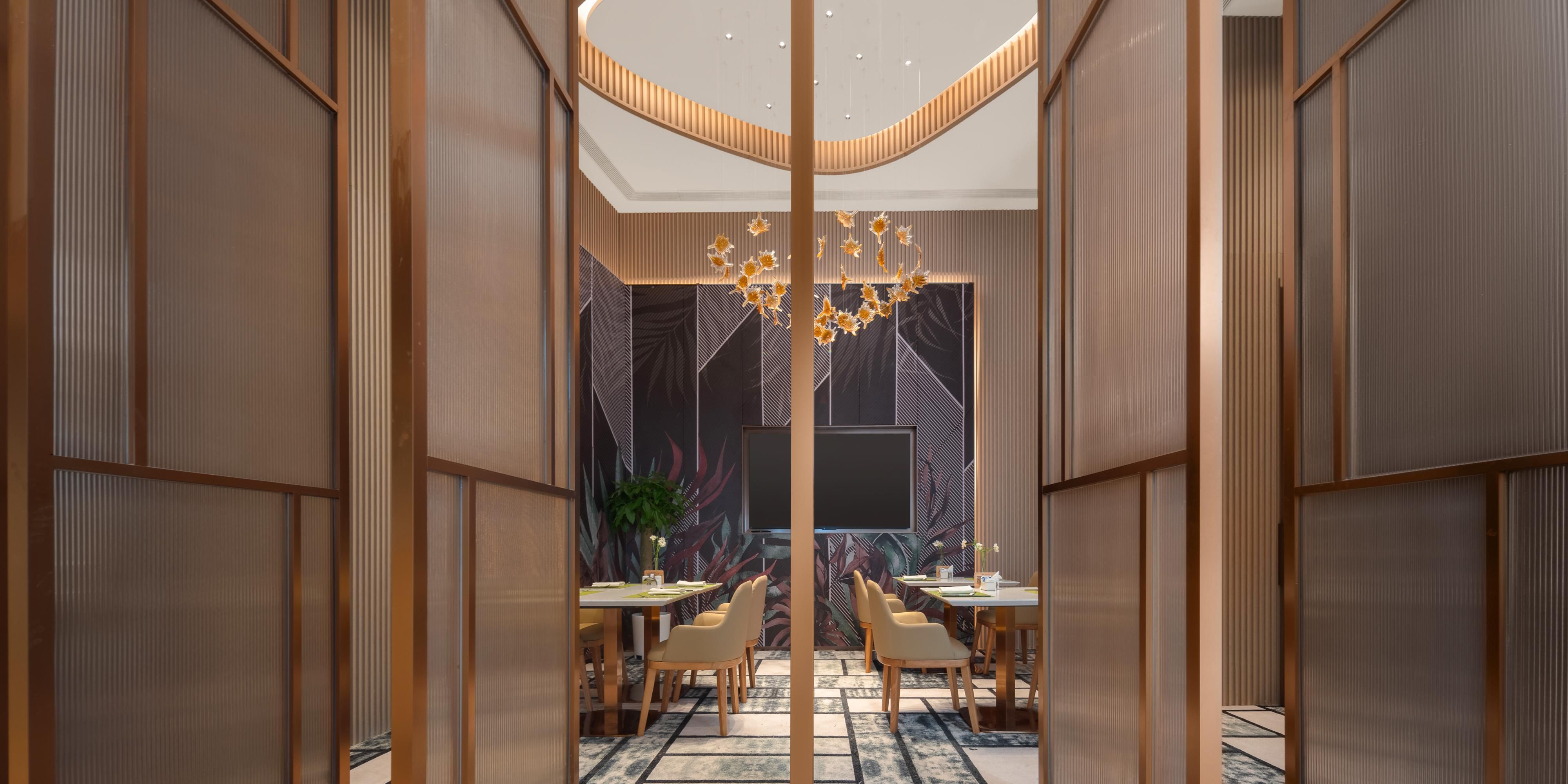 中餐厅设有3个包厢,分别是香柳、蕙兰、繁缕,共50个 餐位。餐厅以丰富色彩和低调、内敛的餐厅设计风格彰显 了现代都市感,同时洋溢着对中国传统的温暖怀旧之情。 酒店除了以注重本味、富于变化的杭帮菜、粤菜为主打, 同样也精心制作正宗的衢州本地及周边特色菜系,充分满 足宾客对于高水准商务宴请的需求。