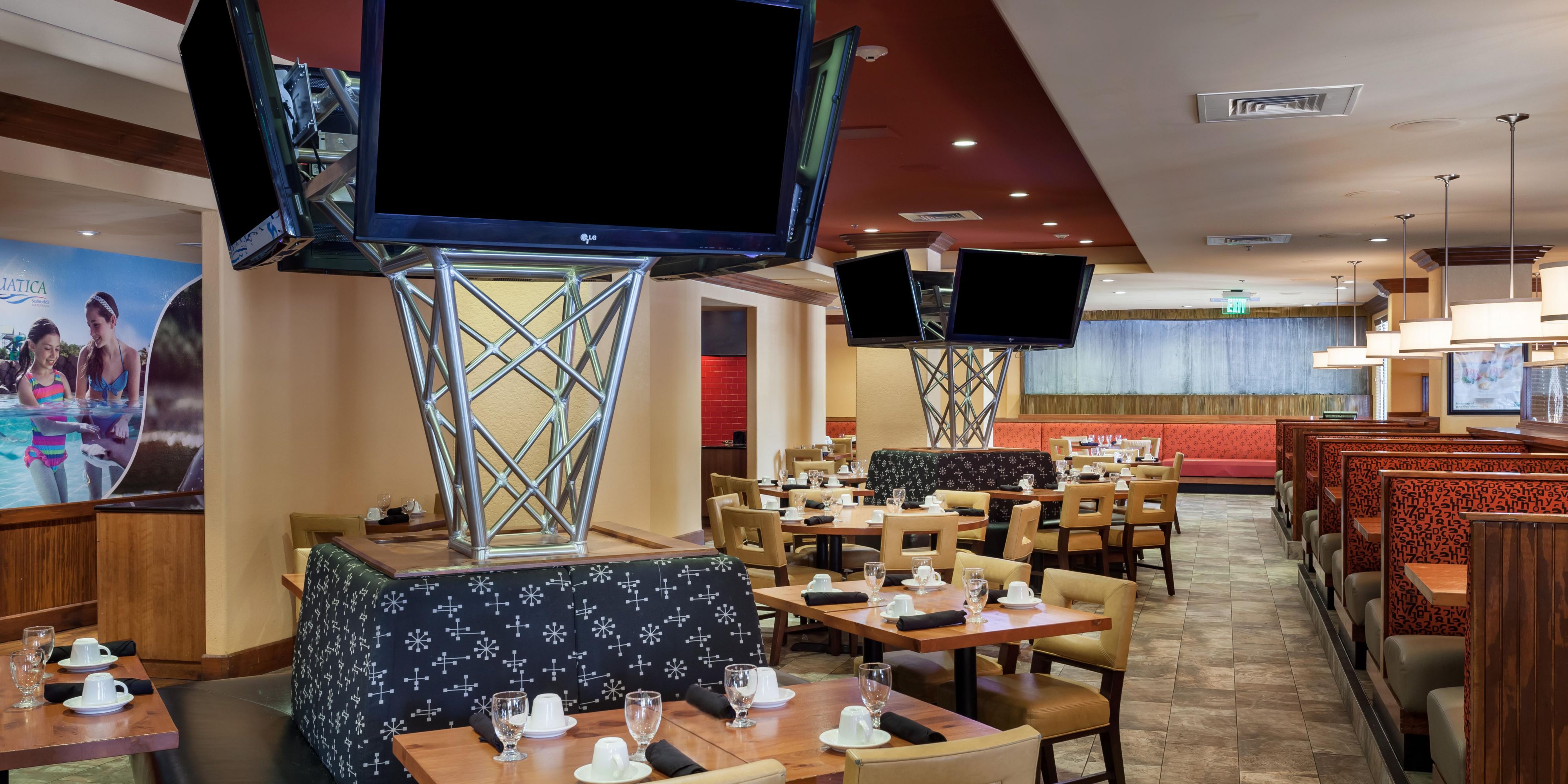 The Grill offers a variety of options including appetizers, sandwiches, salads, seafood entrees and steaks grilled over an open flame. Choose from 8 draft beers while watching sporting events on 18 HD TVs. Open breakfast and dinner.