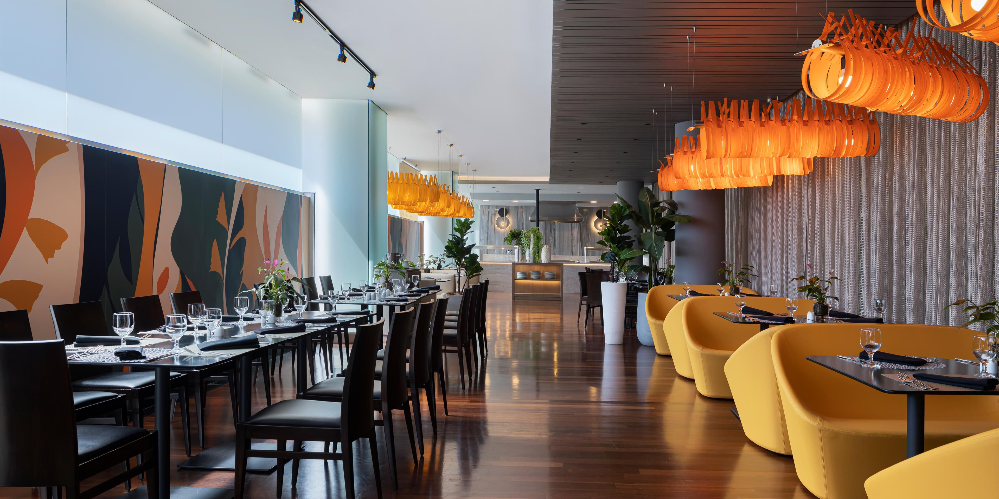 This modern dining spot specializes in Mediterranean cuisine with international influences. Start your day with a breakfast buffet and enjoy à la carte options for lunch and dinner. The bar offers a global wine selection and live music every Thursday.