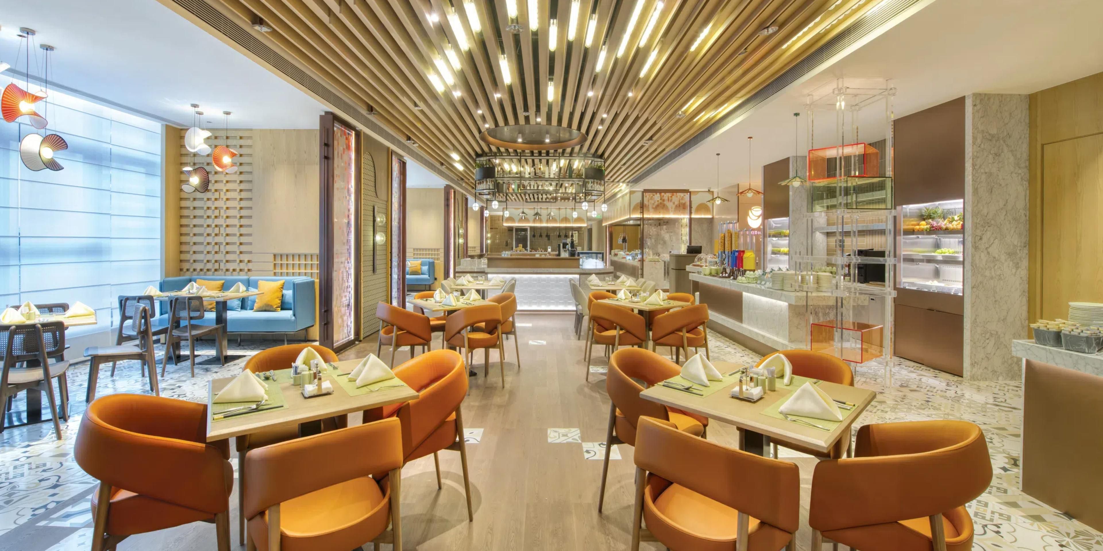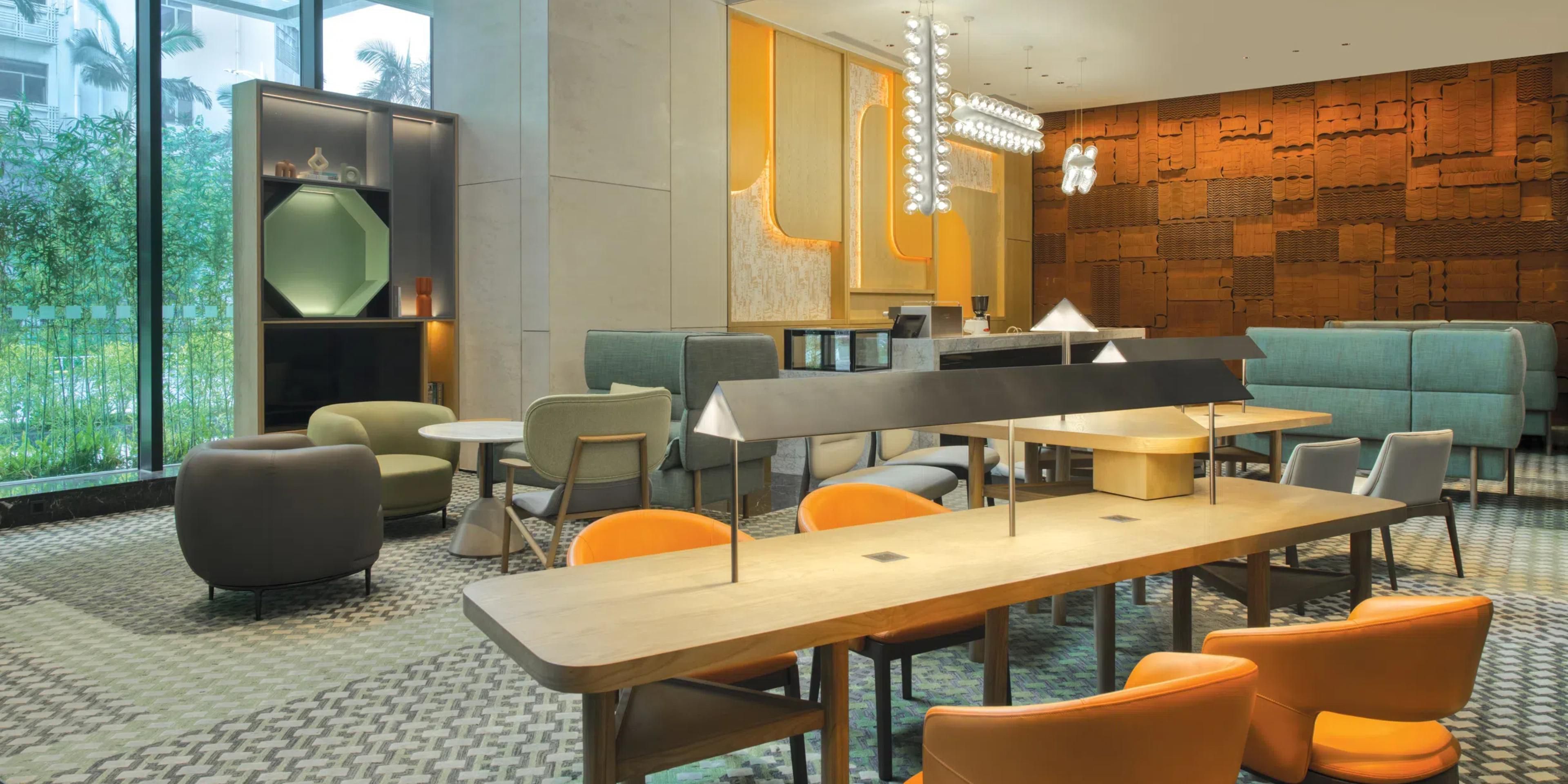 明亮色彩予人轻松自在之感,这里汇聚了各式咖啡、果饮及精致下午茶,解锁商务洽谈灵感。
