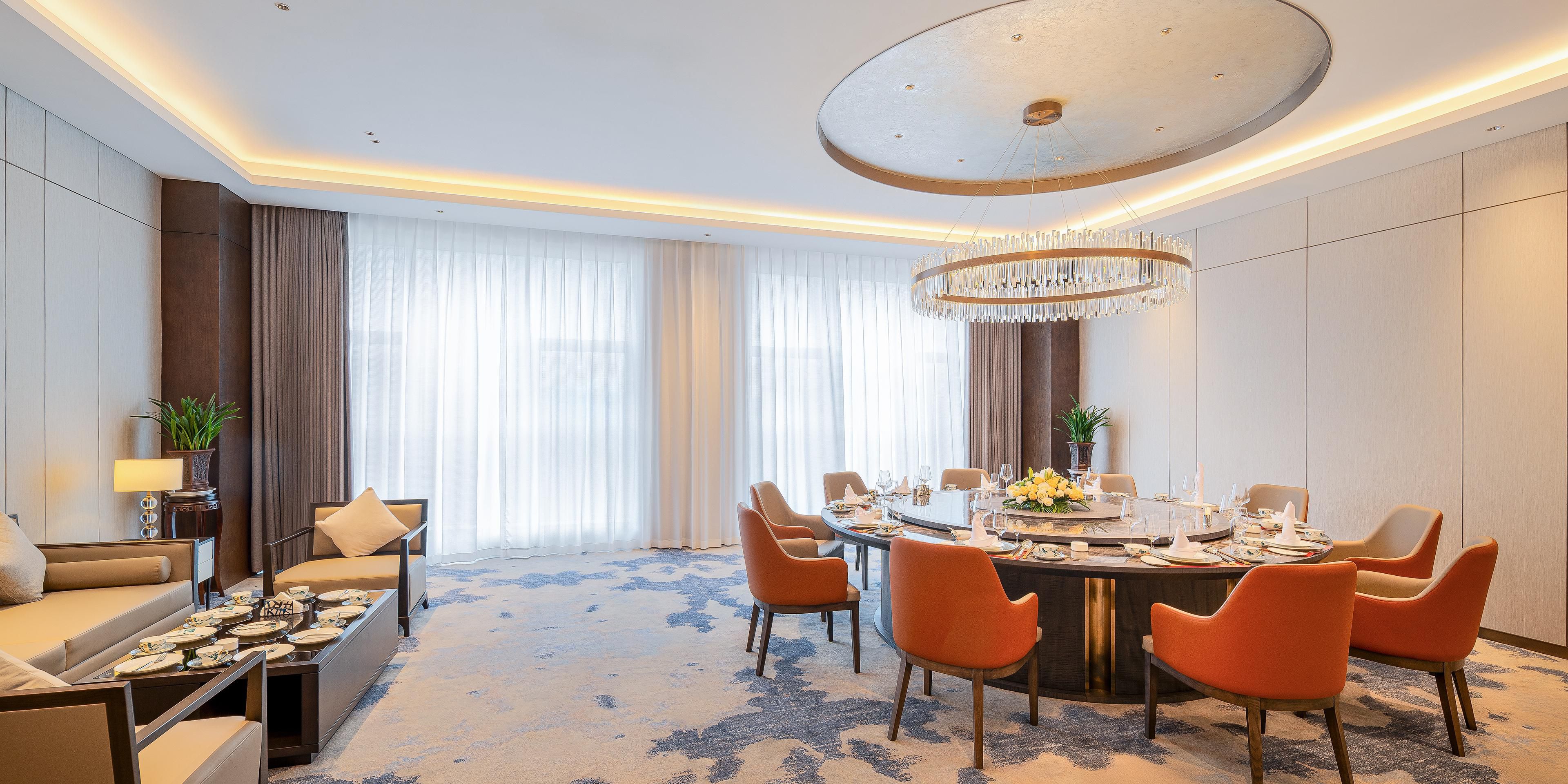 酒店设有 14 个中餐包间,其中 “渭南厅”“高新厅” 当属高端雅室优选。以新中式美学打造清幽雅致的环境,既可围坐品茶、来场掼蛋对决,也能铺展宣纸挥毫创作,美食与多元雅趣在此交融,无论是私宴小聚,还是商务接待,都能带来质感十足的高级体验。