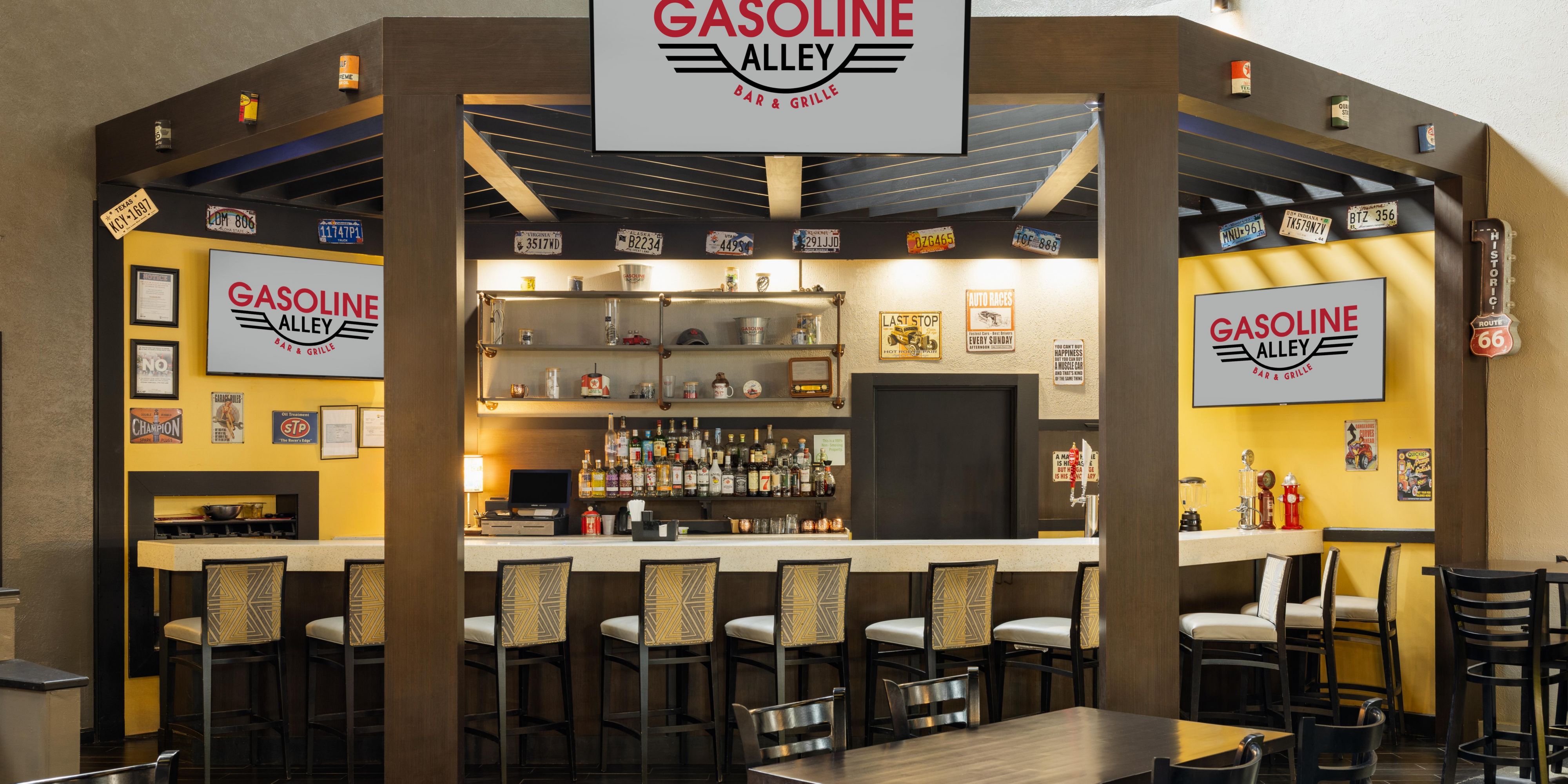Our onsite restaurant and bar, Gasoline Alley, offers classic American fare with specialty cocktails, assorted beers on tap, and a kids' menu. At breakfast, enjoy a variety of freshly prepared, breakfast favorites!