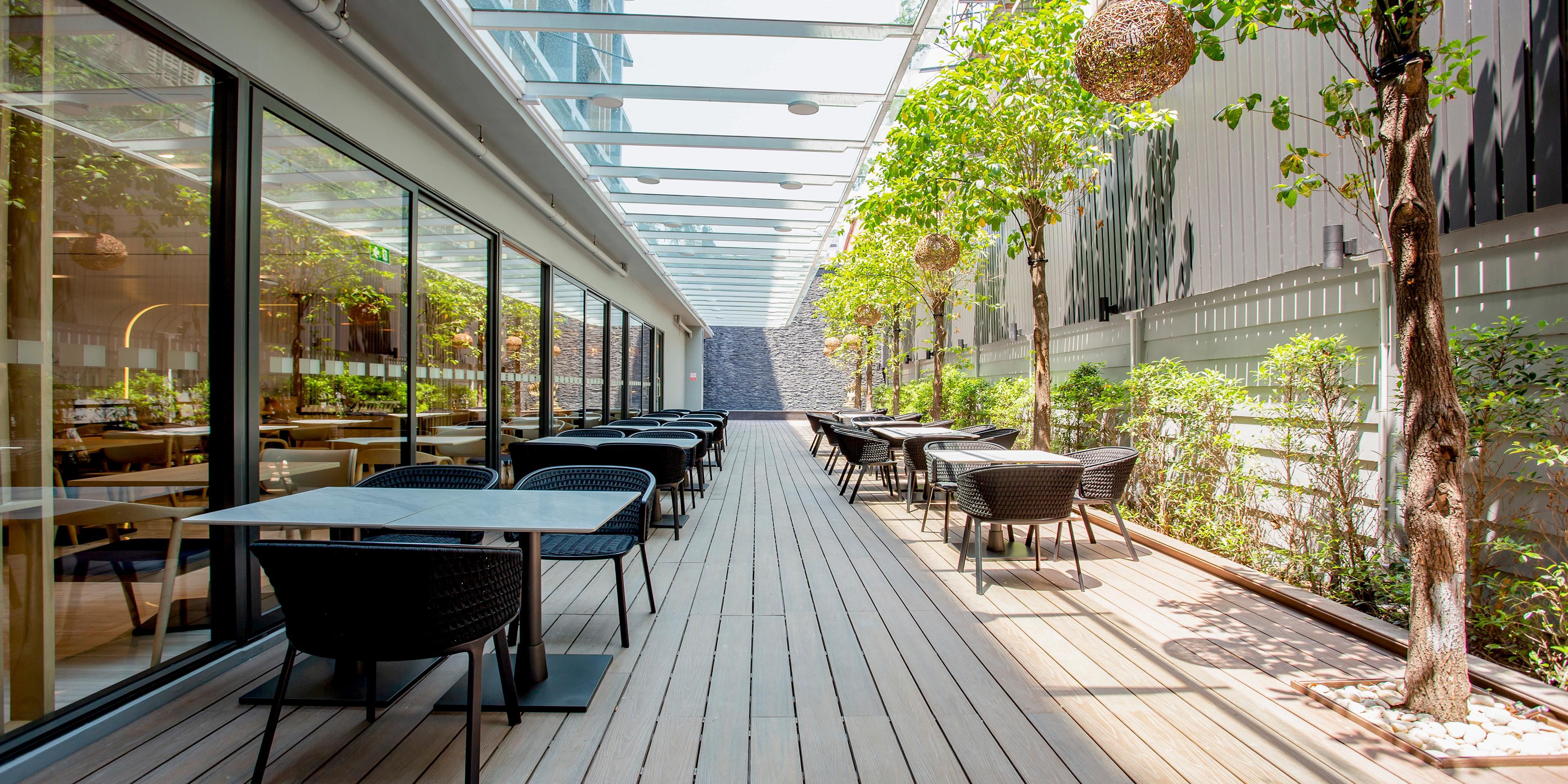Start your Bangkok stay in the Great Room, the vibrant social hub of Holiday Inn Express. This bright and modern space offers a perfect setting to dine, work, or relax, with a peaceful outdoor garden. Each morning, enjoy our complimentary Express Start Breakfast with hot dishes, fresh pastries, fruits, and beverages. For guests on the move, our Grab and Go options make it easy to fuel up quickly.