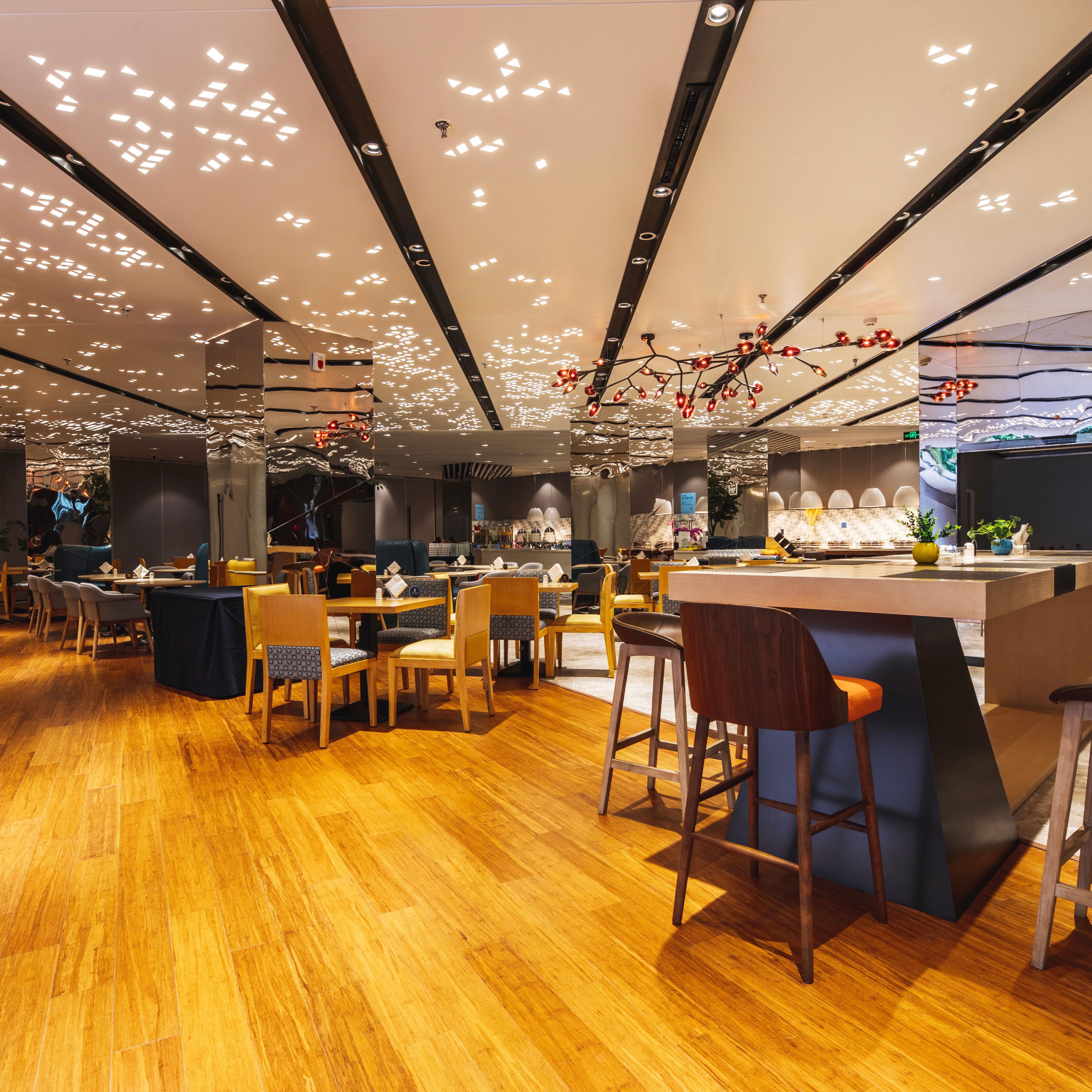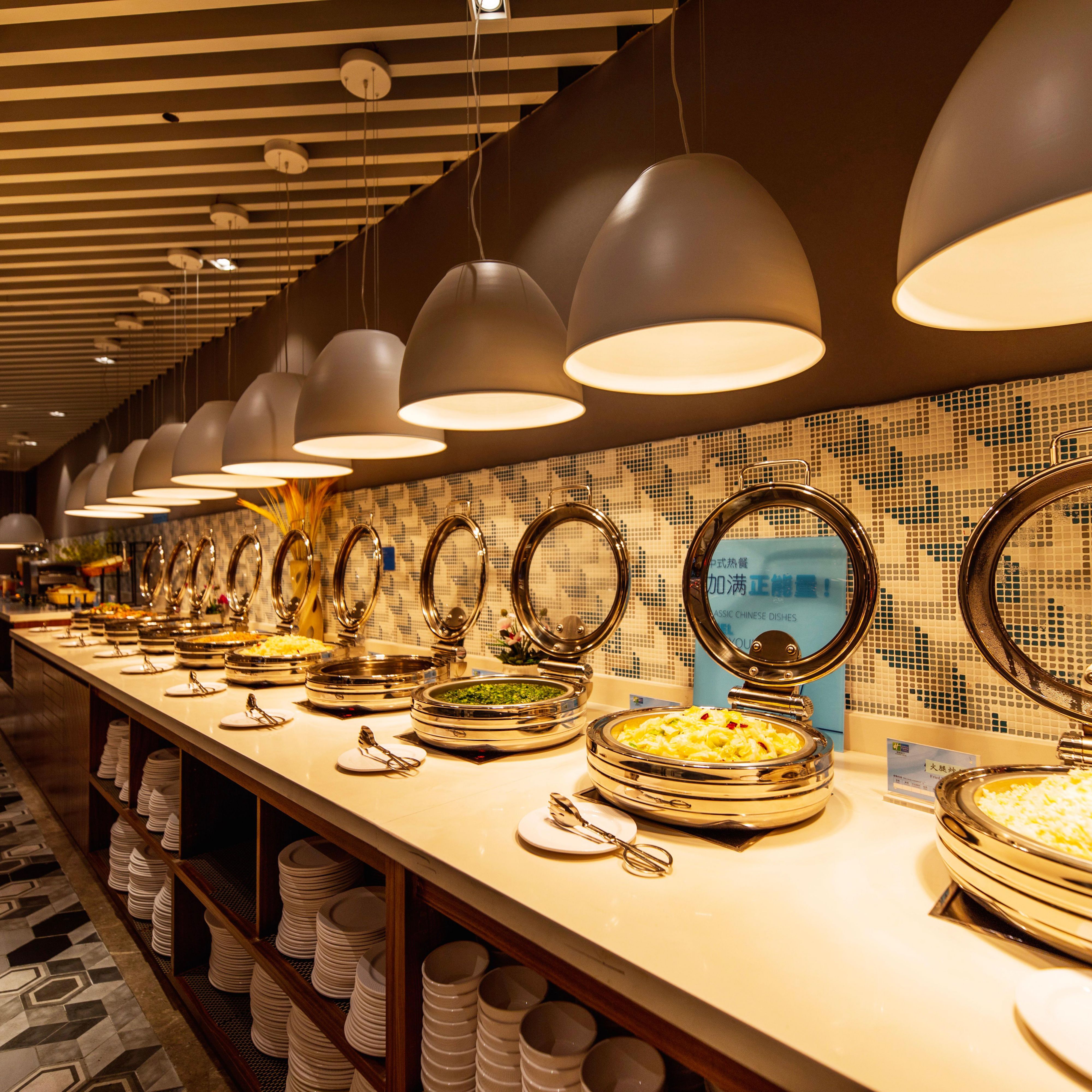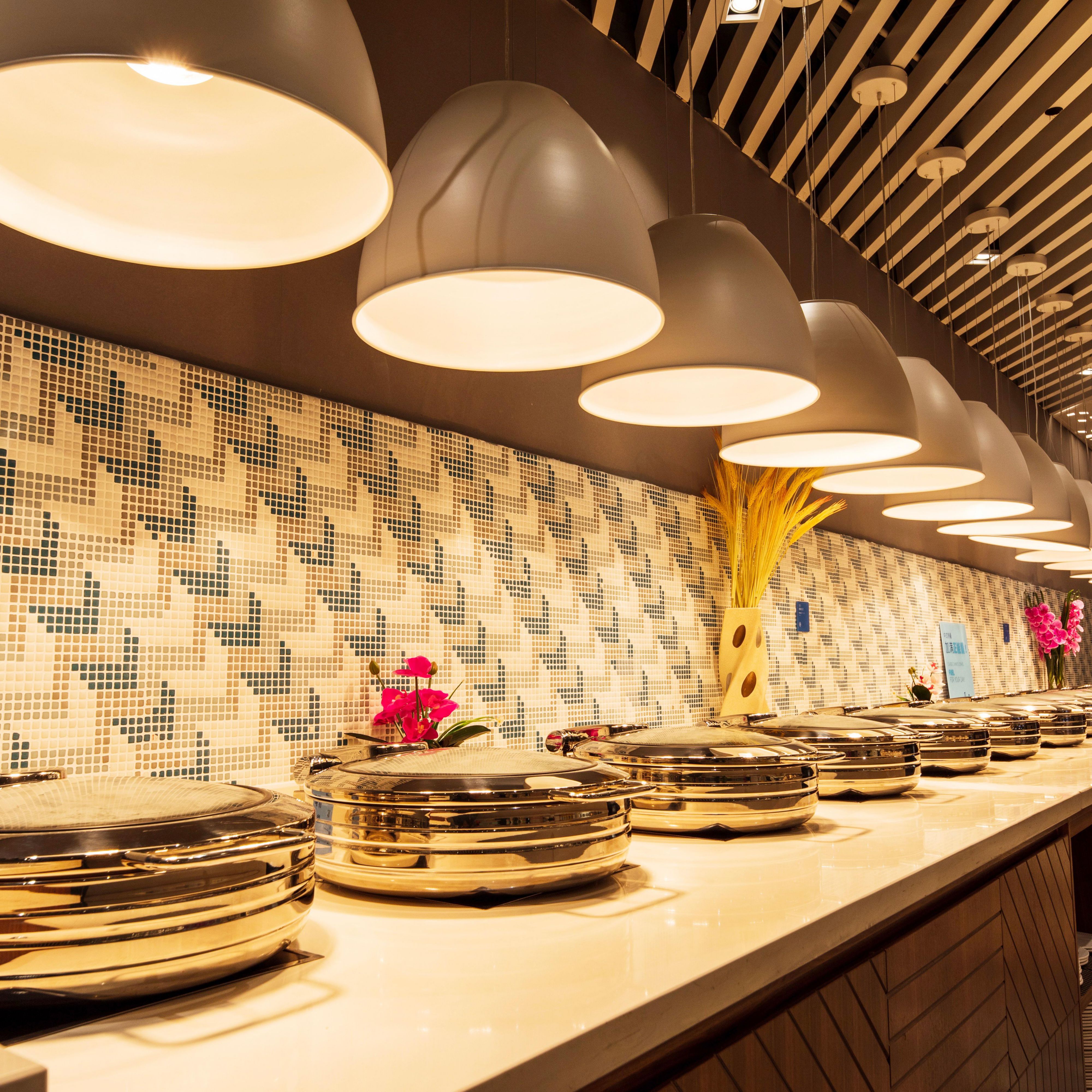 牛奶海餐厅位于酒店一层,能同时容纳300人就餐,餐厅还配备有投影仪和音响。