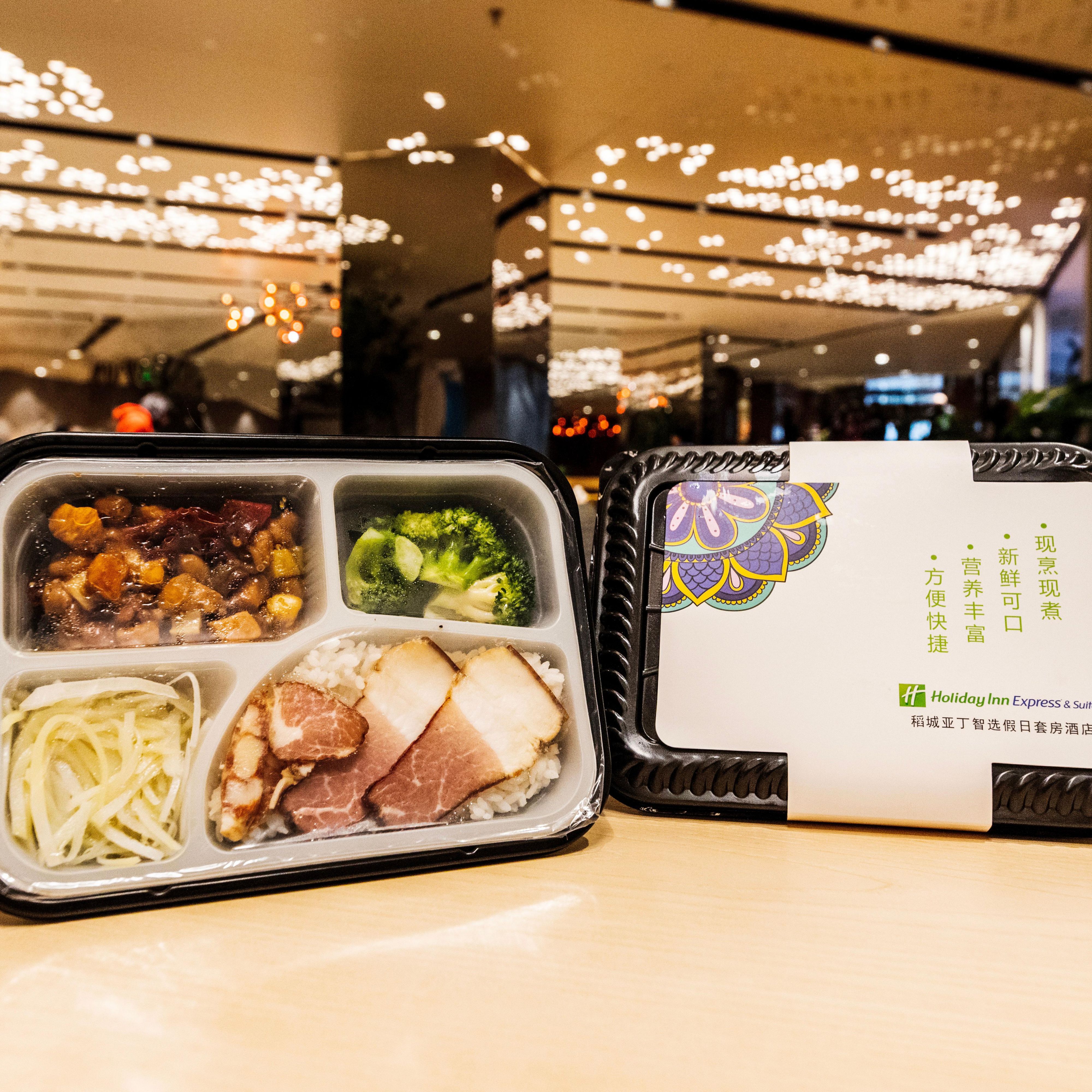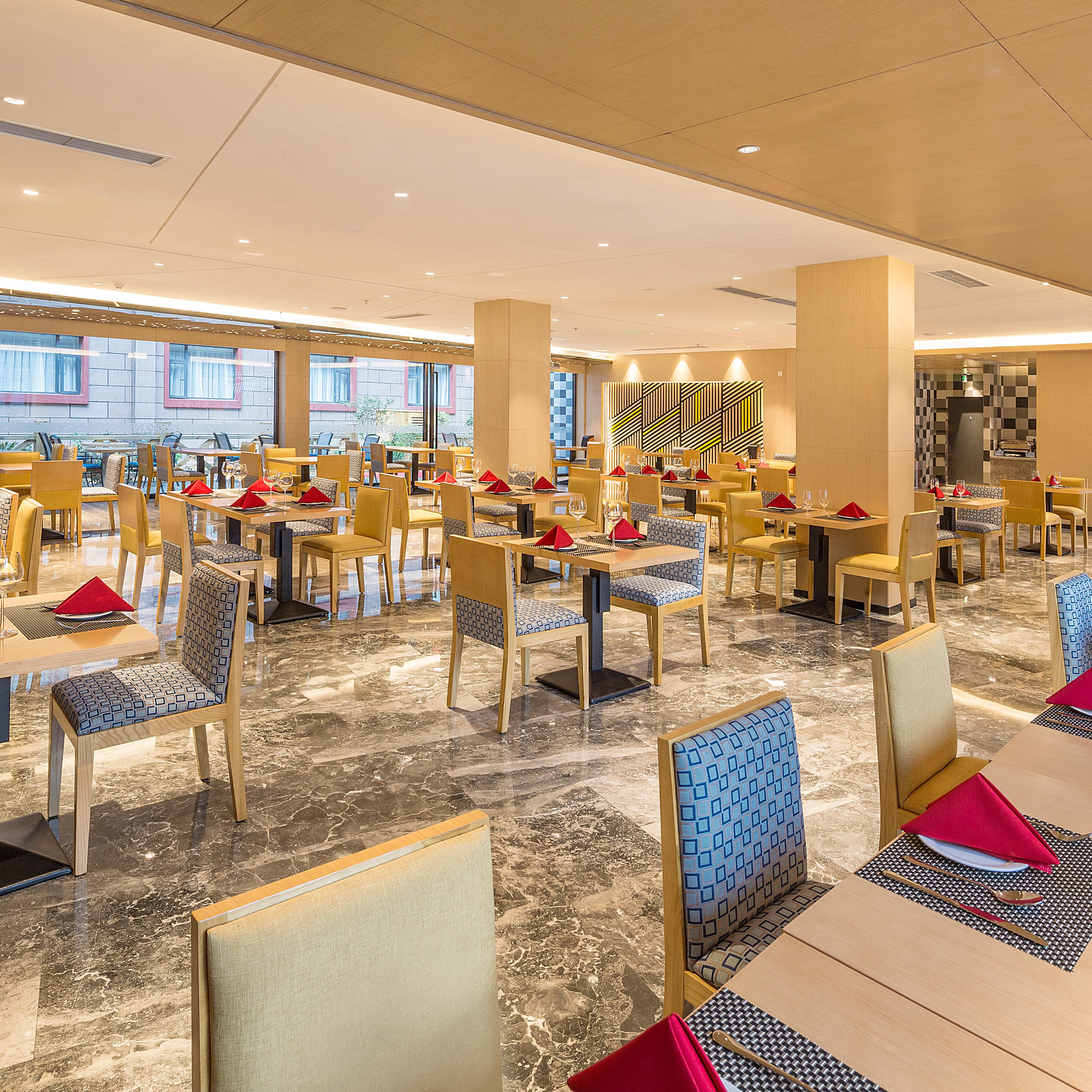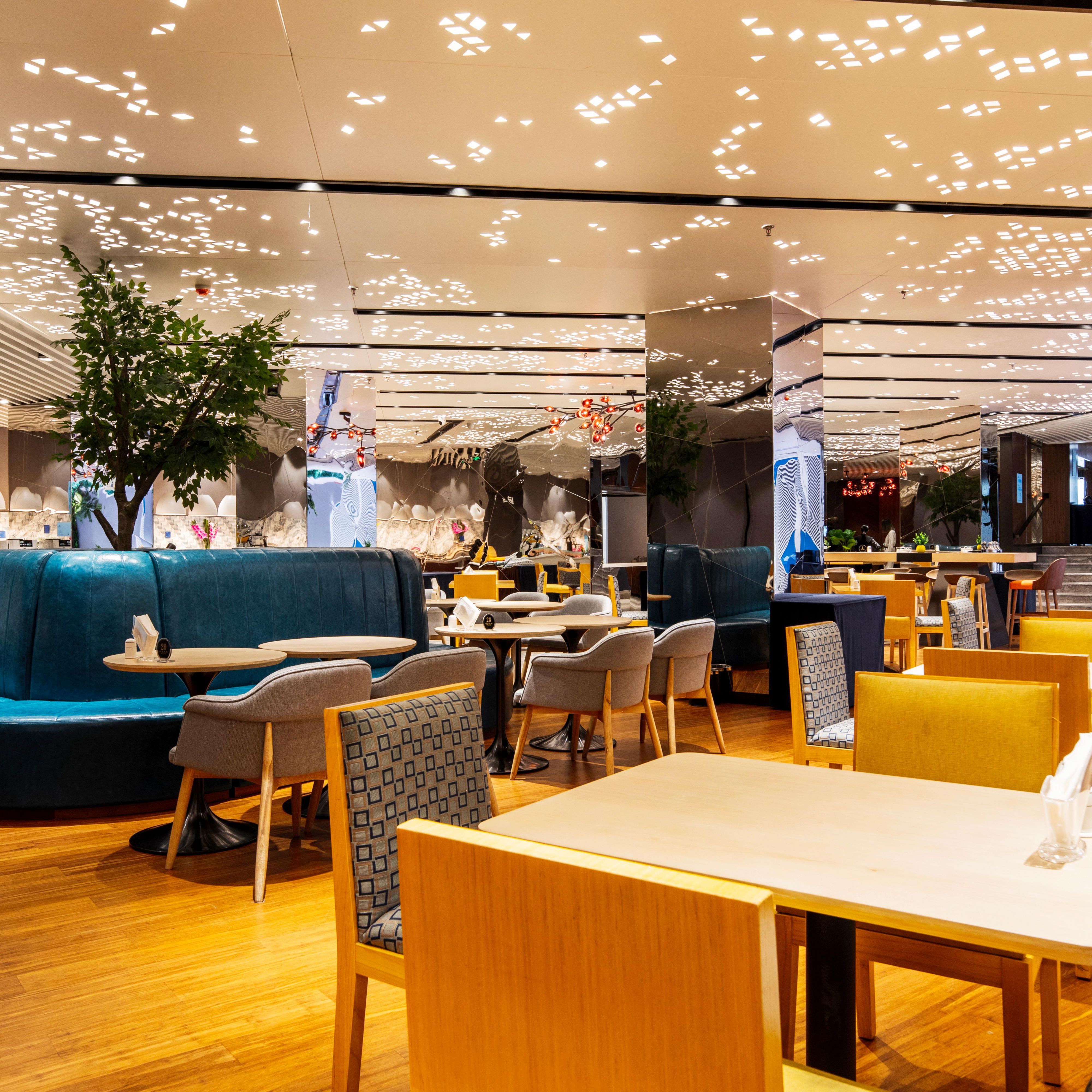 牛奶海餐厅位于酒店一层,能同时容纳300人就餐,餐厅还配备有投影仪和音响。