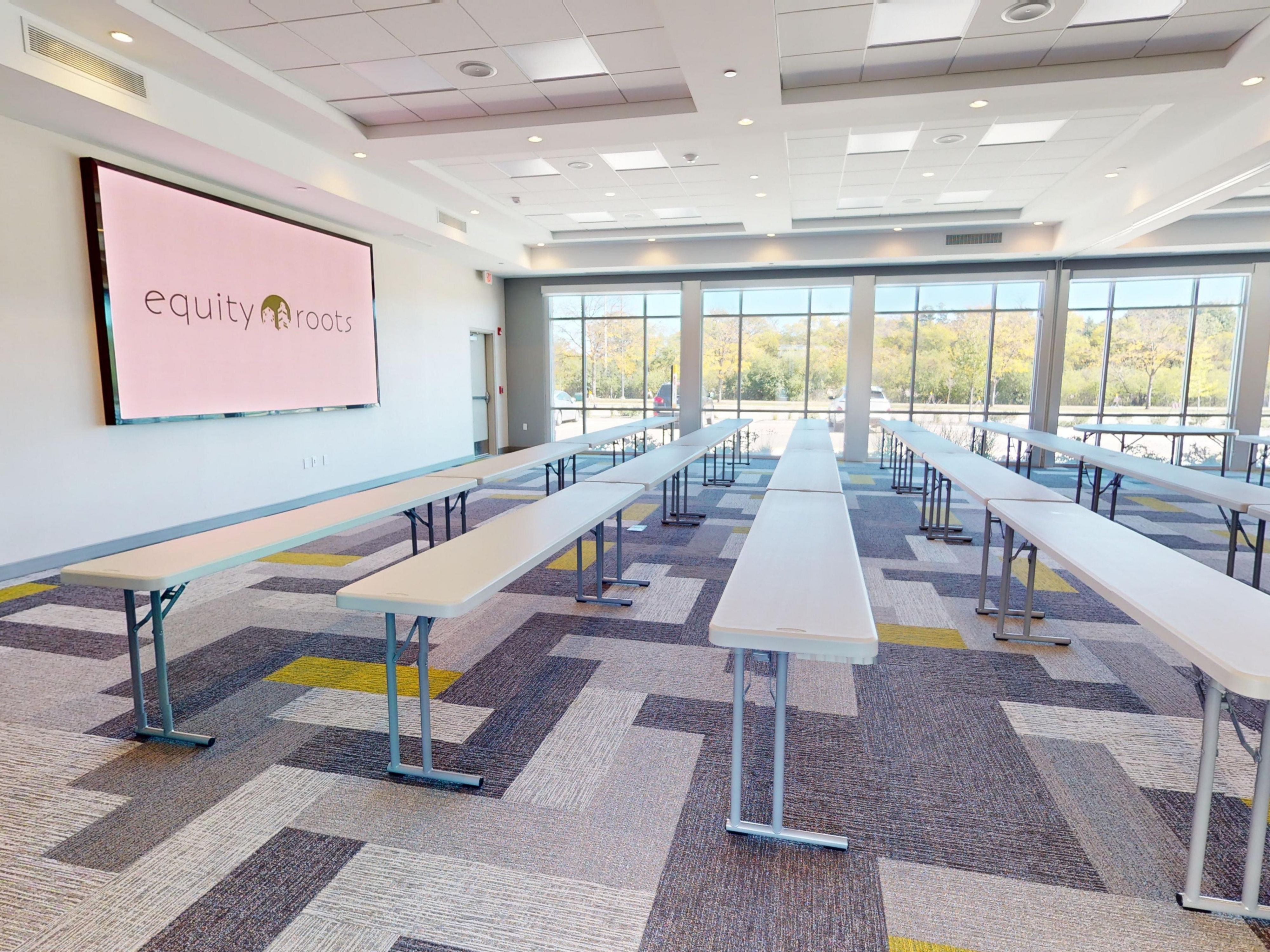 Shapra Hall is our largest meeting room at 3,000 square feet. It features three large display monitors, integrated audio, HDMI plugins, and 50 feet of linear windows for natural light, creating an inviting atmosphere for any event.
