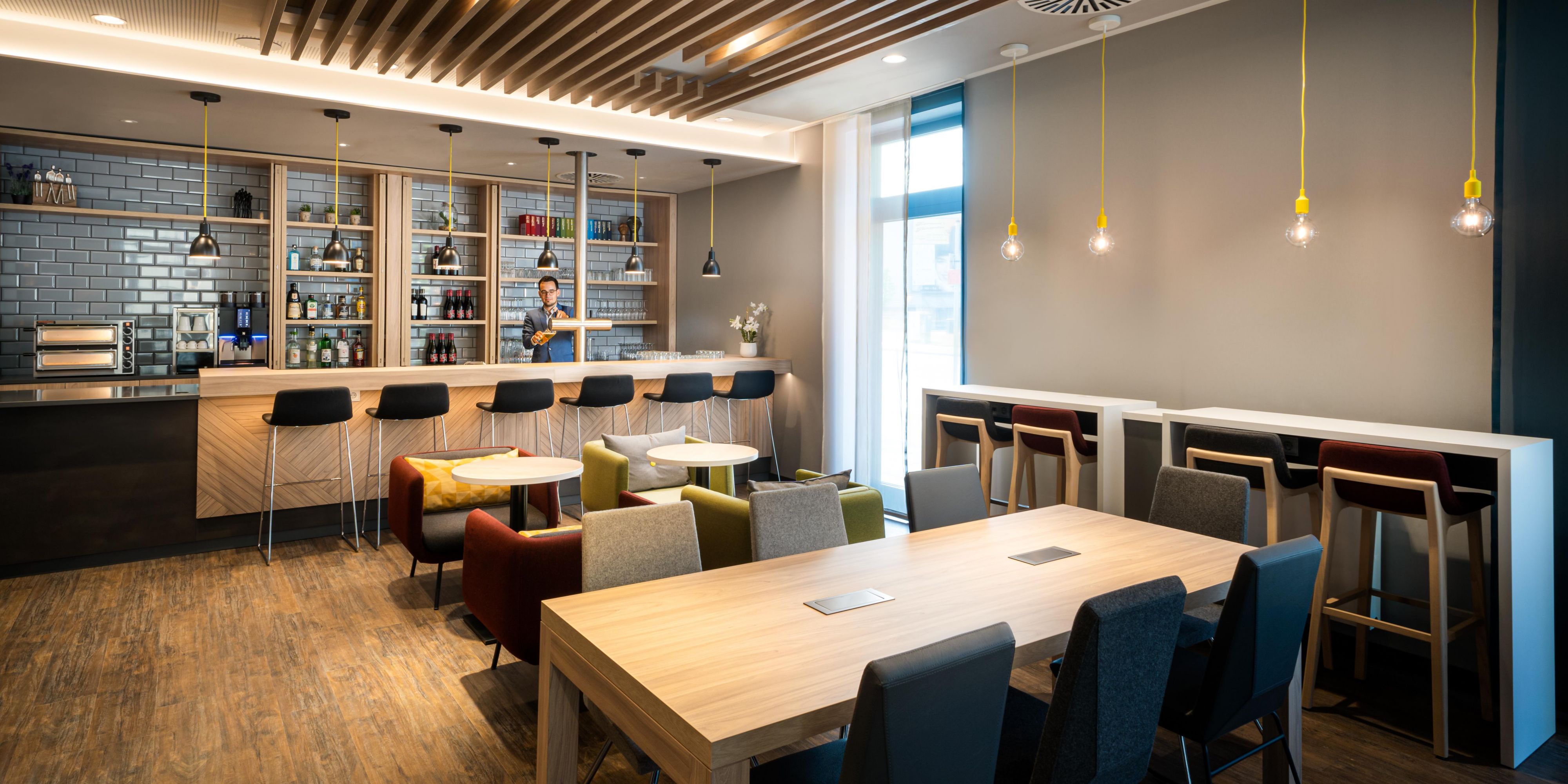 Hotel bars always have a special atmosphere. Whether alone or in company, they are a place to chill, to watch, to work. At the Express Café & Bar at the Holiday Inn Express Rosenheim, we want you to feel comfortable and taken care of at all times. When you want to call it a day after a business meeting, grab a pizza or other snack. Want to wrap up your explorations with a chat and a drink? Order a local beer or wine or lemonade. Unwind and then appreciate the proximity of your cozy room.