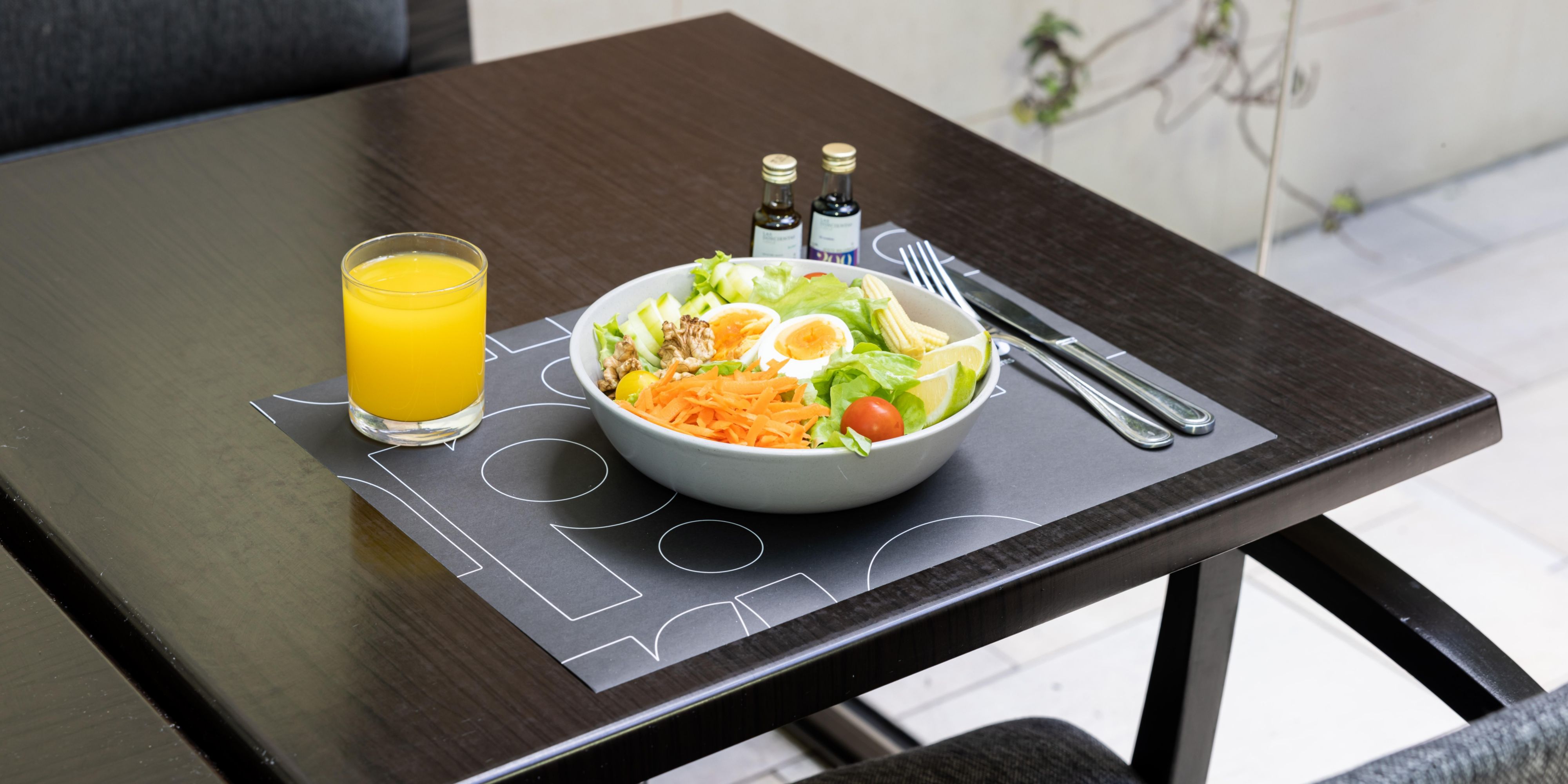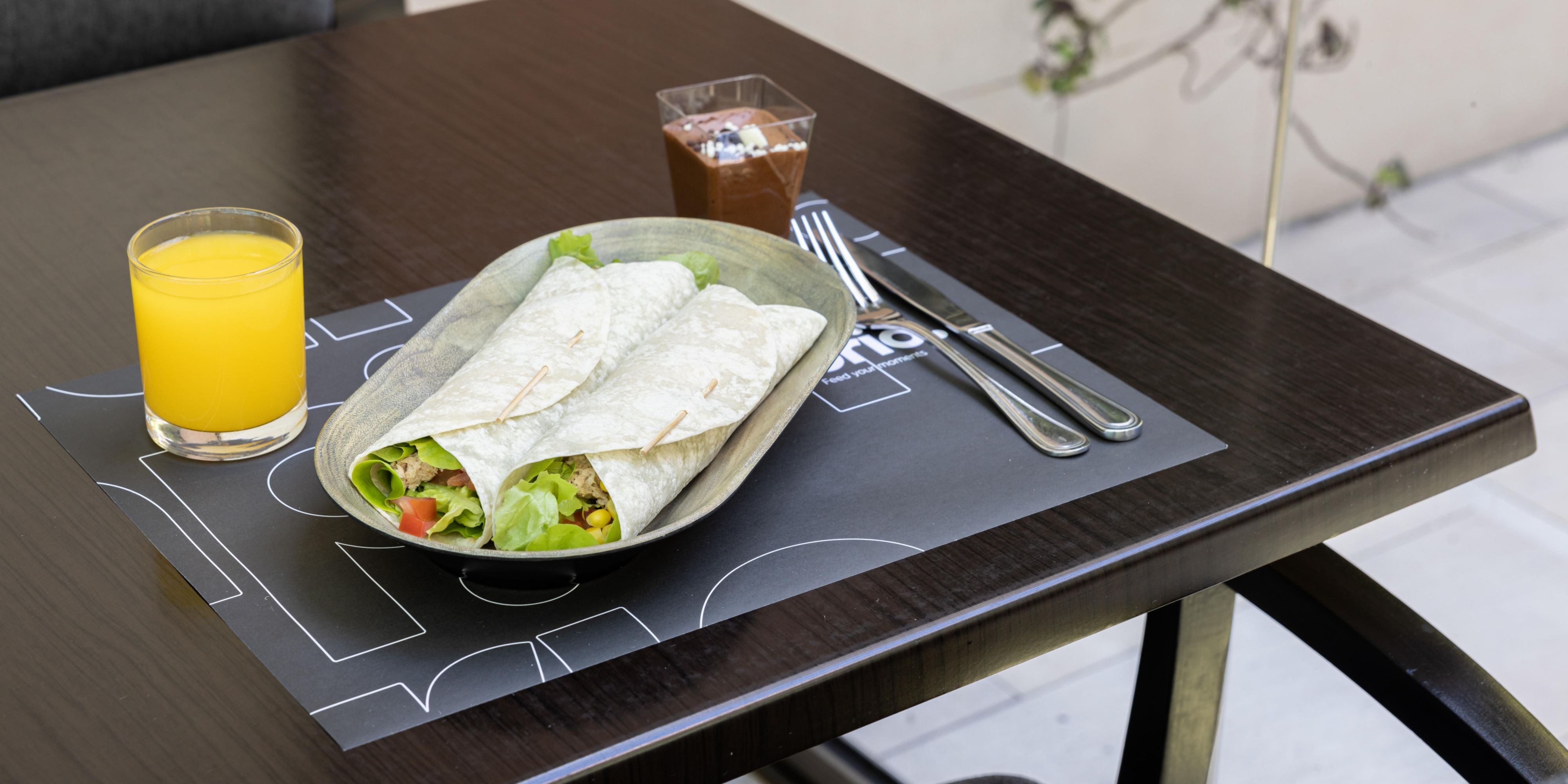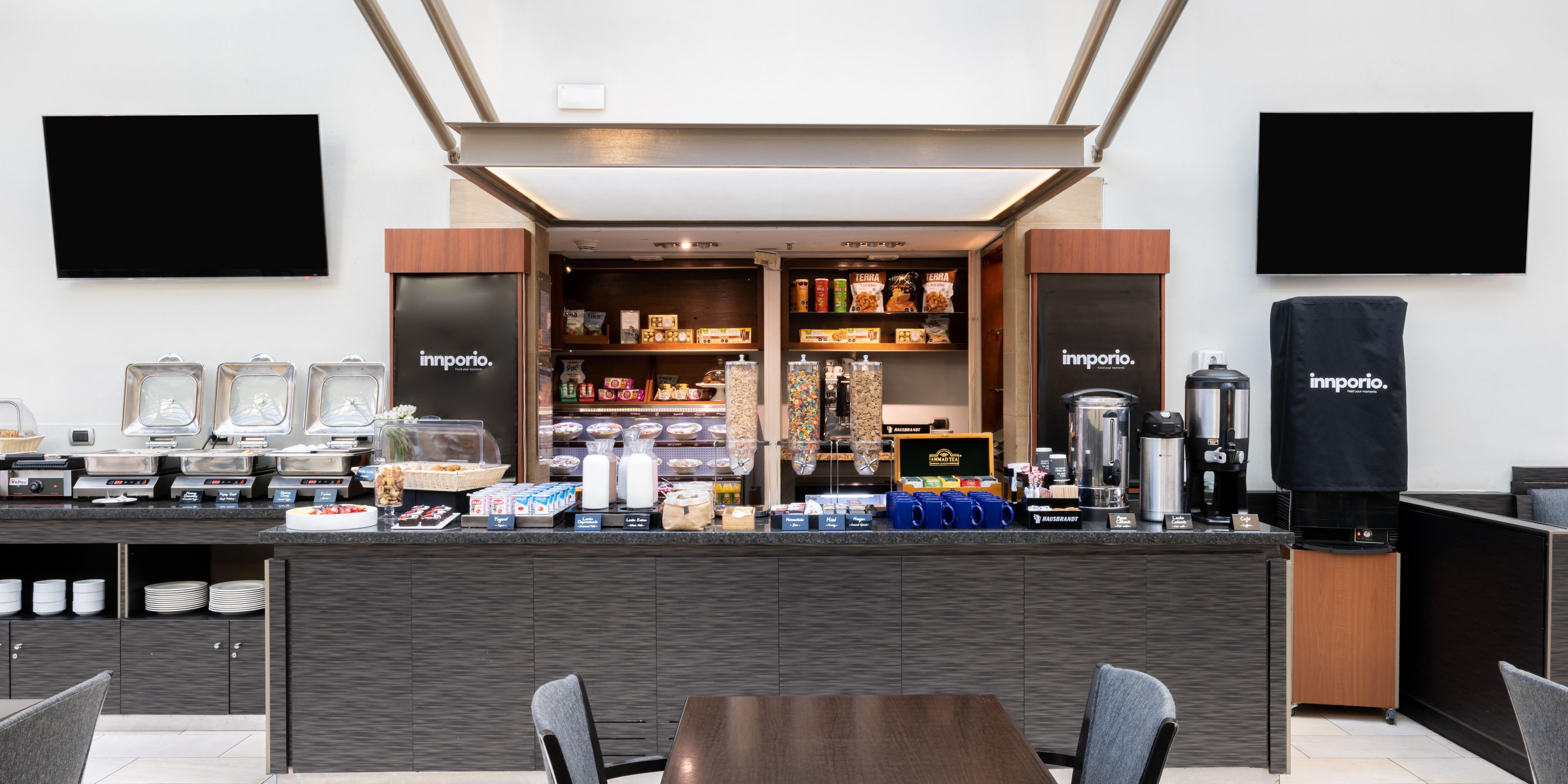 We have an Innporio with a lounge area. You can purchase snacks, drinks, salads, sandwiches, and fresh cooked meals and charge it to your room's bill.