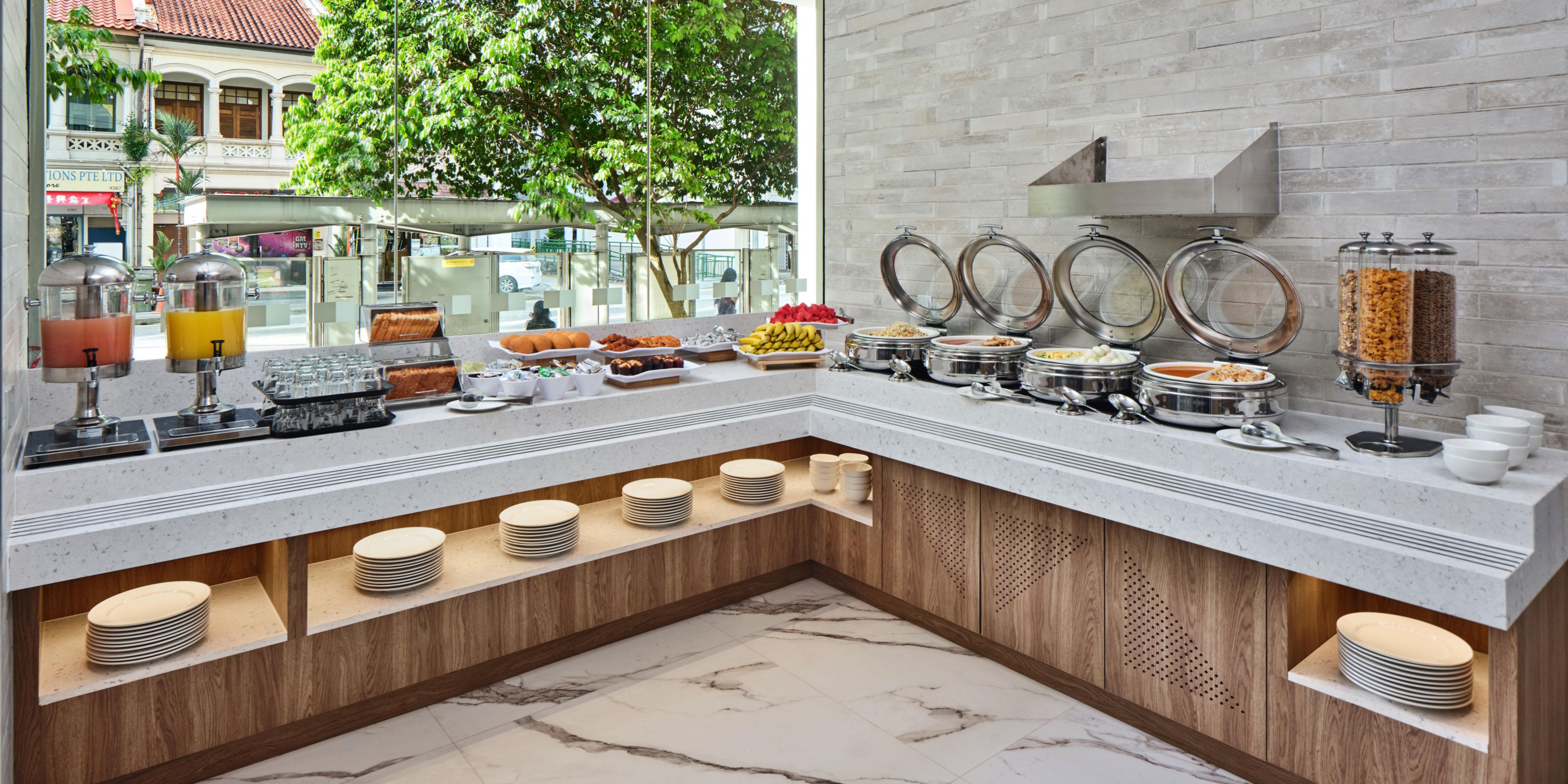A delicious free Express Start breakfast awaits you every morning at our Great Room at Lobby level, ready with fruits, cereal, pastries and up to five hot dishes, including eggs & sausage. In a hurry? Take your breakfast to go with our Grab and Go option.