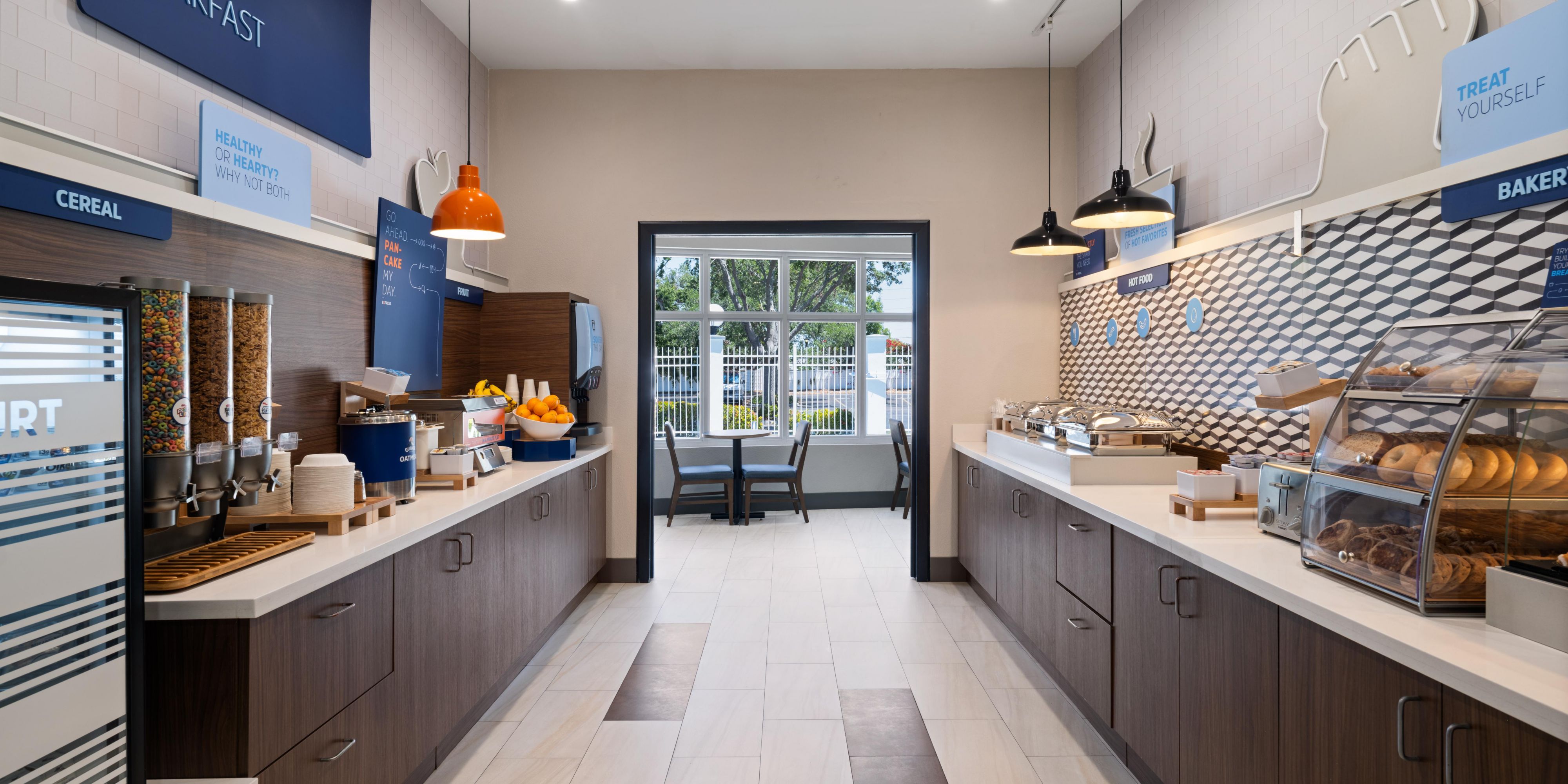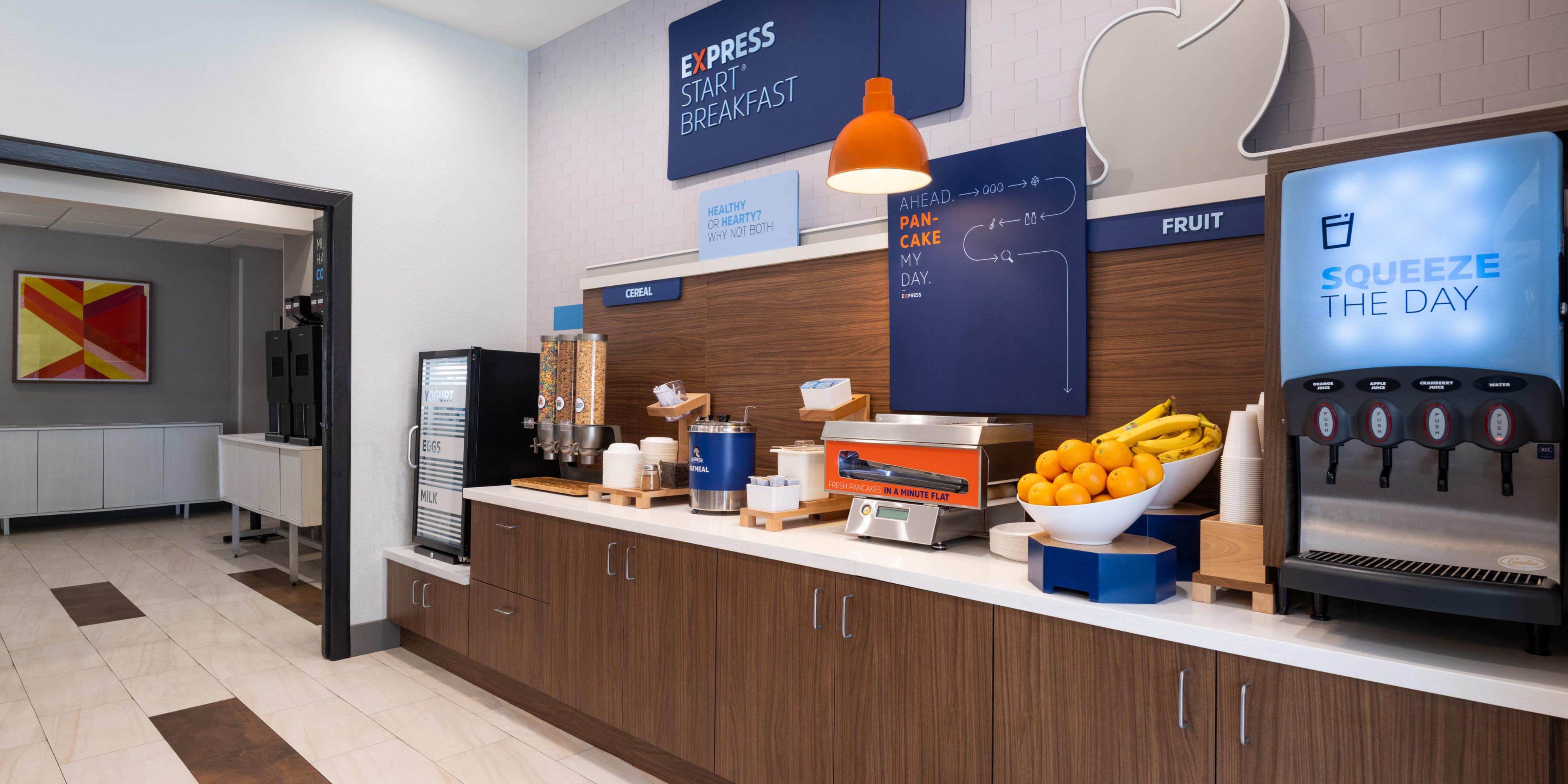 We offer a complimentary hot breakfast featuring our signature cinnamon rolls along with other delicious options. Weekday hours 6am-9:30am. Weekend hours 7am-10am.