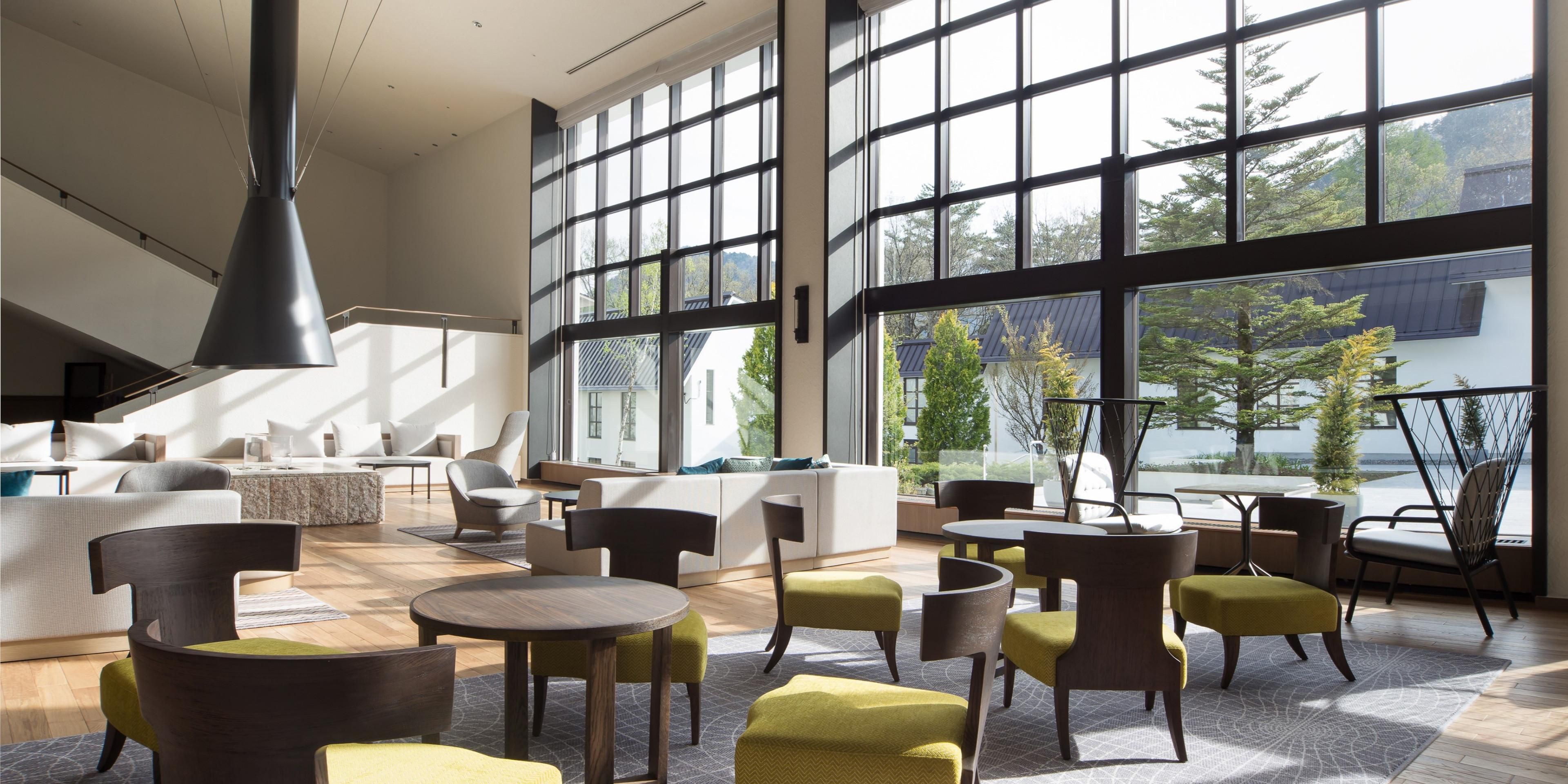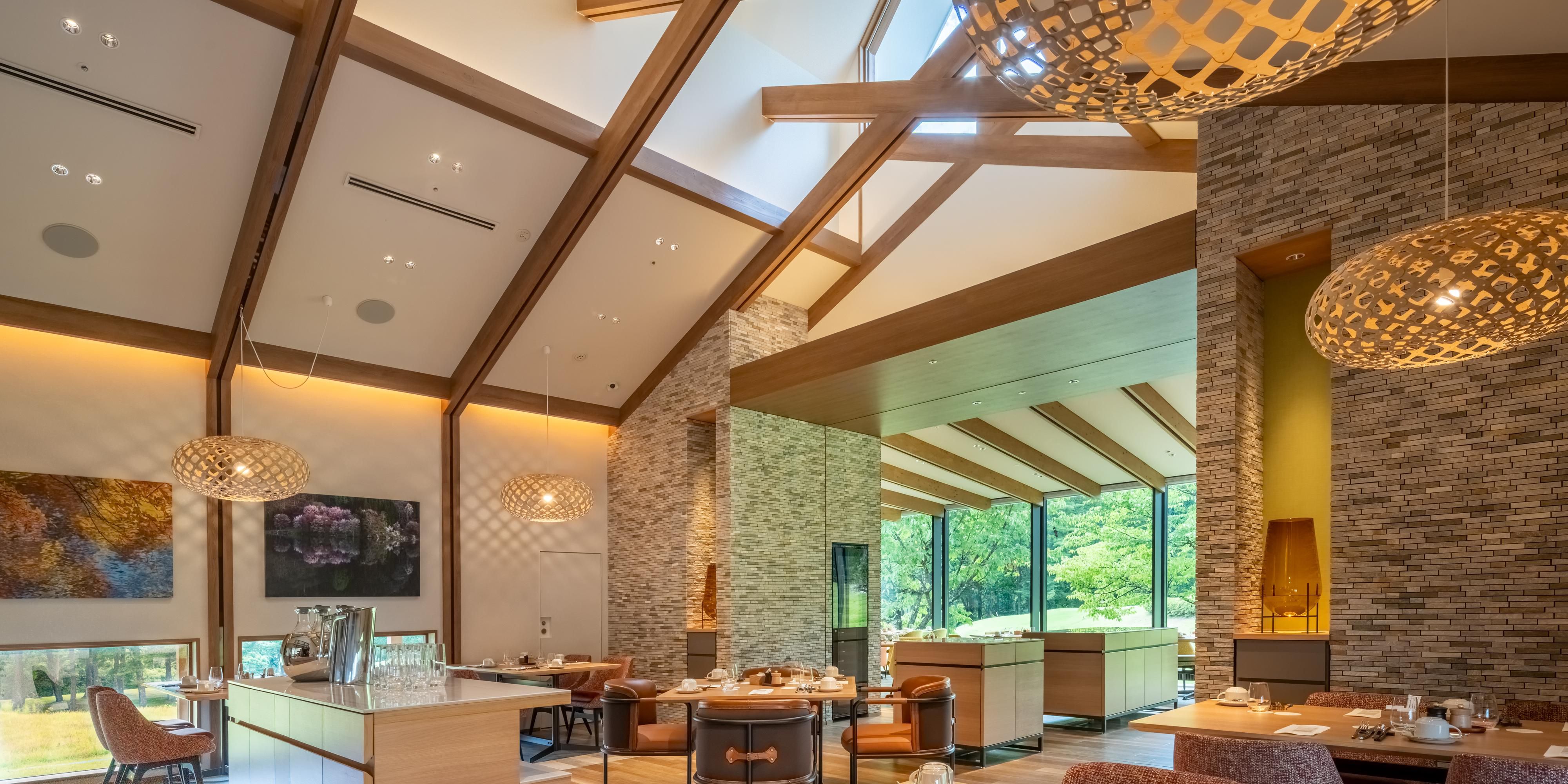 Hotels guests, golfers and walk-in customers can enjoy beer on tap as well as a selection of wines and sake at our log-cabin-inspired lobby café and bar furnished with low sofas around a cozy central fireplace.