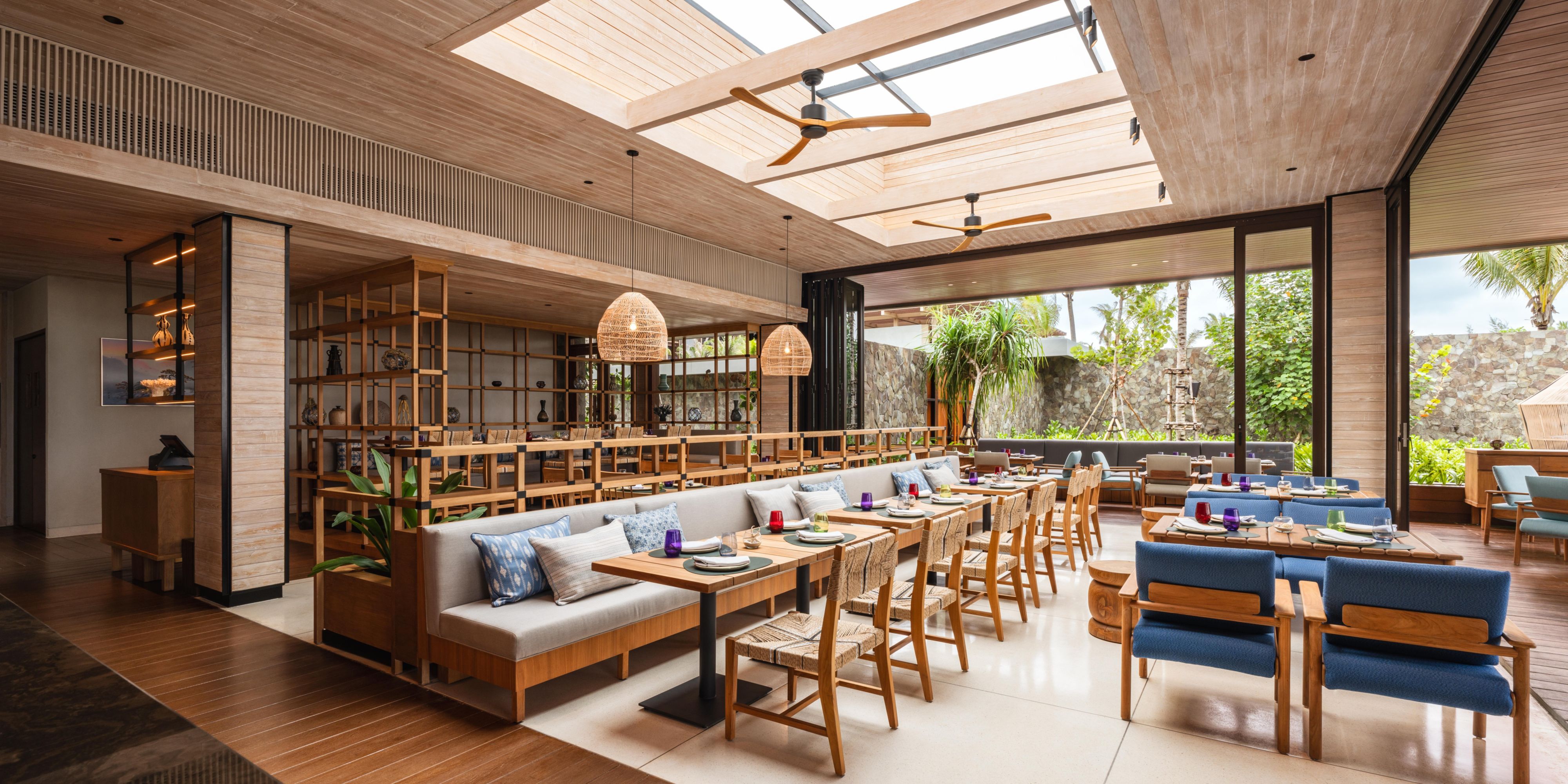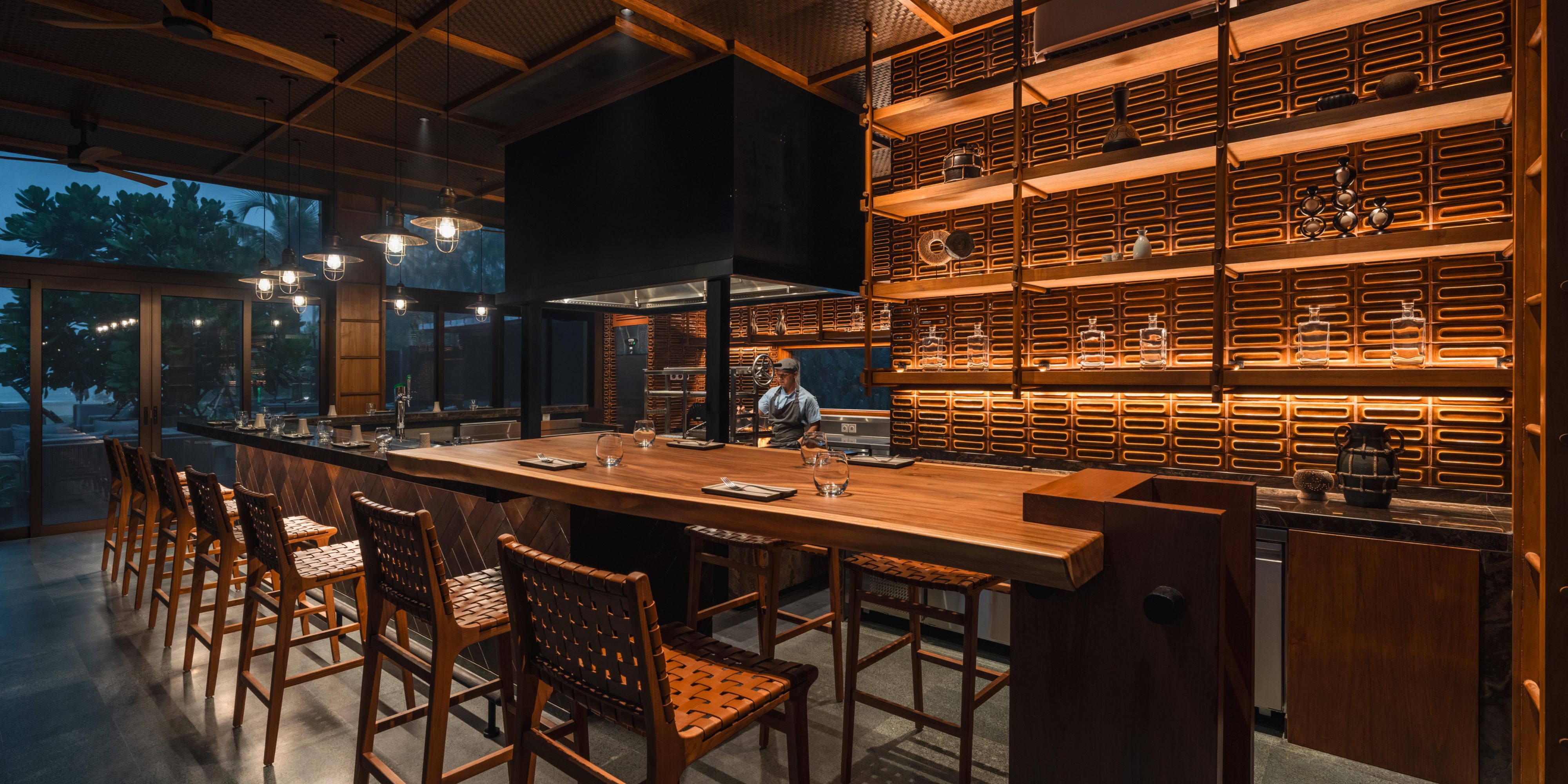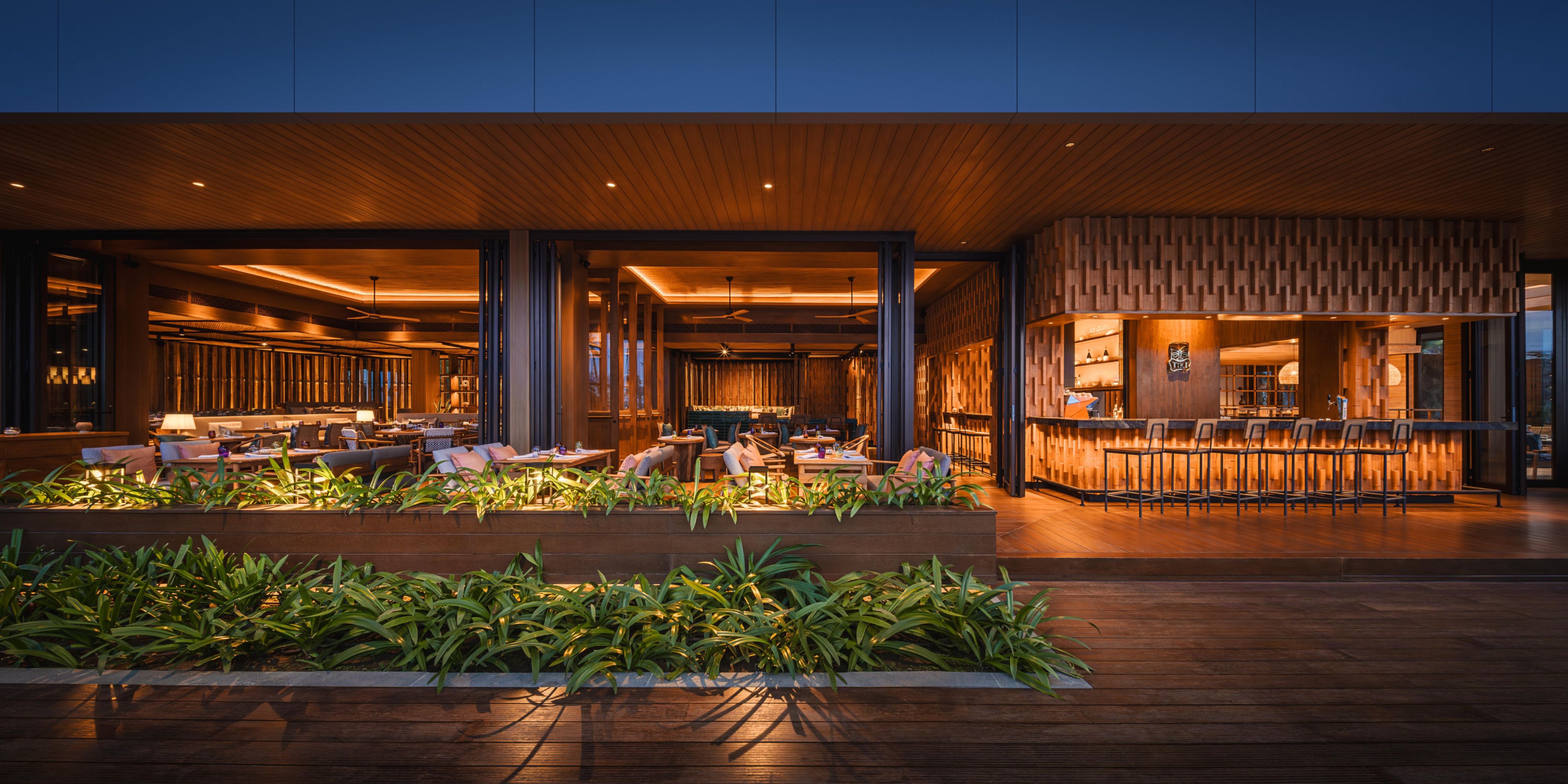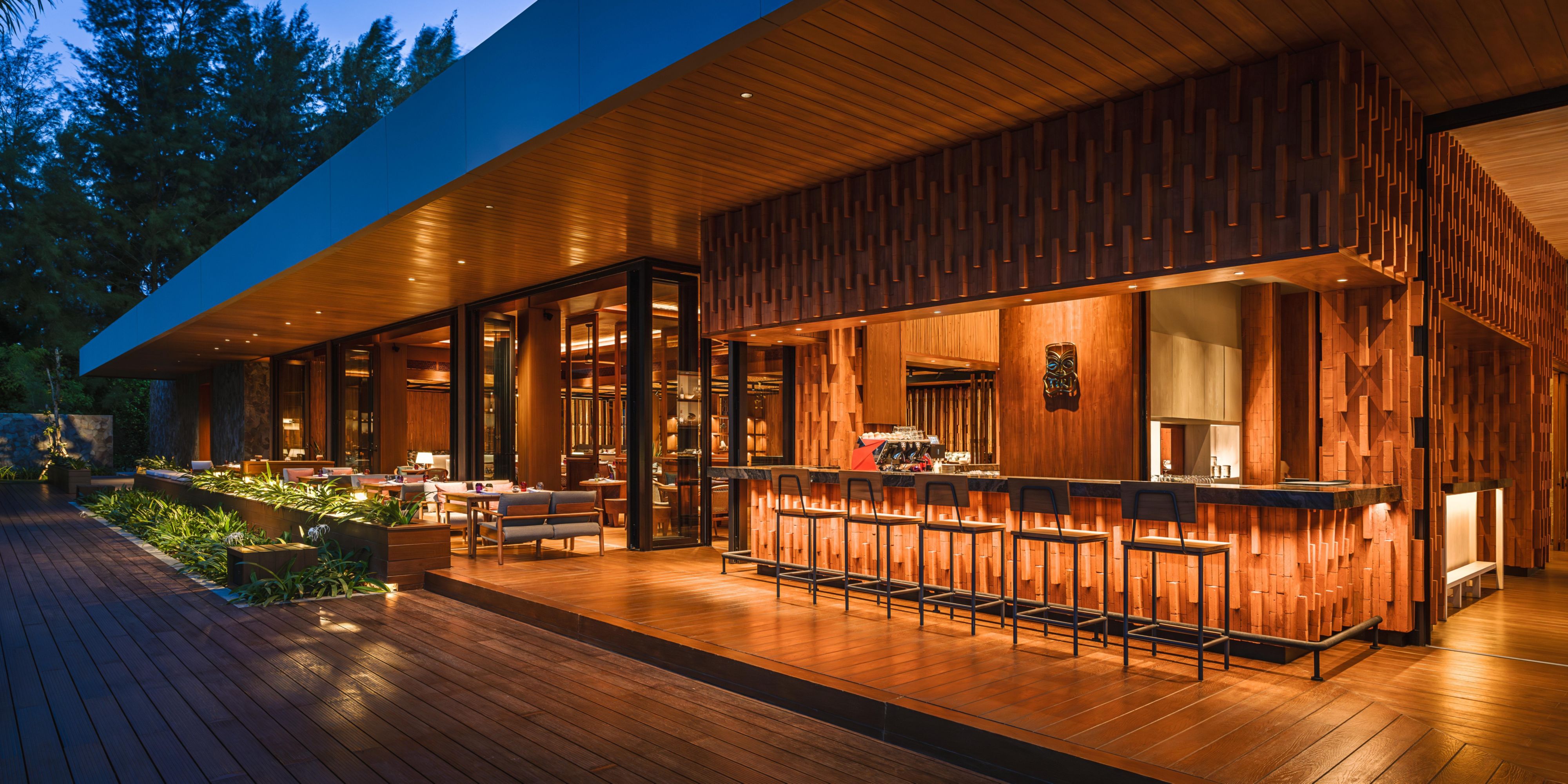 The Satay Bar acts as a flexible food venue that supports Tiki for lunch and evenings. The Satay bar will draw inspiration from local building techniques, materials and textiles to provide a sense of authenticity. Guests can come here to enjoy a meal and a cold drink while taking in the atmosphere and aroma created by the open flame cooking of Sate. The furniture of warm rustic wood, locally woven screens & textile patterns are earthy & textured, thus complimenting the fire & charcoal cooking.