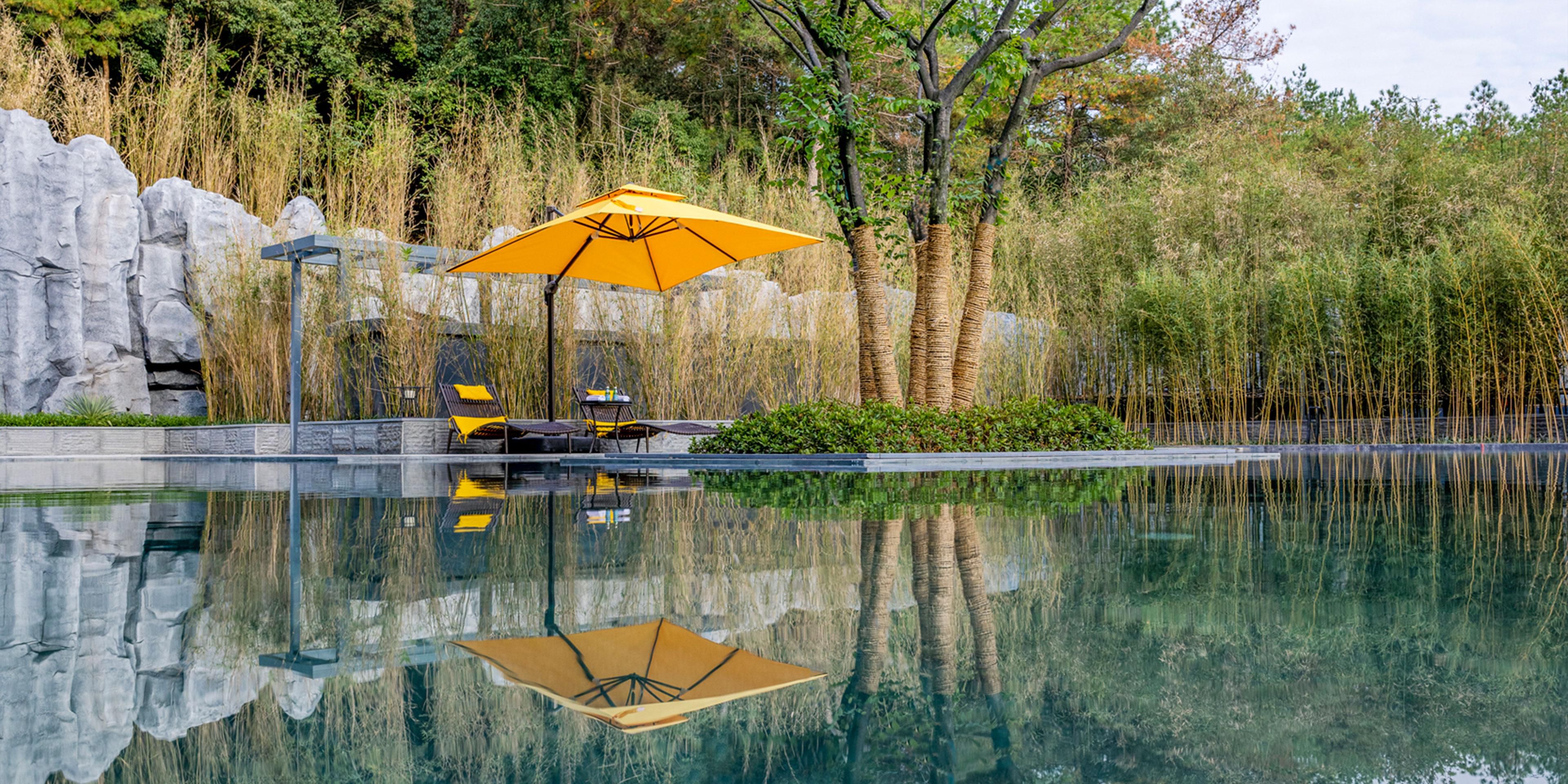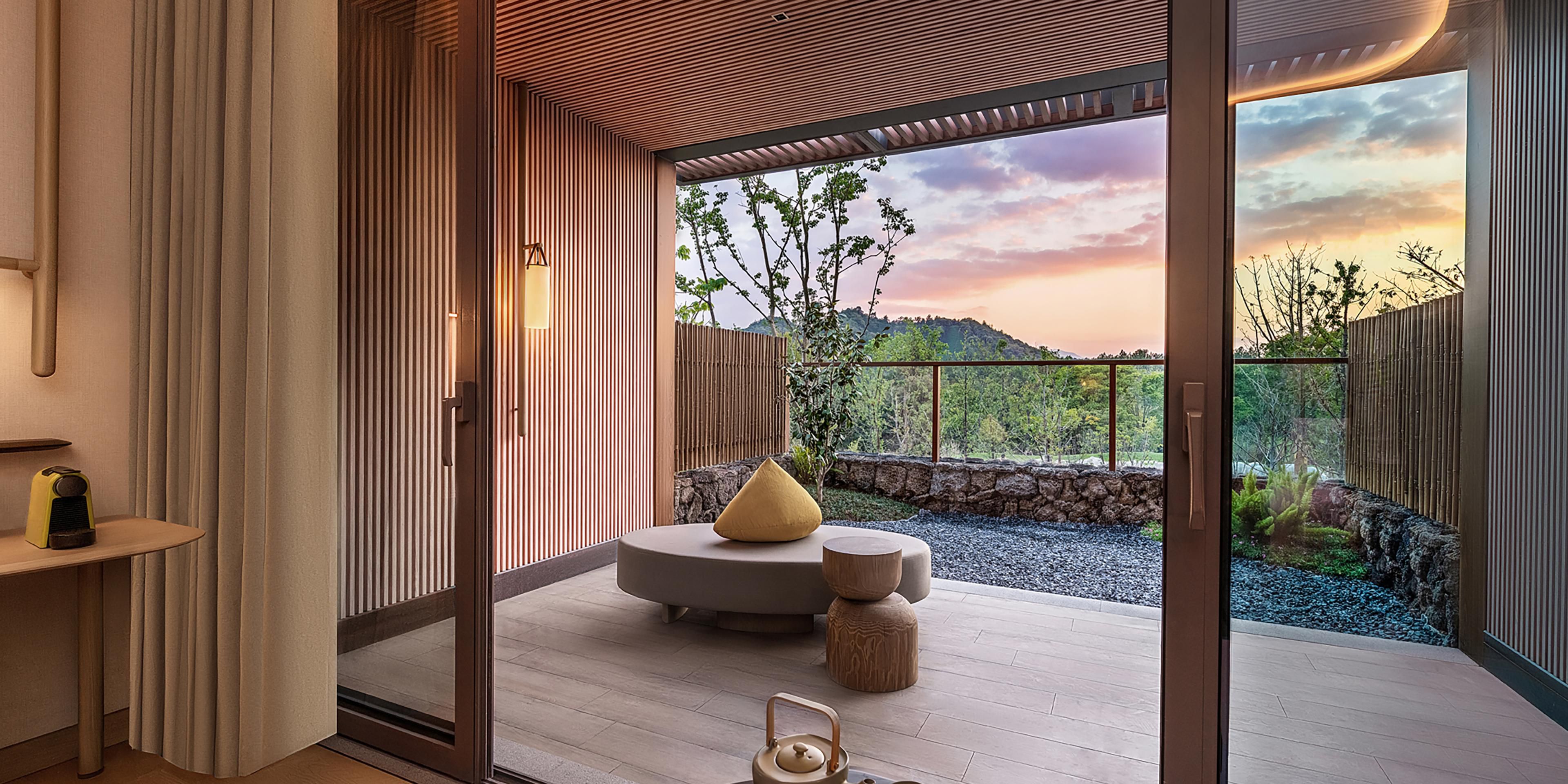 Upon entering the room, guests are welcomed with Anji local treats including white tea preserved plum, dried bamboo shoots slices, Anji white tea leaves, and a surprising set of mini bar drinks free of charge for the first ground each room night .