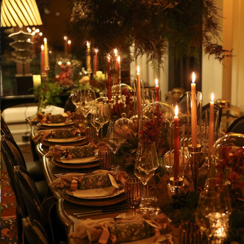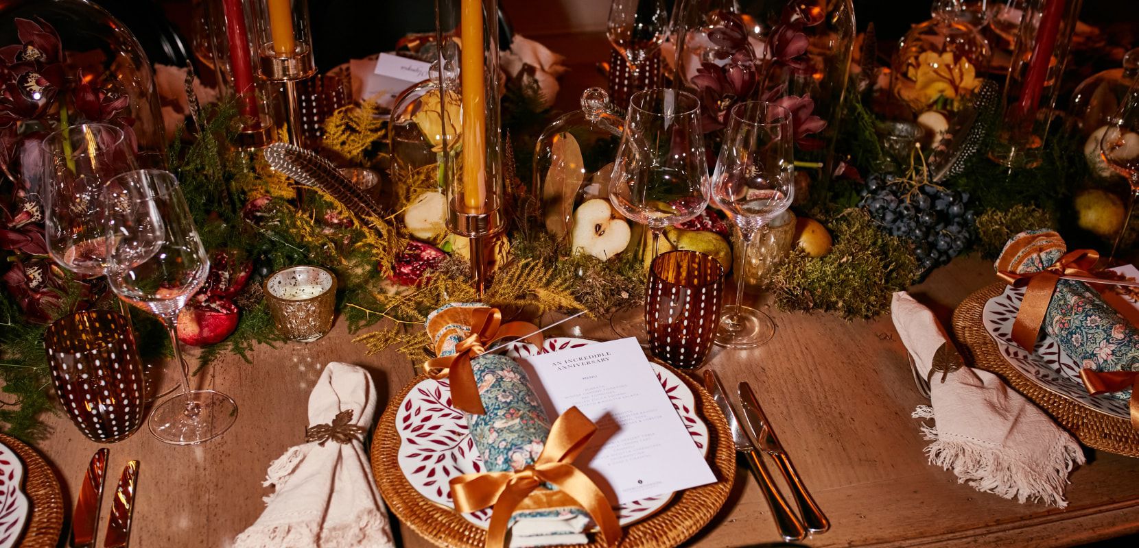 Through careful curation by InterContinental, the Apsley Suite was transformed into a scene inspired by English literature in a tribute to Della Vite's storied success. The table was adorned with seasonal arrangements of pheasant feathers, figs, foliage and orchard fruits, dressed in tumbling dark green ivy and lit by warm candlelight.