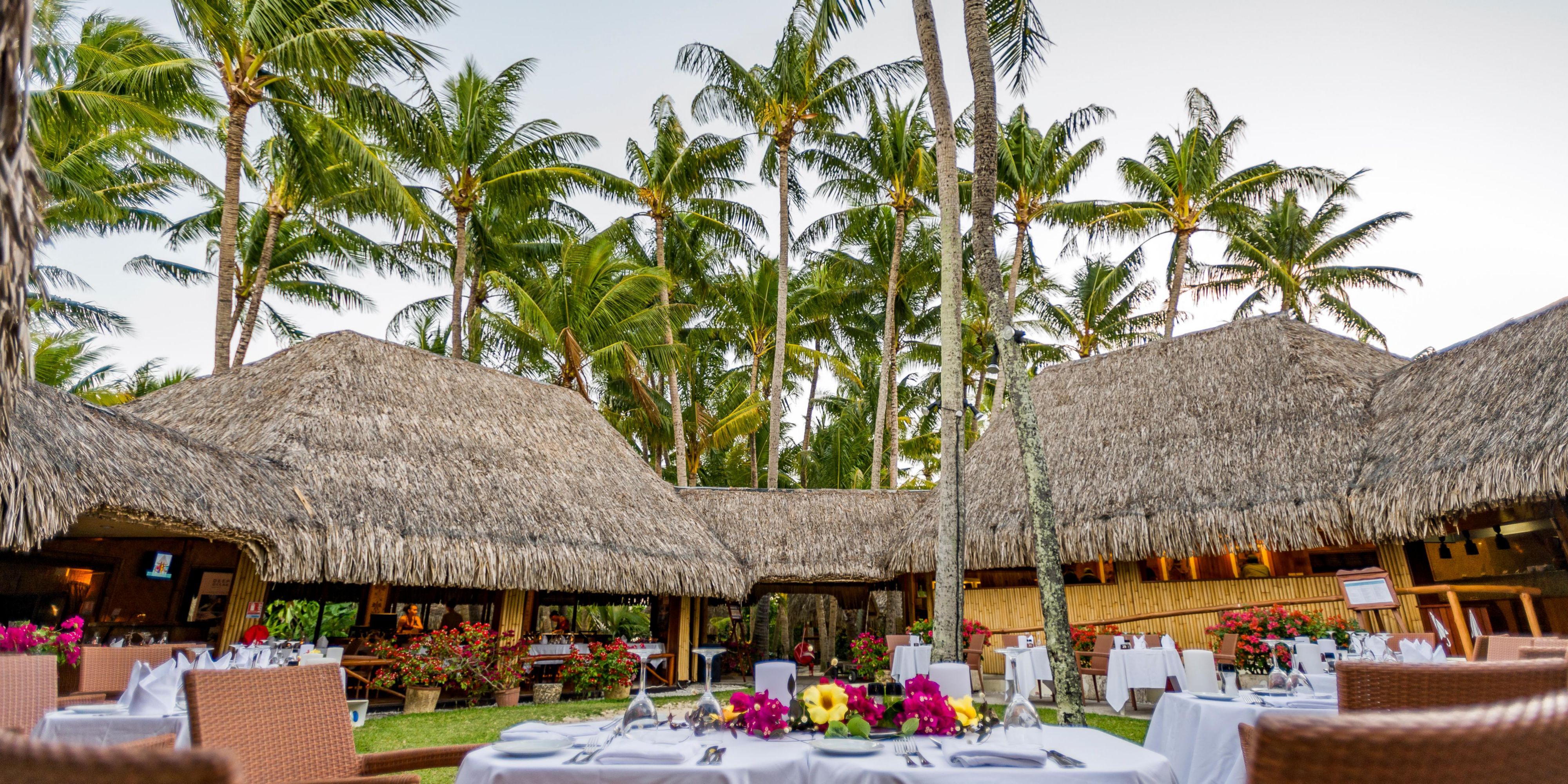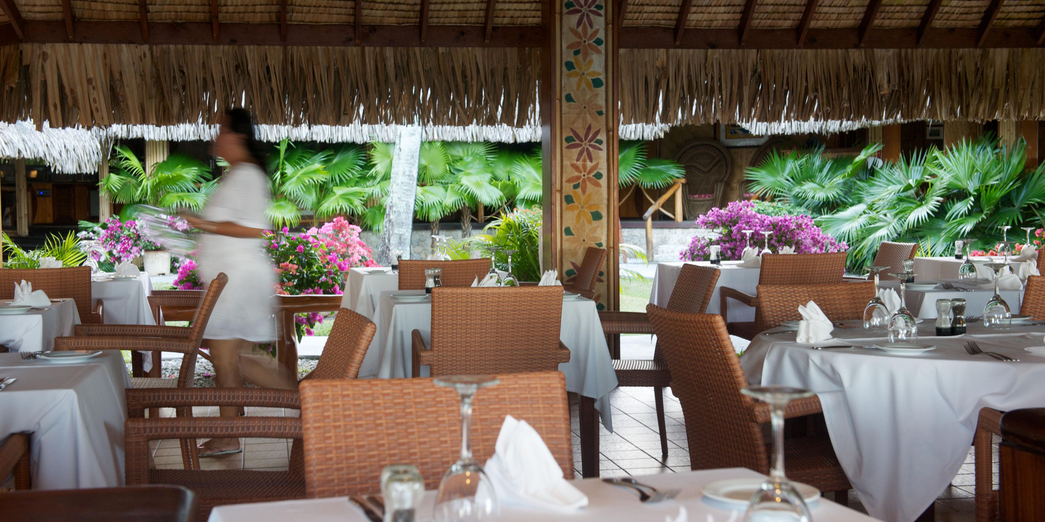 环境优雅的酒店主餐厅位于度假村建筑的中心,餐厅通向一个封闭式的庭院,下方的露台可欣赏到海滩和泻湖的美丽景观。 这里气氛闲适放松,装饰体现着波利尼西亚风格,设有室内和室外坐席。 餐厅庭院经过灯光照射,被打造成举行主题晚餐和热闹娱乐活动的中心。 Noa Noa 利用当地的料理美味和主厨的法式技艺,为宾客提供精品自助餐和点餐选择(供应早餐、午餐和晚餐)。