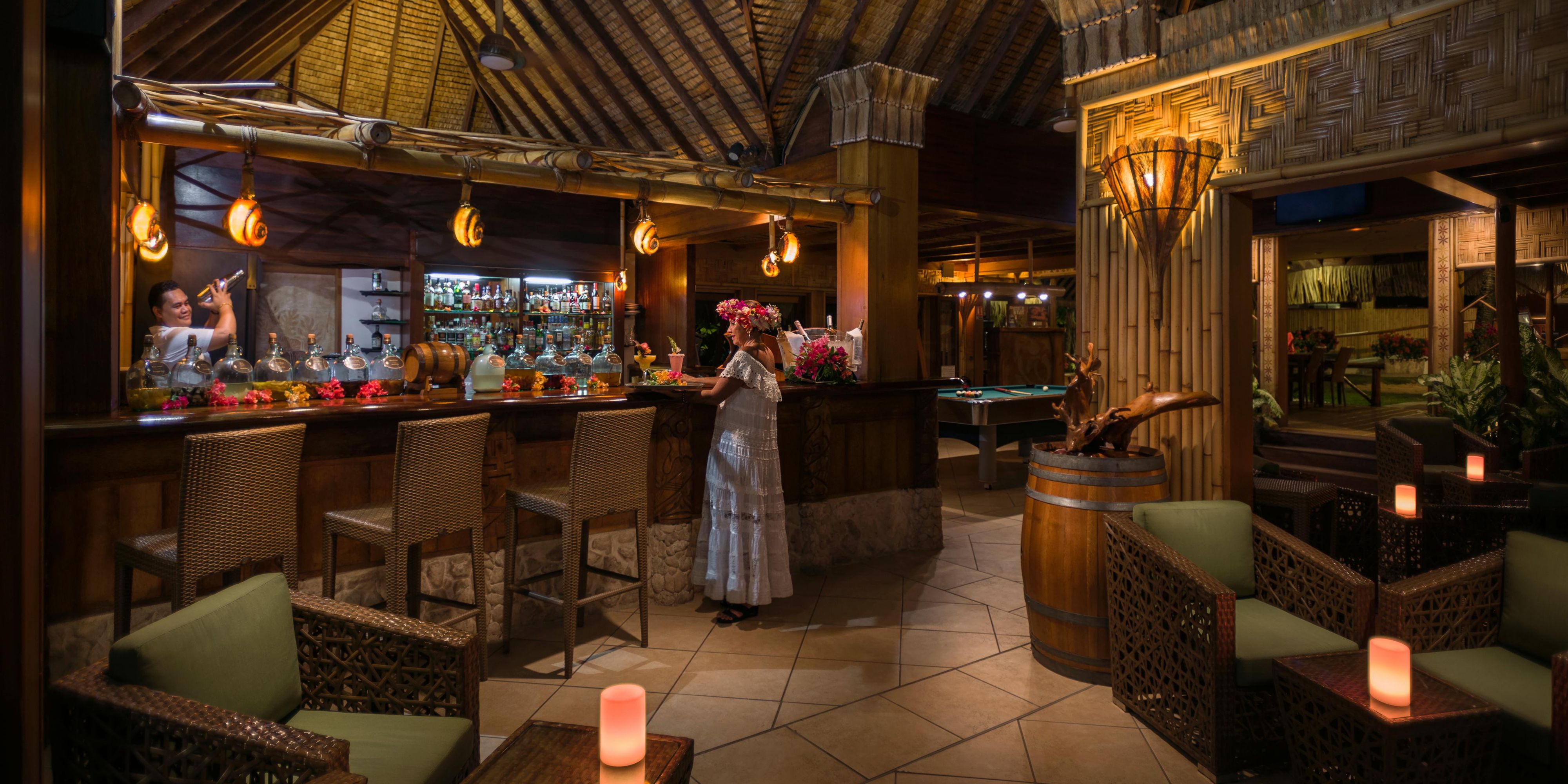 Under the shade of our majestic palm trees, Vini Vini Bar and Restaurant provides a cool retreat for all day snacks, frosty drinks or a casual lunch. Located near the pool in view of the white sand beach and the lagoon, this comfortable gathering place offers refreshers such as La Salad Fenua, made with Bora Bora hearts of palm, pineapple and fenua shrimp. Happy hour everyday from 5p.m. to 7 p.m.