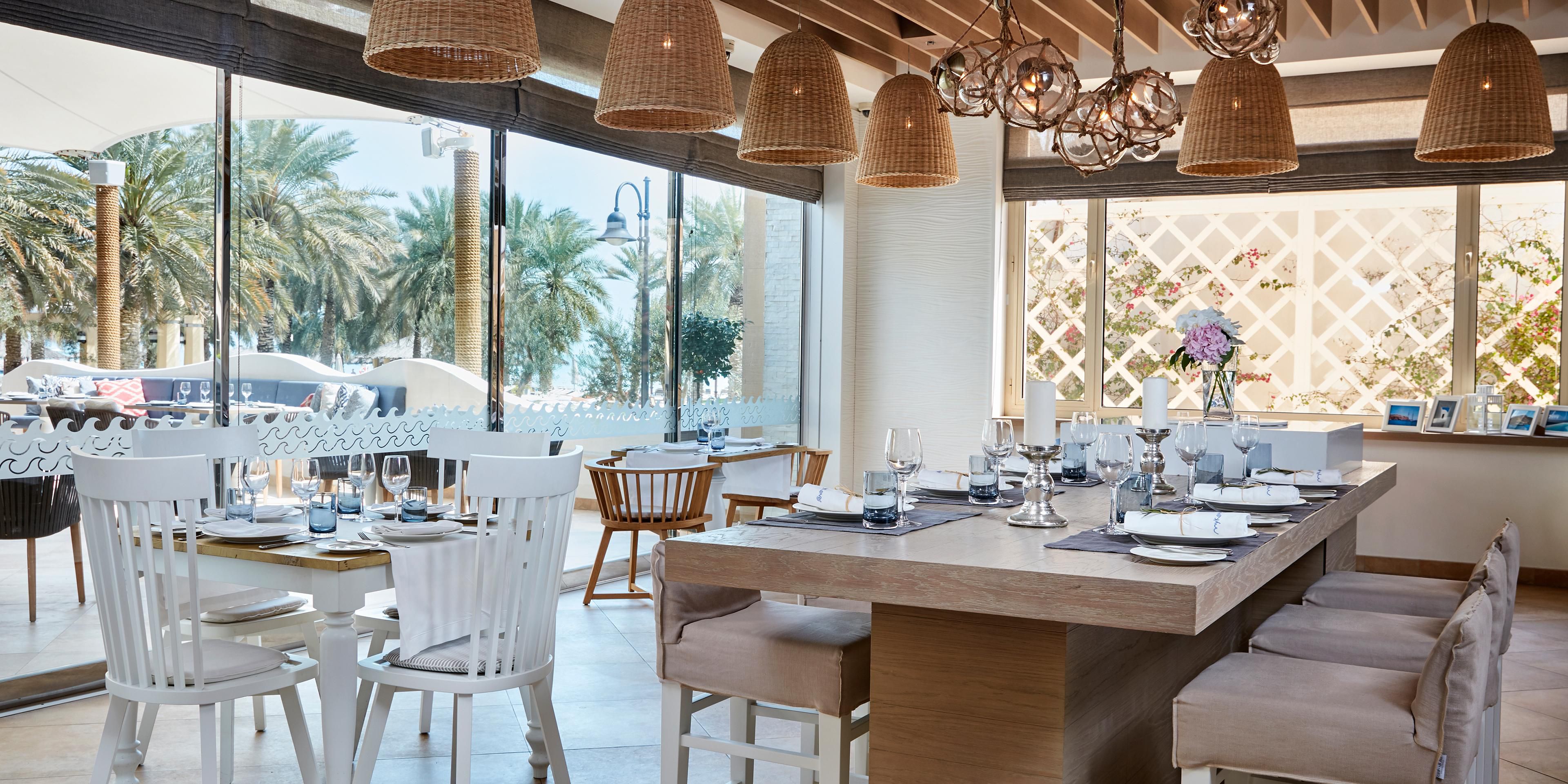 从Mykonos餐厅可欣赏到泳池和阿拉伯海的美景。 尝尝所有希腊与地中海的美味吧。 Mykonos餐厅是您一边放松,一边享受阳光、大海、精致佳肴与氛围,及其壮美的地理位置的绝佳地点。 品尝一下自助开胃菜,看着开放式厨房中热碳上的索瓦兰吉慢慢烤熟。 我们只选用最上等的食材,同时提供一系列精选希腊与地中海美酒。