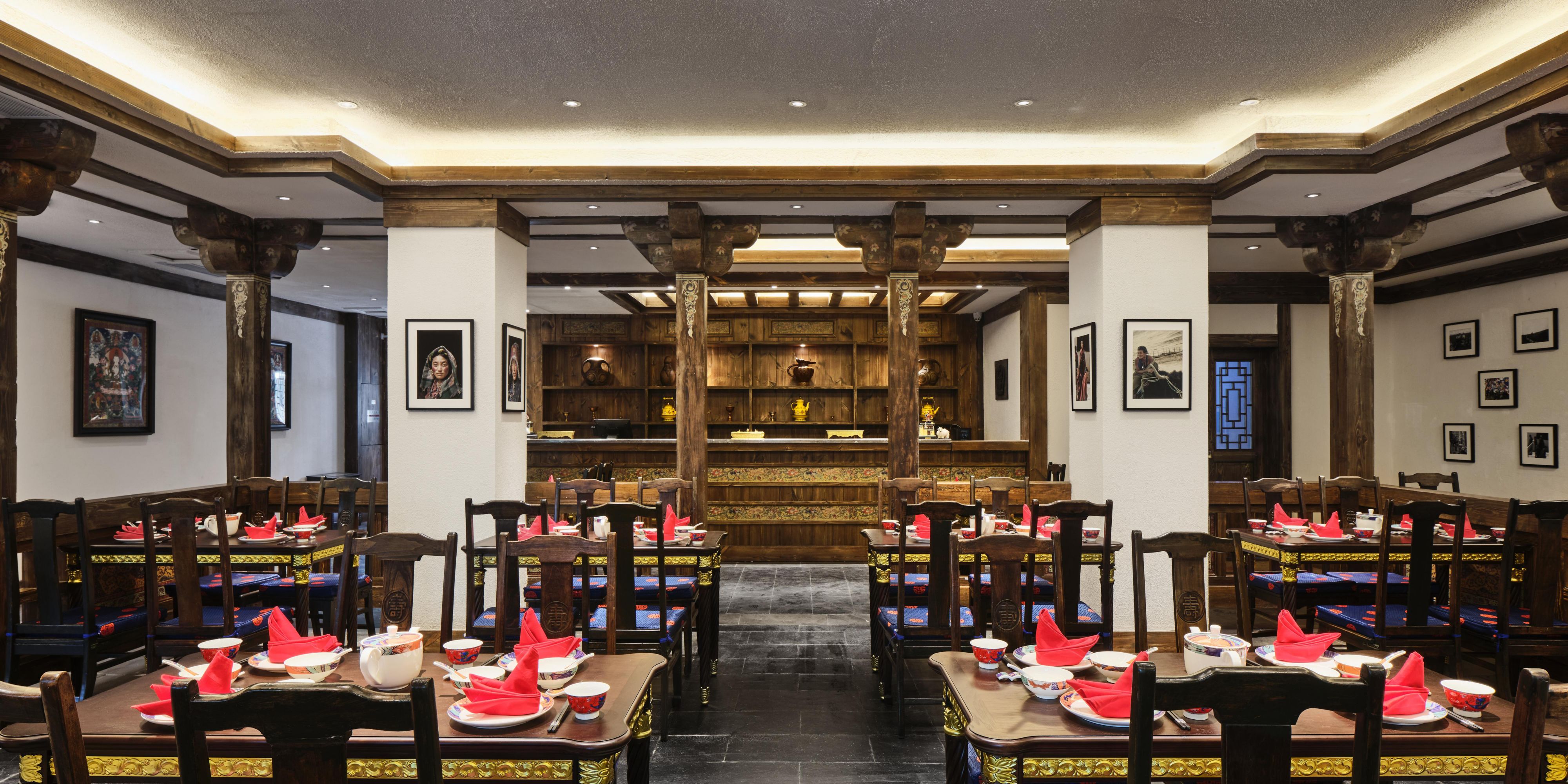 餐厅拥有3层就餐环境和两间贵宾间,可眺望白雪皑皑的远山。大厅配有舒适的休息区,适合与朋友一同分享的招牌藏式下午茶,精致的青稞点心。当夜幕低垂时,透过大厅玻璃穹顶,星河熠熠生光。于此品味小酌,卸下疲惫。餐厅提供种类丰富的酒单,包括各类进口葡萄酒,进口洋酒,青稞酒等及鲜味卤菜,冷淡杯,烧烤,每晚20:00-24:00更有藏式风情男女演唱,宾客亦可以加入进来,是一个让自己放松一下的好地方。