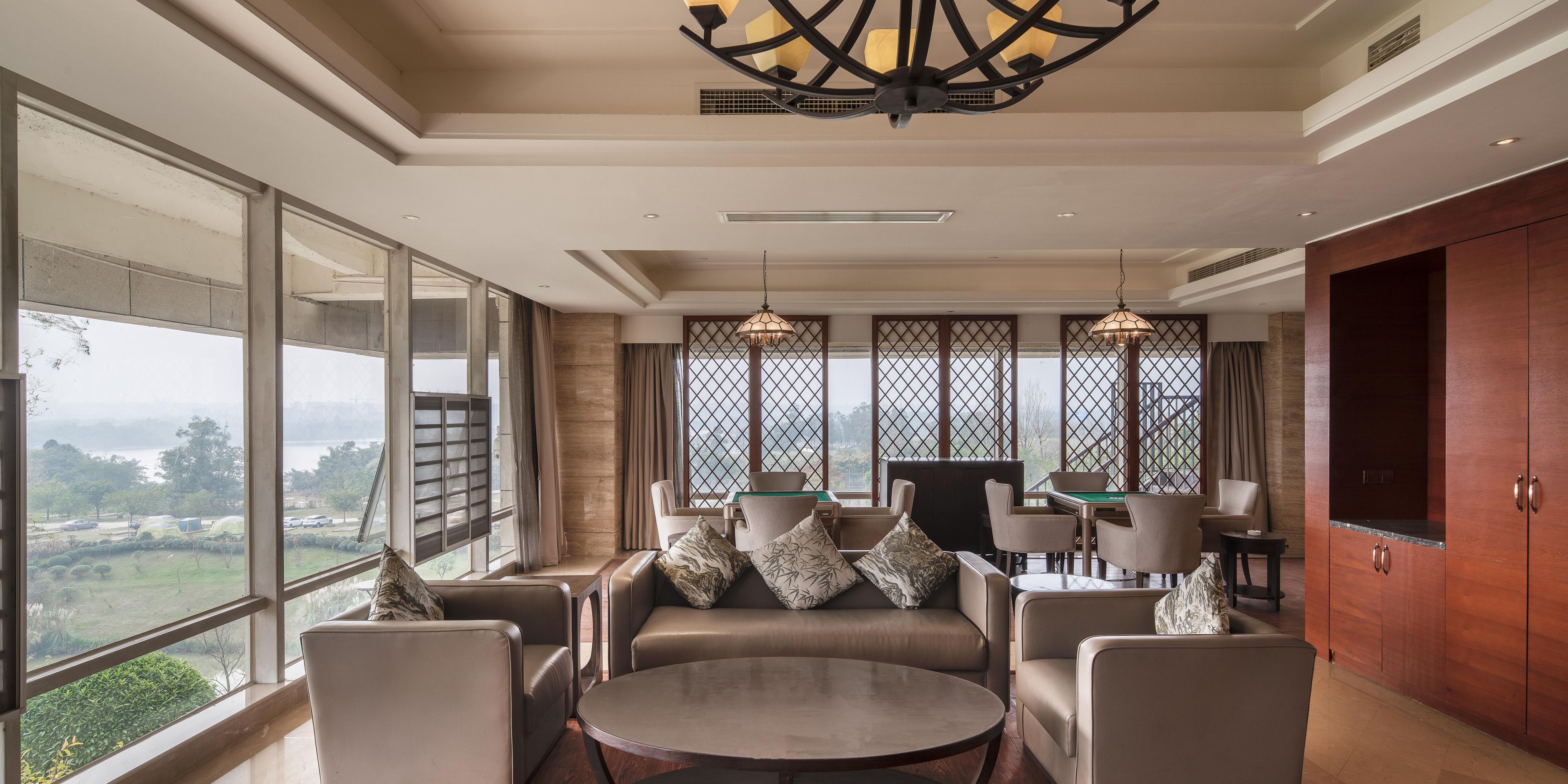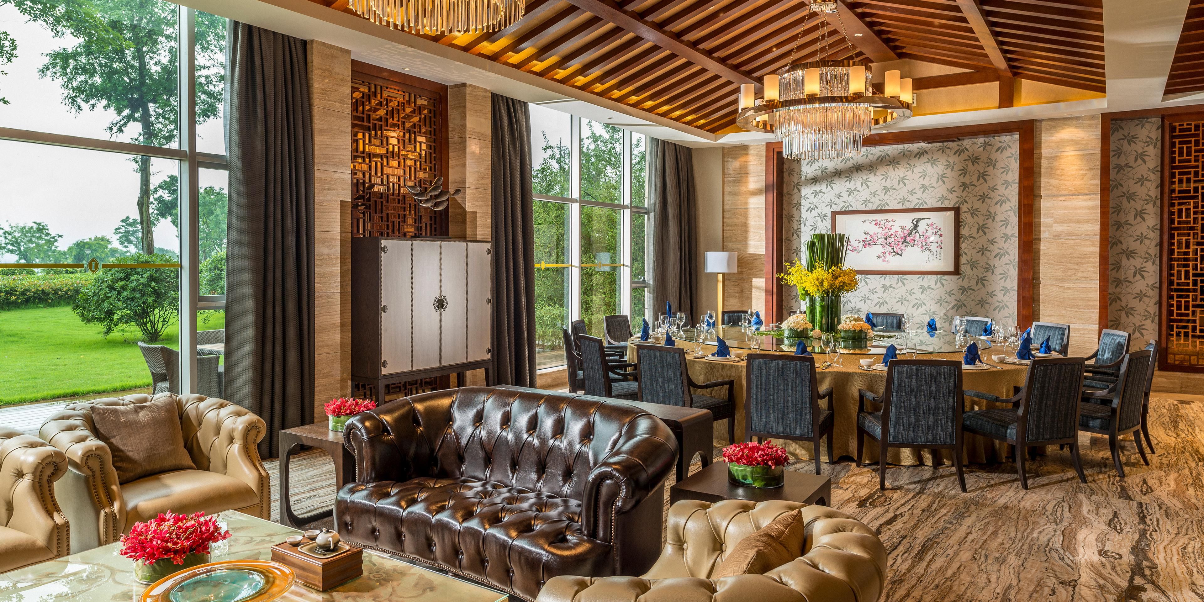 环境风格雅致、气氛怡人为您提供最地道的川式和广东菜肴。在次就餐可观赏黑龙滩迷人风光,尽享超乎想象的美味。12个中餐包间共可容纳160人。我们的主厨不仅善于在时令菜肴上创新,也力求菜肴的完美口感,让每一种挑剔口味都能得到满足。