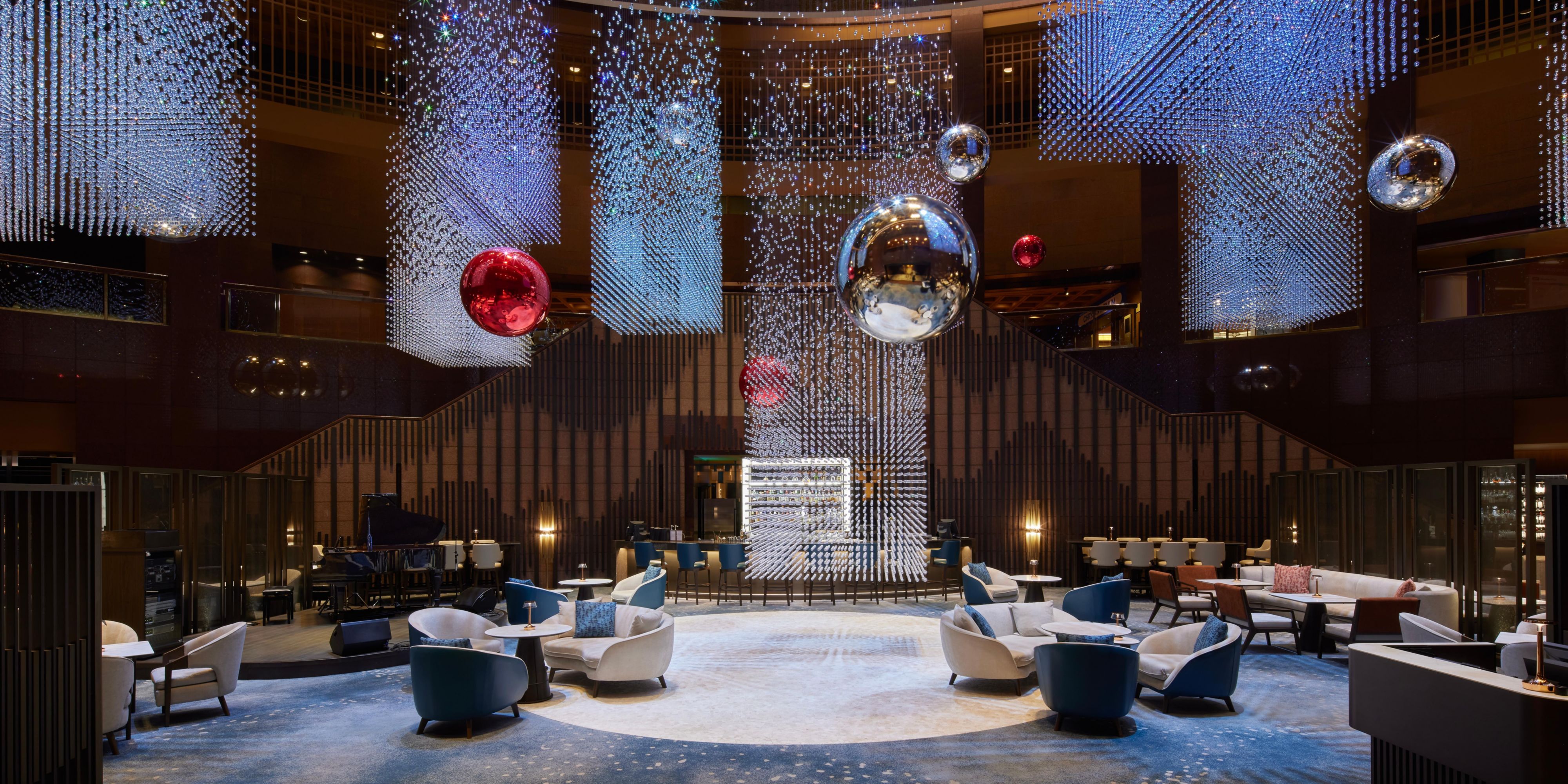 在精致现代的酒店标志性空间大堂酒廊和酒吧,请欣赏由世界著名装置艺术家Pahk Seon-Ghi的作品 《Column of Lights(光之柱)》为您带来耀眼的光之盛宴。由6万多个水晶珠组成的10根大型光柱,营造出彷佛银河从天花板倾泻而下的壮观景象,给人一种在空中水晶花园漫步的奇妙体验。